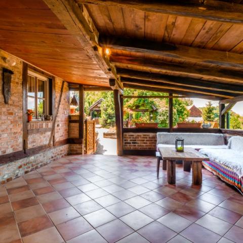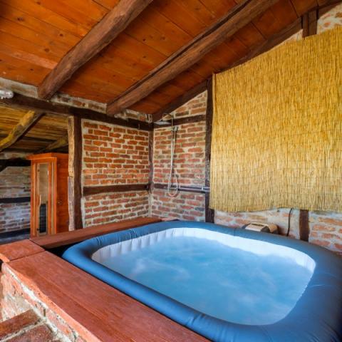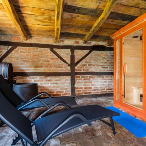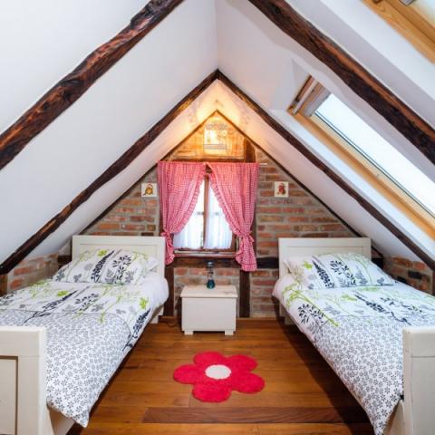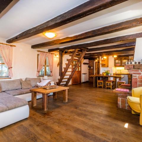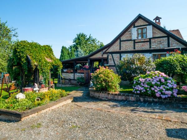 Dom zbudowany jest ze starego dębu i czerwonej cegły, odrestaurowany z wielką miłością i jest teraz doskonałym połączeniem tradycji i komfortu. Na poddaszu znajduje się otwarta przestrzeń z podwójnym łóżkiem i pokojem z dwoma mniejszymi łóżkami. Widoczne belki i cegły nadają szczególny urok. Przestronny parter składa się z kuchni, salonu, 1 sypialni i wspólnej łazienki. W centrum rezydencji znajduje się duży kominek, przed którym jest kątowe łóżko, które może służyć jako 2 dodatkowe łóżka. Oto telewizor i projektor. Mała, ręcznie robiona kuchnia zawiera wszystko, czego możesz potrzebować: talerz do gotowania, danie, zmywarkę, czajnik i sztućce, miski i garnki. Niektóre zapasy, takie jak sól, pieprz, mąka, ryż, olej ... zawsze cię przyjmą. Za sypialnią jest podwójne łóżko i wspólna łazienka z kabiną prysznicową, pralką i suszarką. Połączony z domem przestronny taras z dużym stołem, ławkami i grillowanym grillem. Przestronny ogród, huśtawki, mały sad to tylko niektóre z zewnętrznych treści.