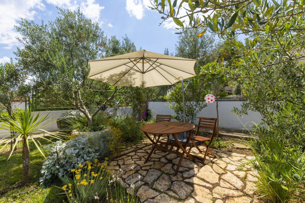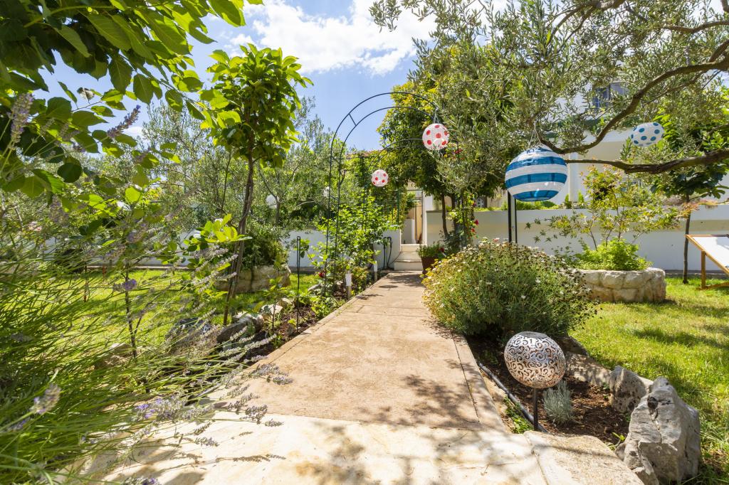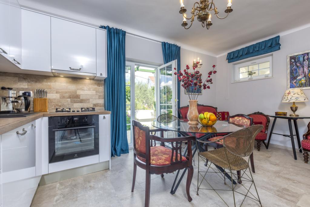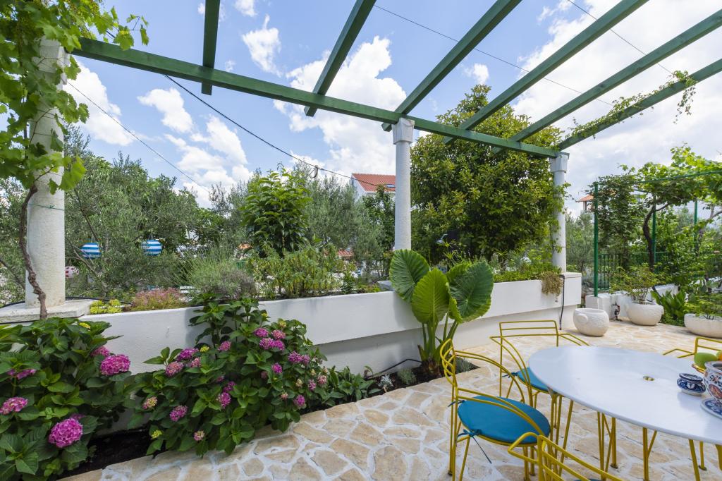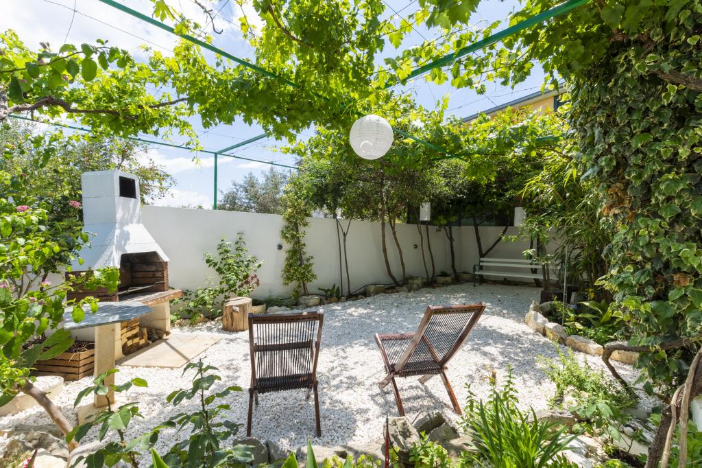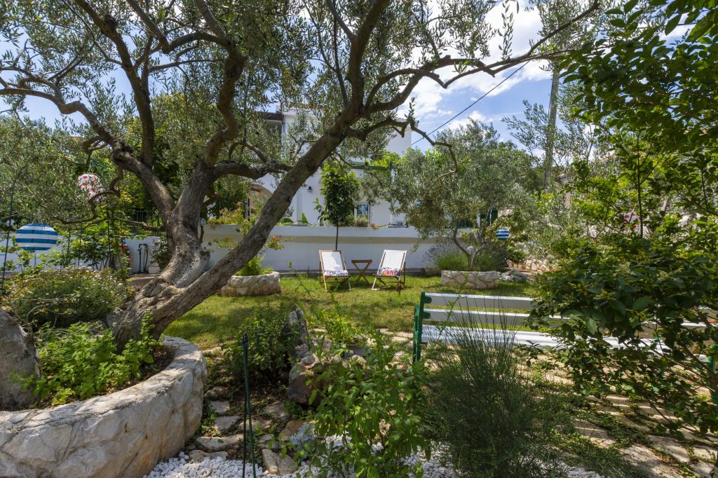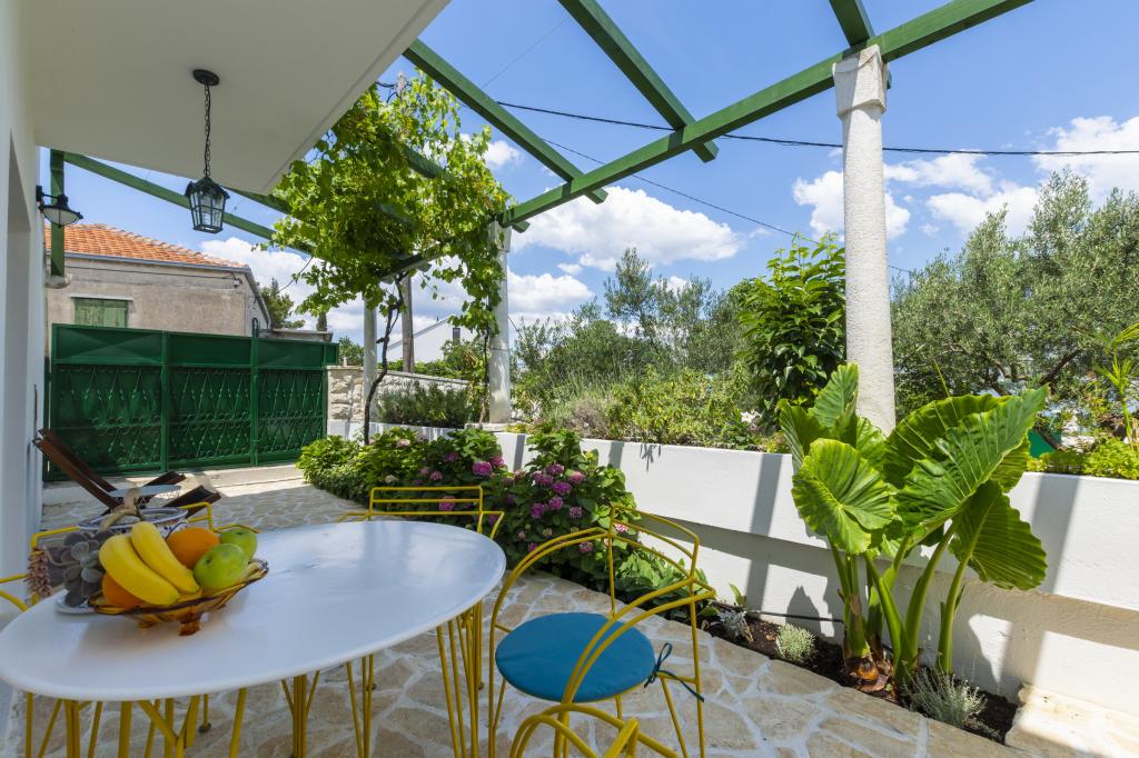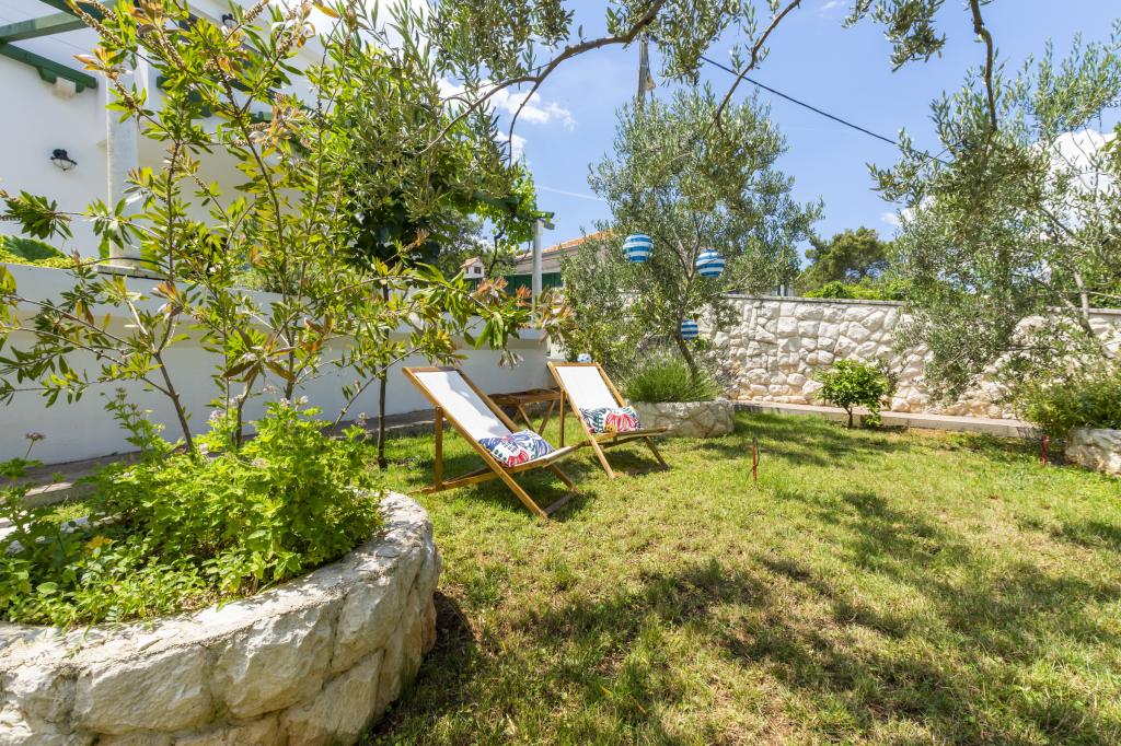 Ekskluzywny nowo wyremontowany apartament w małej wiosce rybackiej Arbanija (wyspa Ciovo) w pobliżu Trogiru. Mieszkanie ma prywatny dostęp przez ogrodzony ogród (gaj oliwny) o powierzchni 700 m2, taras o powierzchni 120m², 100 m od morza i plaży żwirowej. Wnętrze mieszkania ma łącznie 43 m2 2 sypialnie (8 m2 jedna sypialnia i 9 m2 druga) oraz 2 łazienki. Mieszkanie posiada duży ogród i prywatny parking i jest otoczone wysokim kamiennym murem, a dostęp do mieszkania zapewniają żelazne drzwi z zamkiem. Ogród jest ukryty z zewnątrz i zapewnia pełną prywatność. Do dyspozycji Gości jest bezpłatny bezprzewodowy dostęp do Internetu oraz grill i prysznic słoneczny w ogrodzie. Mieszkanie po kapitalnym remoncie w styczniu 2021, wyposażone w nową kuchnię, sprzęt AGD i meble łazienkowe. Odrestaurowane meble i obrazy artystyczne nadają temu mieszkaniu elegancji i ciepła.