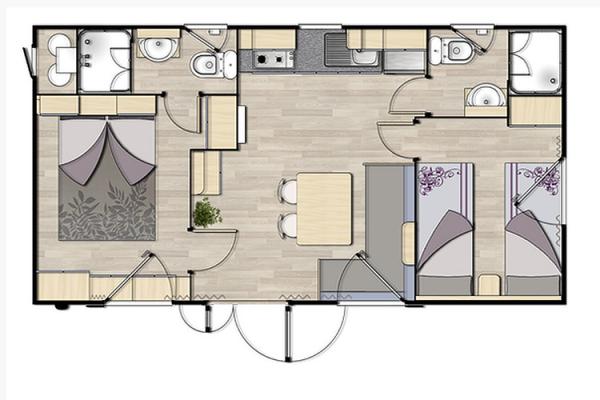 Domki położone są w Camp Basko Polje na Riwierze Makarskiej. Sam znany jest z pachnących sosen, dziewiczych plaż i krystalicznie czystej wody. Bungalow Resort posiada wszystkie udogodnienia potrzebne do udanego wypoczynku. Oprócz czystego morza, czysta plaża żwirowa i pachnących sosen, ośrodek znajduje się restauracja i bar, fast food, sklep spożywczy, piekarnia i duży parking. Pobliskie miasta Makarska, Baska Voda i Parku Przyrody Biokovo zapraszamy do odwiedzenia. Domki posiadają dwie sypialnie (podwójne łóżko / dwa pojedyncze łóżka), kuchnia, pokój dzienny z rozkładaną sofą dla dwóch osób, dwie łazienki z prysznicem, veranadu / taras. Są one wyposażone w klimatyzację, bezprzewodowy dostęp do Internetu i telewizję satelitarną.