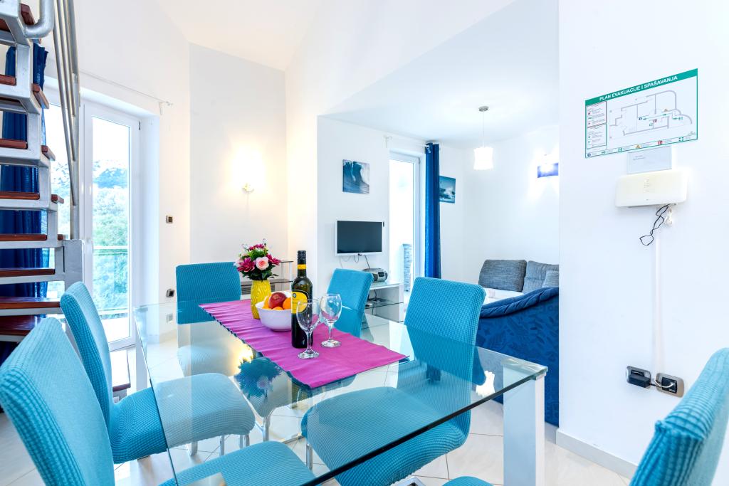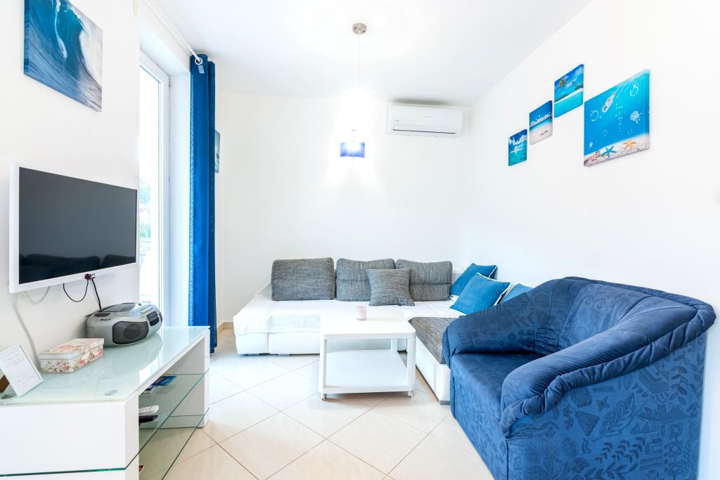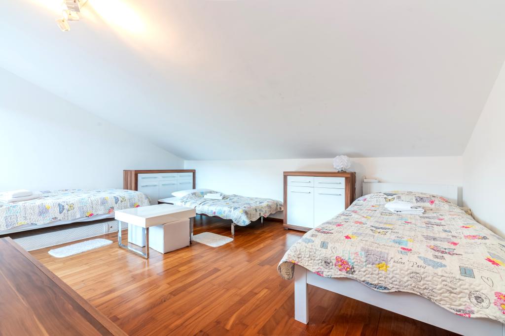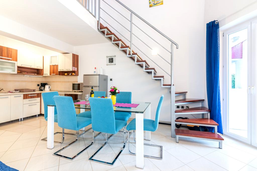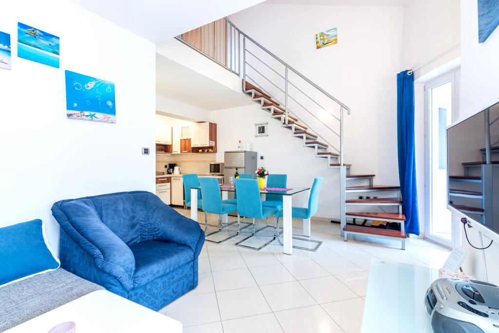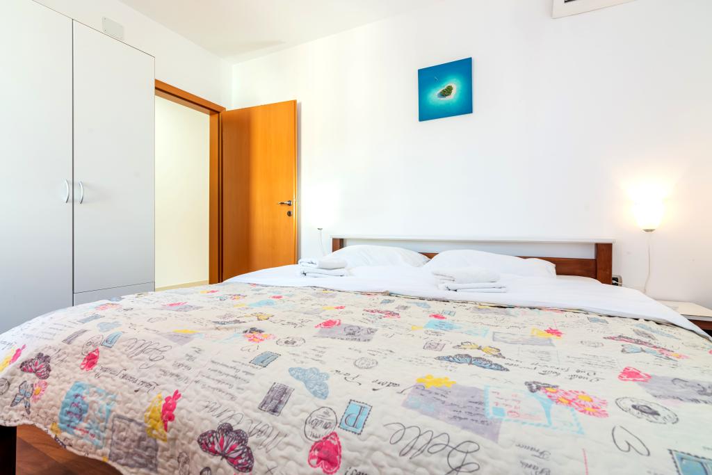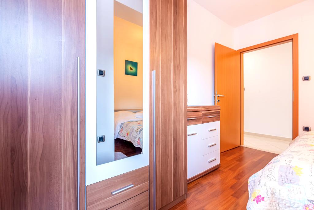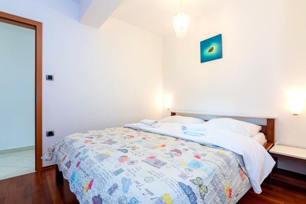 Mieszkanie znajduje się na 2. i 3. piętrze. Posiada 2 pokoje dwuosobowe z podwójnymi łóżkami, 1 pokój dwuosobowy z pojedynczymi łóżkami, pokój dzienny z sofą dla 2 osób, 2 łazienki, w pełni wyposażoną kuchnię i jadalnię. Apartament ten położony jest około 3 minuty spacerem od centralnej plaży. Ten nowoczesny apartament położony jest w spokojnej okolicy i wyposażony jest w 3 klimatyzatory, bezpłatny bezprzewodowy dostęp do Internetu, telewizję satelitarną, przestronny taras oraz bezpłatny prywatny parking przed domem. W pobliżu obiektu znajduje się także niewielki sklep i restauracja.