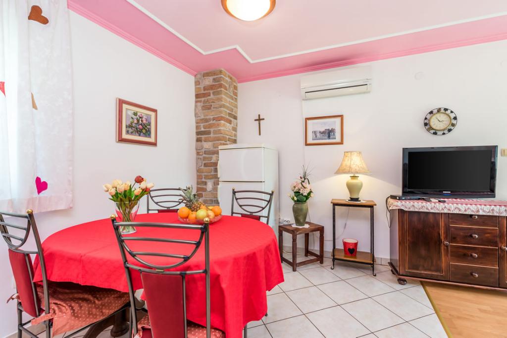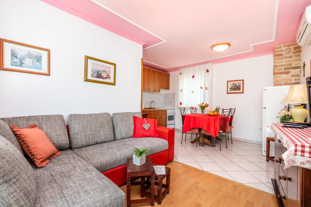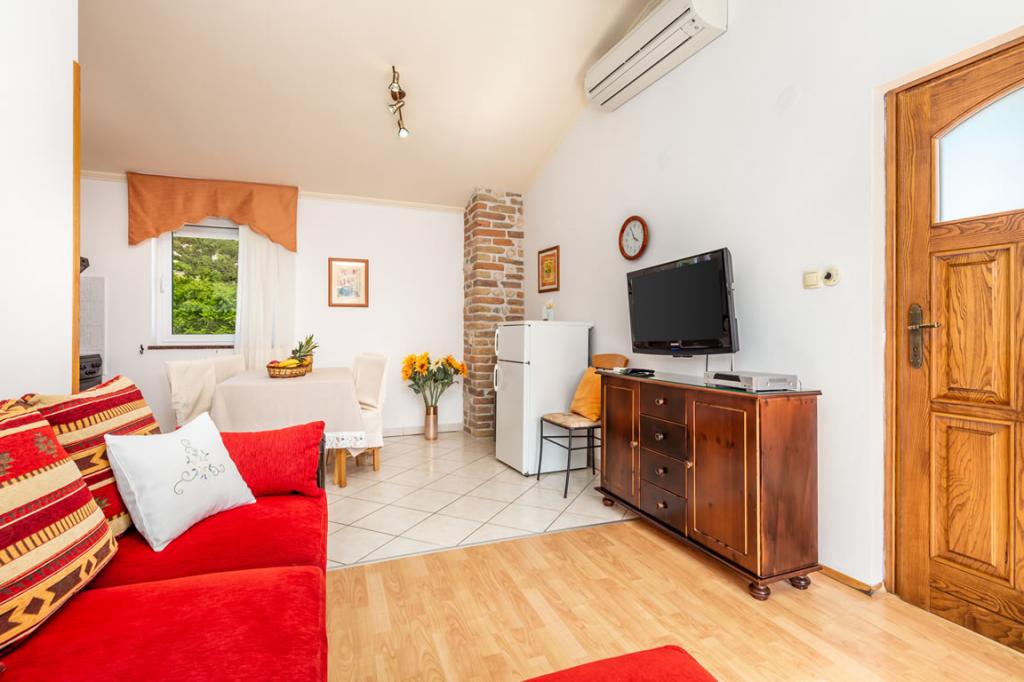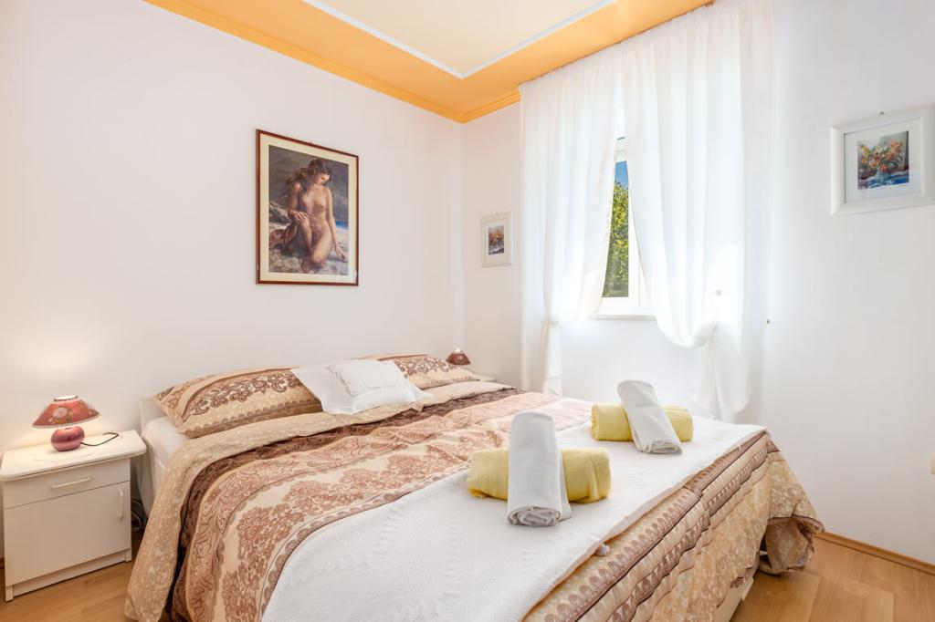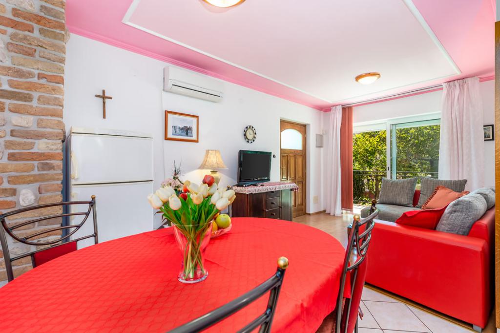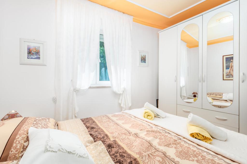 Apartamenty Patricia znajdują się w spokojnej okolicy, blisko centrum, 5 minut spacerem (350 metrów) od plaży, która ma europejską niebieską flagę. Apartamenty mają 60 metrów kwadratowych i są wyposażone dla 4-7 osób. Apartamenty zostały niedawno odnowione i składają się z sypialni z podwójnym łóżkiem, jednego pokoju z dwoma lub trzema łóżkami, łazienki z WC, przestronnej iw pełni wyposażonej kuchni oraz salonu z fotelem i telewizją satelitarną. Każdy apartament posiada balkon. Goście apartamentu mają grill z tarasem otoczony zielenią i miejsce parkingowe przed domem. Apartament posiada klimatyzację i internet.