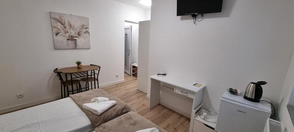 Co oferujemy? Komfortowy pokój dwuosobowy do wynajęcia w Beli Manastir: wyposażony w dwa wygodne łóżka, idealny do odpoczynku i relaksu po zwiedzaniu Baranji. Prywatna łazienka: nowoczesne udogodnienia, gorący prysznic i wszystkie niezbędne artykuły higieniczne dla Twojej wygody. Lodówka: przechowuj jedzenie i napoje przy sobie dla większej wygody. Darmowe Wi-Fi: Pozostań w kontakcie i surfuj po Internecie bez żadnych zakłóceń. Klimatyzacja: Utrzymuje idealną temperaturę przez cały pobyt. Biurko: idealne dla osób podróżujących służbowo, które potrzebują cichej przestrzeni do pracy. IPTV: ciesz się różnorodnością kanałów z całego świata i śledź swoje ulubione programy i treści. W lodówce będzie na Ciebie czekał powitalny drink. W obiekcie znajduje się gabinet kosmetyczny, a wraz z noclegiem istnieje możliwość zamówienia makijażu lub innych usług kosmetycznych.