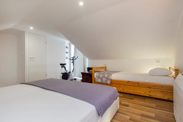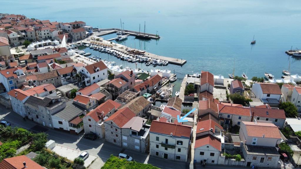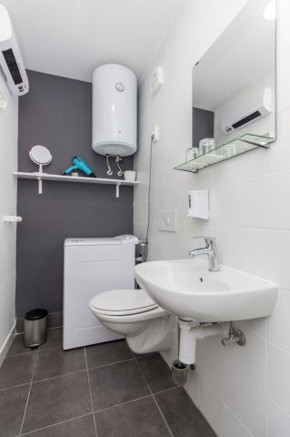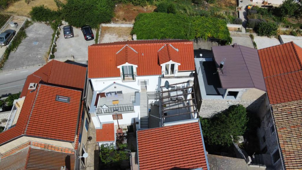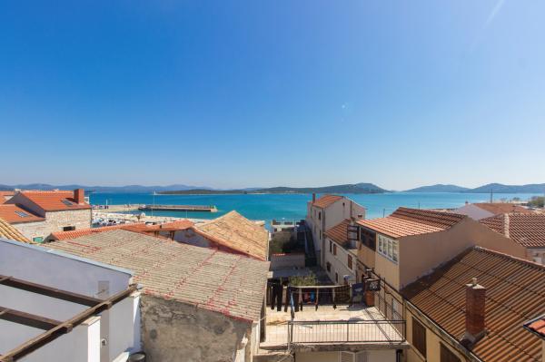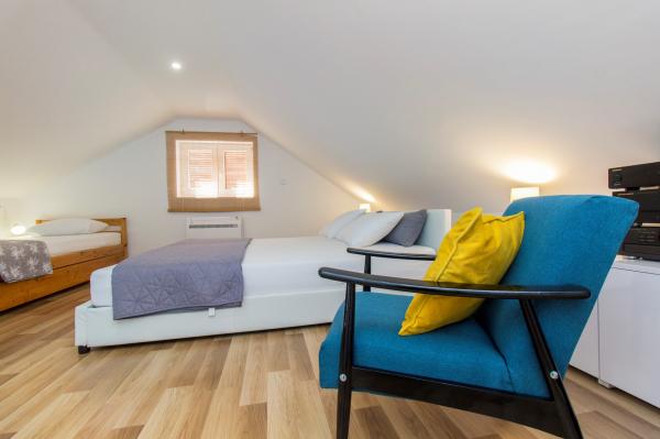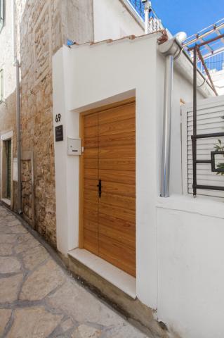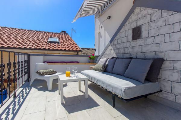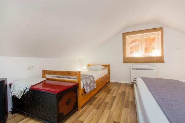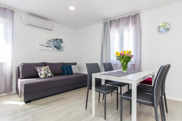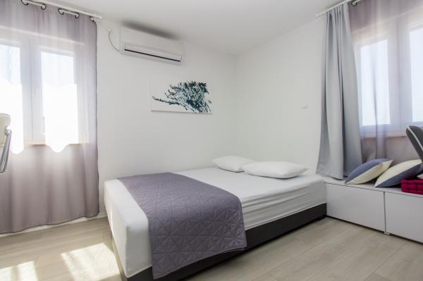 Mieszkanie znajduje się blisko centrum (100 m) i plaży (200 m).Parking jest dostępny w pobliżu budynku, w odległości ok. 150 m. Mieszkanie jest dwupiętrowe, znajduje się na drugim piętrze i poddaszu starego kamiennego domu rodzinnego. Parter wejściowy mieszkania składa się z pokoju dziennego z kuchnią oraz łazienki i jest połączony z poddaszem wewnętrzną klatką schodową. Pojemność 3+1, czyli pokój na poddaszu wyposażony w duże podwójne łóżko 180x200 cm oraz łóżko dla jednej osoby 90x200 cm. W salonie trzyosobową kanapę można rozłożyć w wygodne łóżko o wymiarach 160x200, z którego mogą spać 2 osoby. Kuchnia jest w pełni wyposażona, podobnie jak salon i łazienka (dodatkowe wyposażenie: mikrofalówka, czajnik, TV+Netflix, wi-fi, mini line, suszarka do włosów, mydło, szampon), wszystkie otwory posiadają moskitiery. Każdy pokój jest indywidualnie klimatyzowane. Apartament posiada taras o powierzchni 12 m2, wyposażony w markizę i meble do siedzenia.