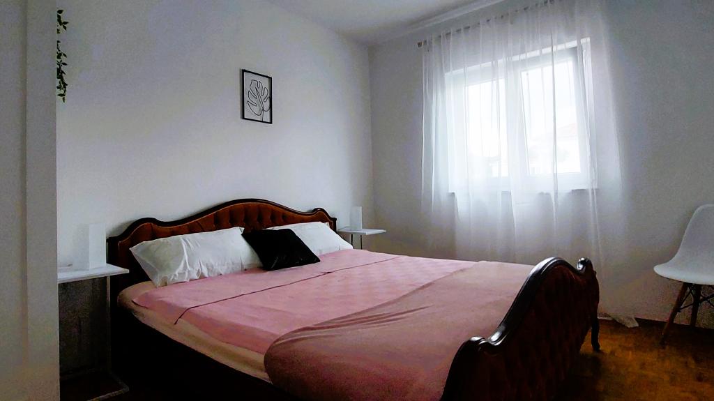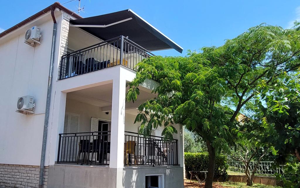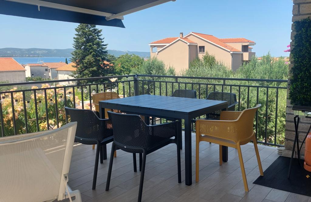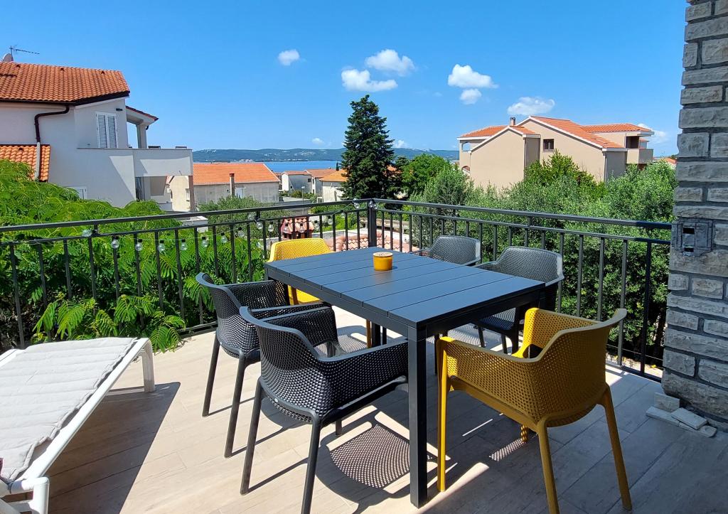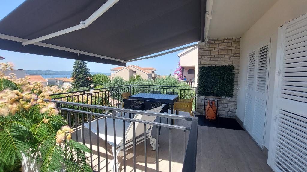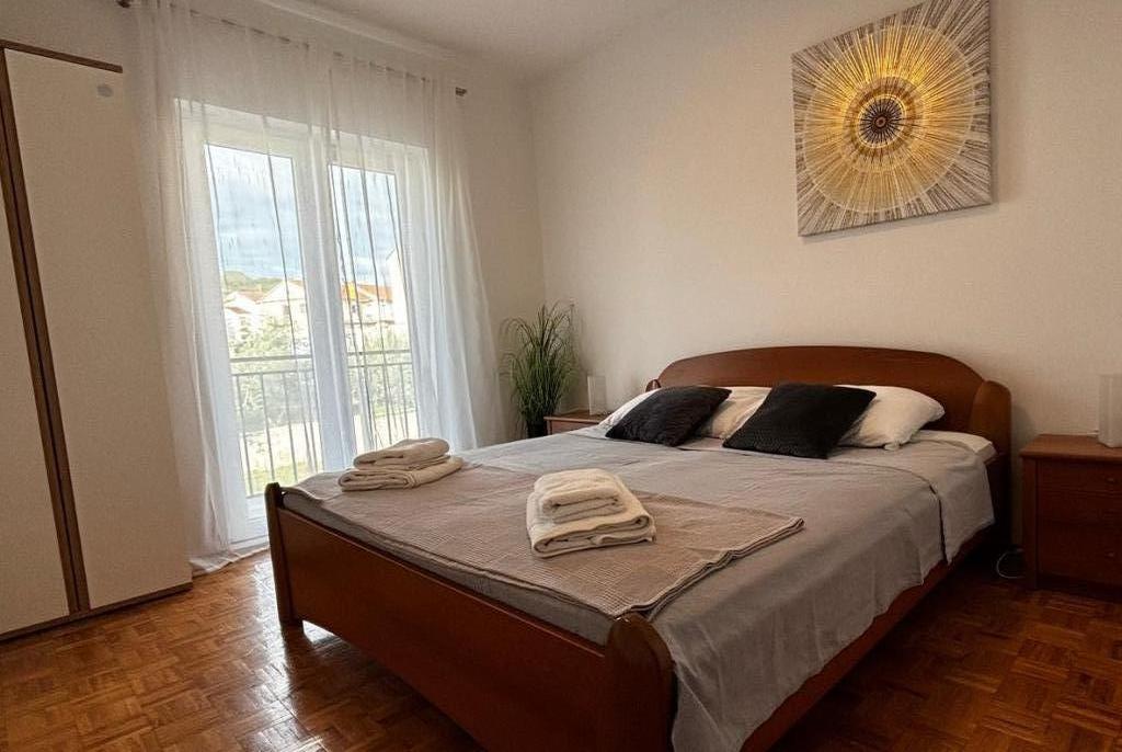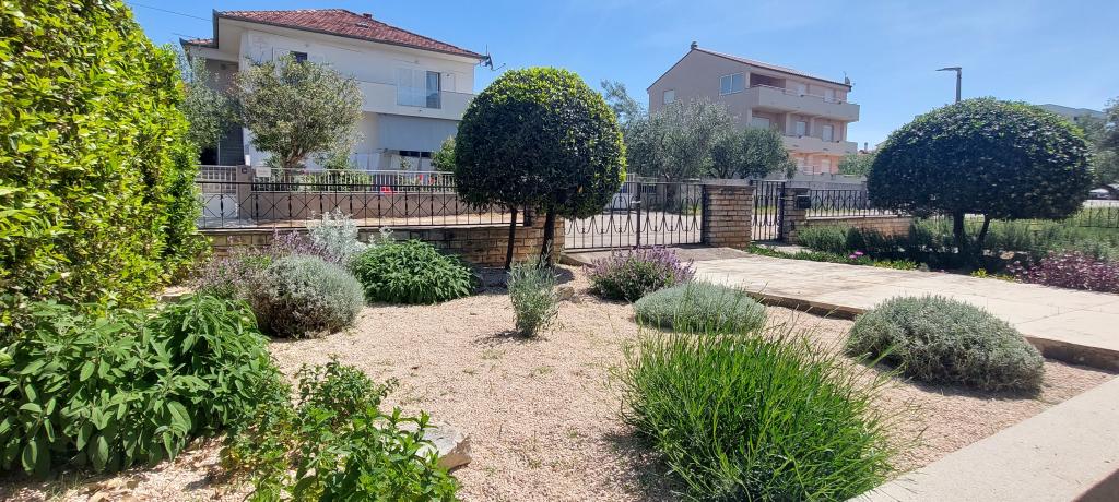 Nowo wyremontowany, klimatyzowany apartament znajduje się w domu wolnostojącym z dużym ogrodem, w spokojnej uliczce z domami rodzinnymi. Do lokalu mieszkalnego na pierwszym piętrze można dostać się osobnymi, zewnętrznymi schodami. Jest to jedyny apartament w budynku. Przed budynkiem znajduje się parking dla gości. Na powierzchni ponad 100 m2 znajdują się 4 sypialnie (3 pokoje z łóżkami podwójnymi i 1 pokój z 2 łóżkami pojedynczymi), salon z kuchnią, centralne wejście, dwie łazienki, duży taras i balkon. Salon z kuchnią i jadalnią oraz 1 sypialnia mają dostęp do tarasu z widokiem na morze, a 2 sypialnie mają dostęp do balkonu. W pełni wyposażona kuchnia zawiera wszystko, czego potrzebujesz do komfortowego pobytu, w tym zmywarkę, płytę ceramiczną, piekarnik, ekspres do kawy, lodówkę z zamrażarką, toster itp. Apartament jest wyposażony w pralkę, suszarkę do włosów i żelazko. Plaża Bošana 5 min. spacerem, a do centrum miasta jest 10 min.