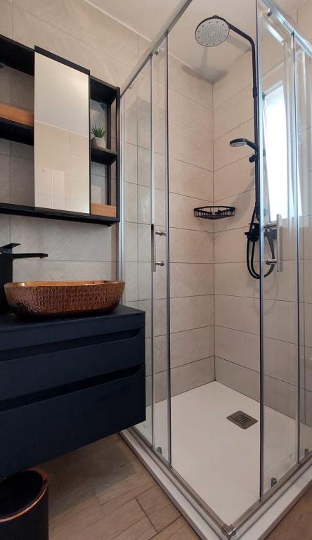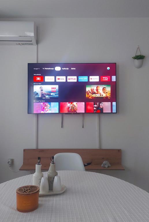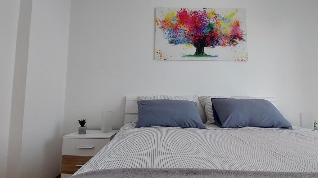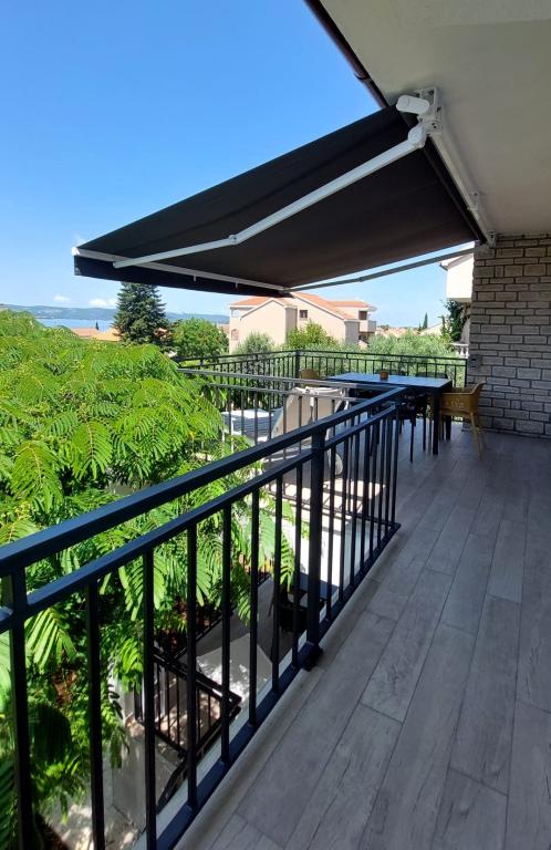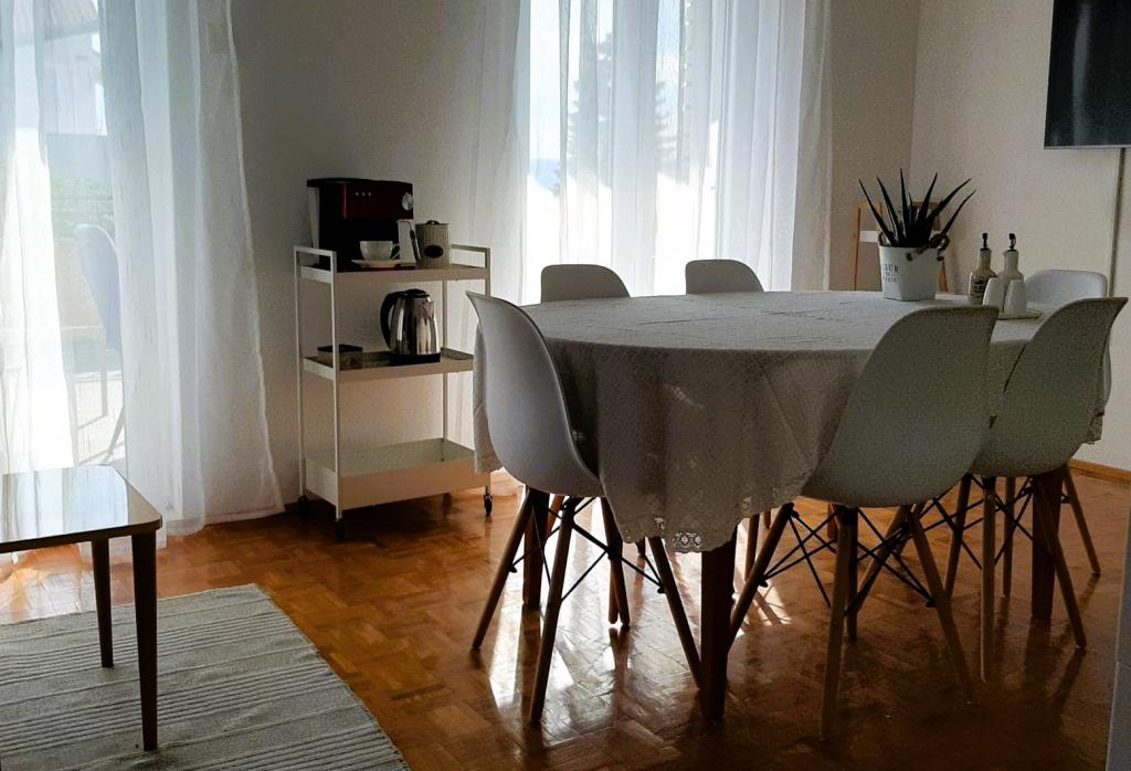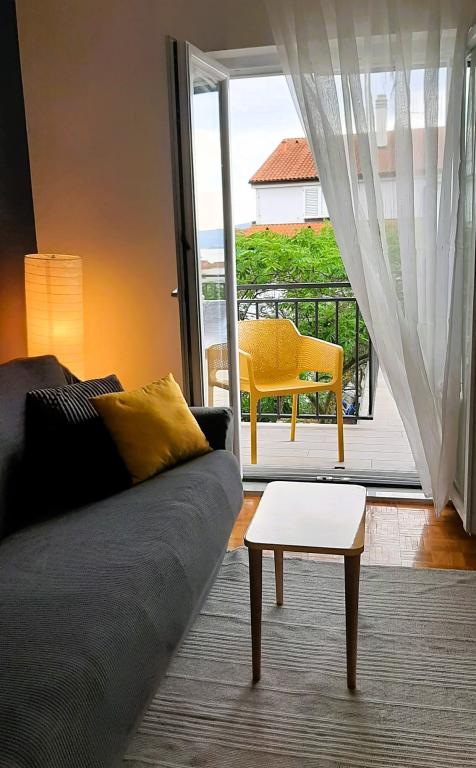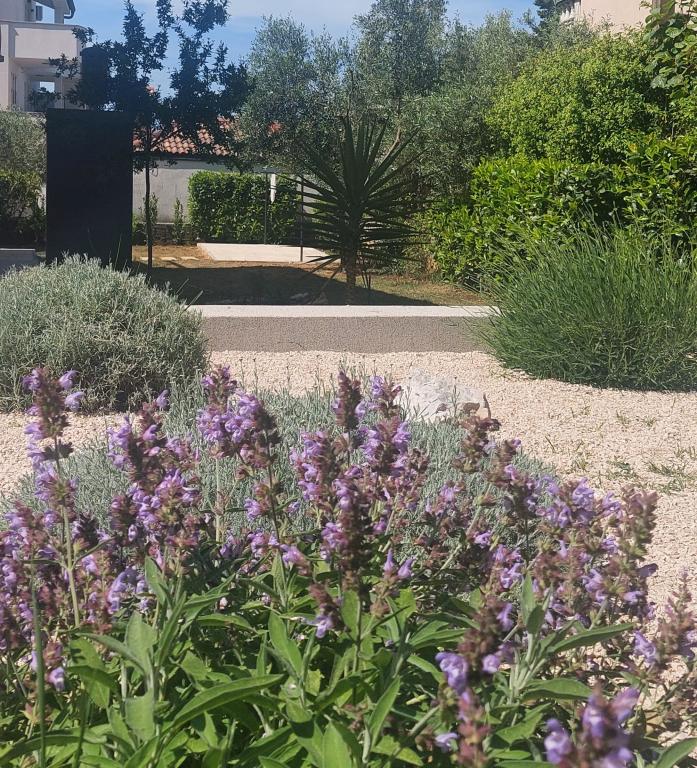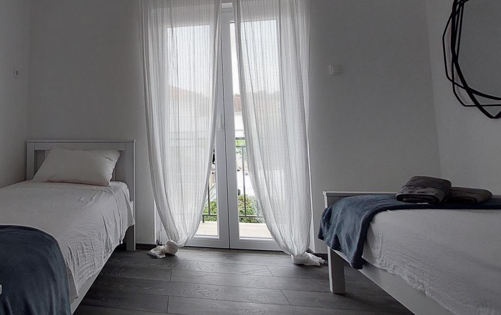Nowo wyremontowany, klimatyzowany apartament znajduje się w domu wolnostojącym z dużym ogrodem, w spokojnej uliczce z domami rodzinnymi. Do lokalu mieszkalnego na pierwszym piętrze można dostać się osobnymi, zewnętrznymi schodami. Jest to jedyny apartament w budynku. Przed budynkiem znajduje się parking dla gości. Na powierzchni ponad 100 m2 znajdują się 4 sypialnie (3 pokoje z łóżkami podwójnymi i 1 pokój z 2 łóżkami pojedynczymi), salon z kuchnią, centralne wejście, dwie łazienki, duży taras i balkon. Salon z kuchnią i jadalnią oraz 1 sypialnia mają dostęp do tarasu z widokiem na morze, a 2 sypialnie mają dostęp do balkonu. W pełni wyposażona kuchnia zawiera wszystko, czego potrzebujesz do komfortowego pobytu, w tym zmywarkę, płytę ceramiczną, piekarnik, ekspres do kawy, lodówkę z zamrażarką, toster itp. Apartament jest wyposażony w pralkę, suszarkę do włosów i żelazko. Plaża Bošana 5 min. spacerem, a do centrum miasta jest 10 min.