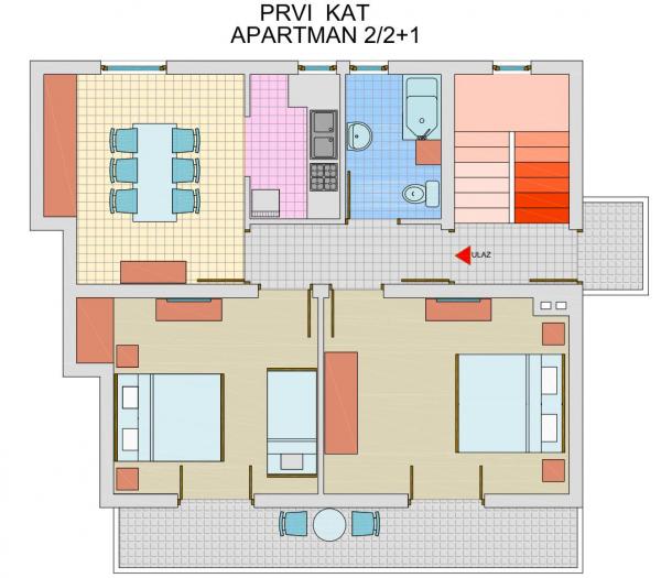 Dom rodzinny, w którym apartamenty znajdują się w centrum miasta, na skraju lasu Park Soline w którym główna plaża, korty tenisowe, dyskoteka i inne obiekty rozrywkowe. Dom posiada trzy apartamenty i jeden apartament typu studio dla dwóch osób, apartament dla czterech osób oraz apartament z dwoma sypialniami w sumie pięć osób. Apartamenty są wyposażone we wszystkie niezbędne narzędzia, podstawowe i pomocy. Mieszkanie jest włączony bezprzewodowy dostęp do Internetu, każdy apartament posiada balkon i klimatyzację. Stocznia jest grill. Grill Korištelnje jest bezpłatna. Jest możliwość parkowania w garażu oraz miejsce parkingowe obok domu, a inni są miejsca parkingowe w pobliżu domu.