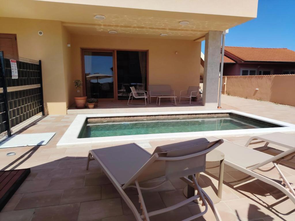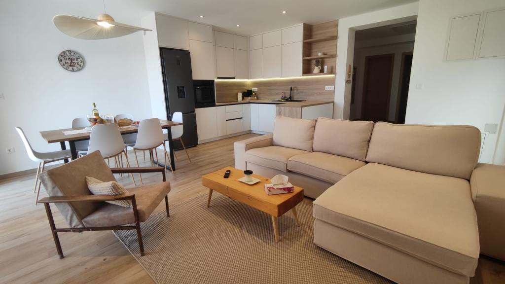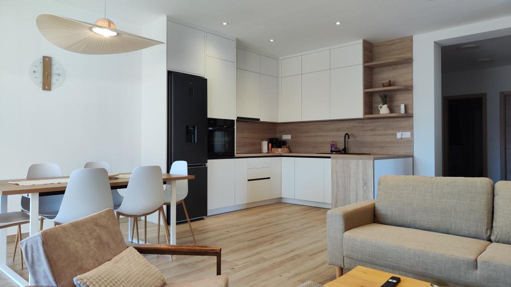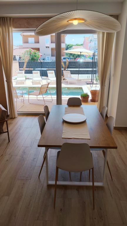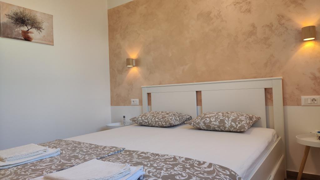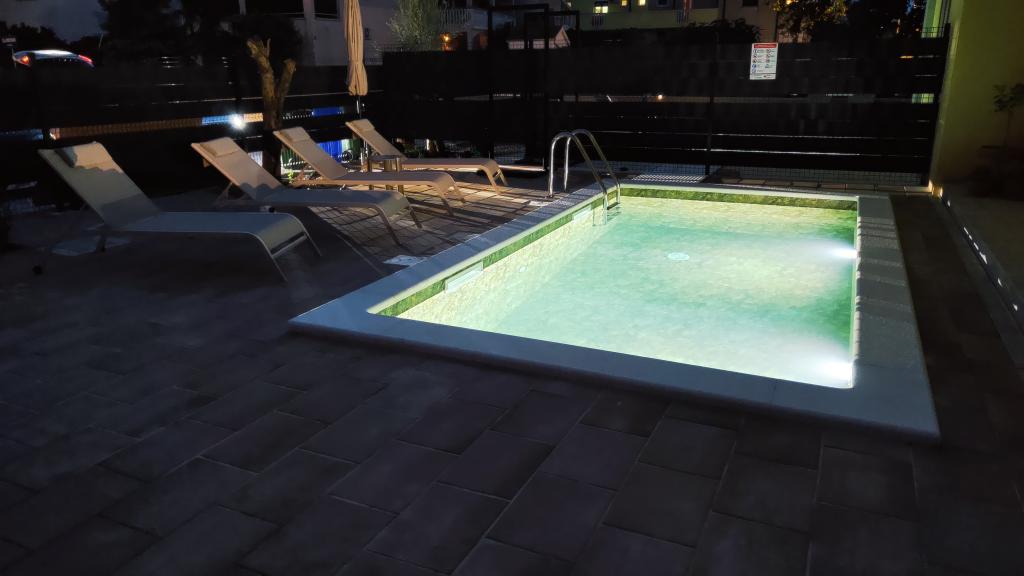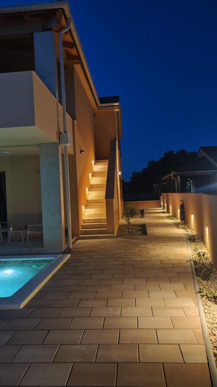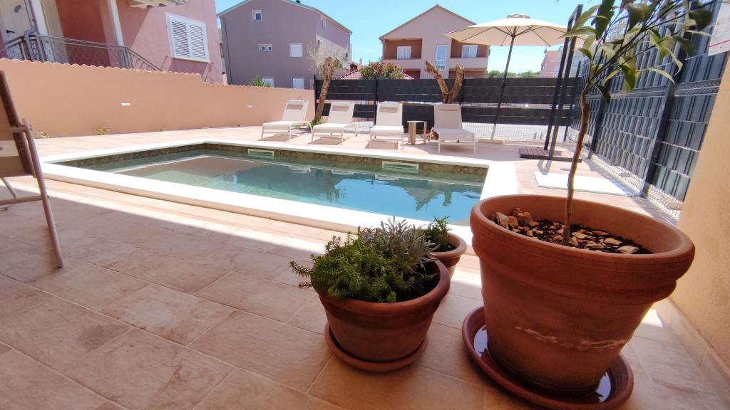 Nowo wybudowany, dwupiętrowy dom wakacyjny z basenem i dwoma oddzielnymi lokalami mieszkalnymi (parter i piętro). Każdy lokal mieszkalny o powierzchni 90 metrów kwadratowych składa się z 3 sypialni, kuchni, łazienki, tarasu i salonu. Do dyspozycji gości jest parking.