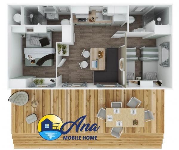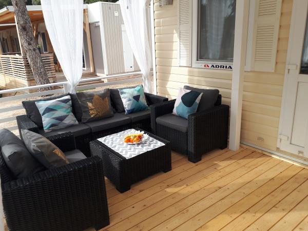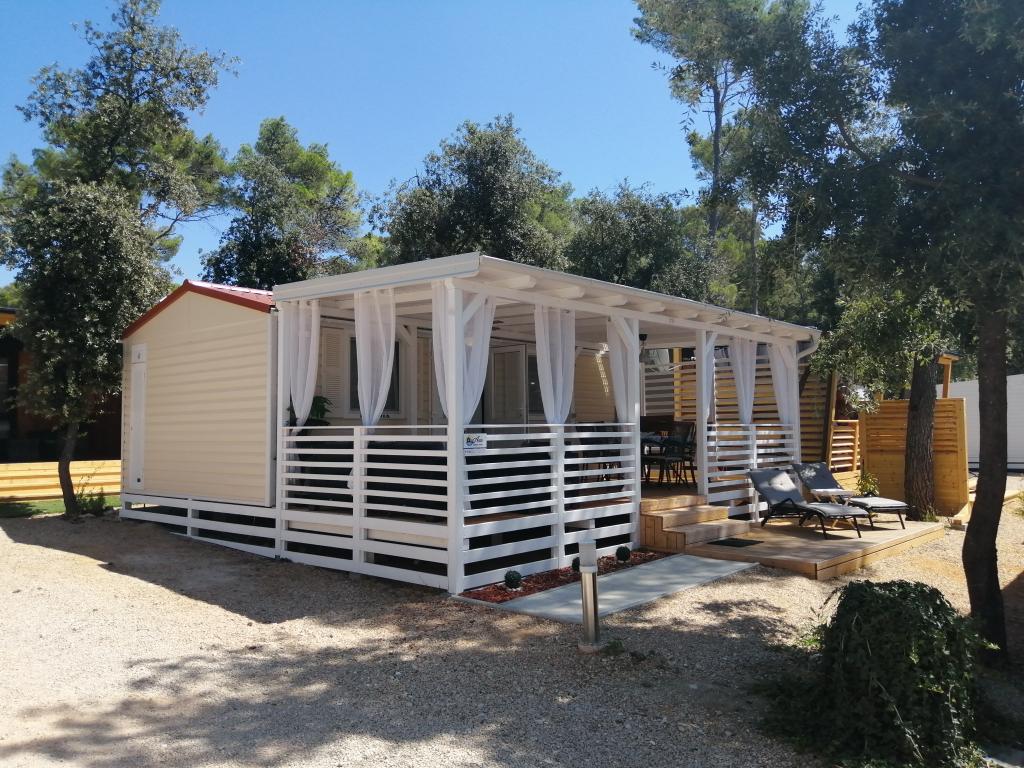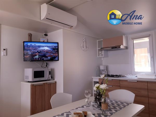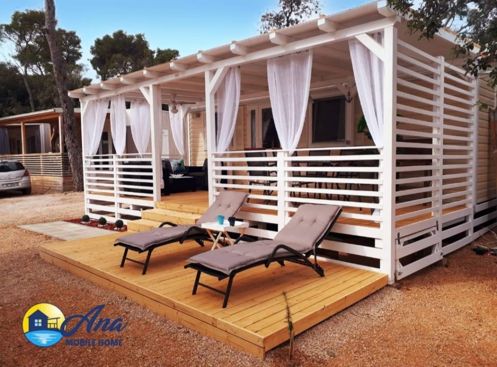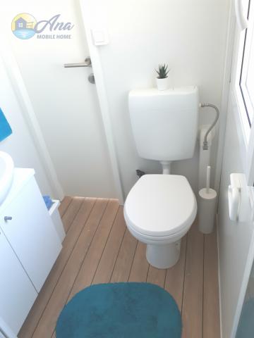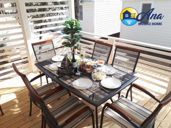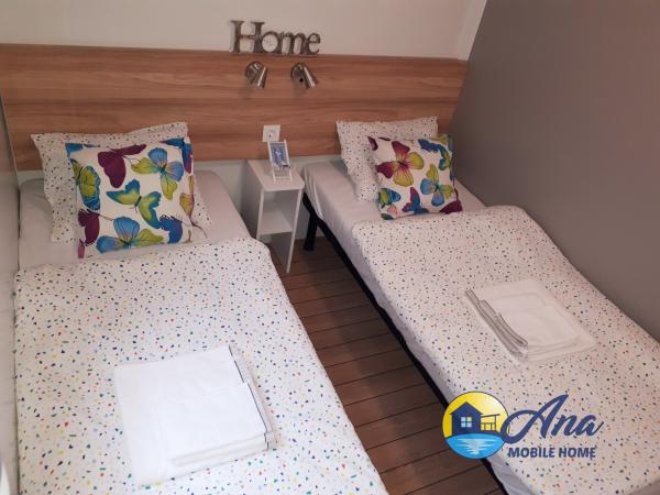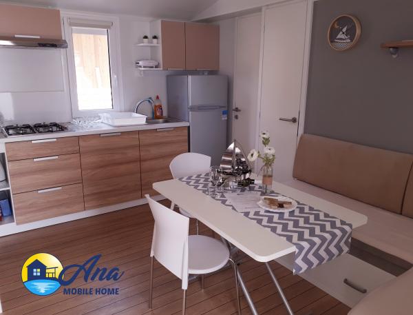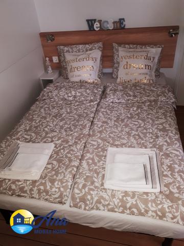 Mobile Home Ana to nowy, kompletny i nowocześnie wyposażony dom mobilny. W domku znajduje się sypialnia z podwójnym łóżkiem, sypialnia z oddzielnymi łóżkami i dwie łazienki z przestronnymi prysznicami z ręcznikami. Kuchnia jest w pełni wyposażona w klimatyzację, kuchenkę mikrofalową, kuchenkę wodną, ekspres do kawy, toster, żelazko, lodówkę z zamrażarką i akcesoria potrzebne do komfortowego pobytu. W salonie znajduje się trzyosobowy i stół z 2 krzesłami. Na przestronnym tarasie znajduje się trzyosobowy fotel, stół i stolik dzienny, a część z salonami relaksacyjnymi i częścią ze stołem i sześcioma krzesłami na świeżym powietrzu lub po prostu kranami do picia i dużym wentylatorem zewnętrznym odpowiednim do komfortowego pobytu. Taras jest również wyposażony w przewiewne zasłony, które zapewniają świeże powietrze. Na tarasie znajduje się również elektryczny grill i blacha do pieczenia. Miejsce parkingowe obok domku, odległość do morza 5 min łatwe spacery. W obozie znajduje się wspaniały plac zabaw dla dzieci, sklep, Internet / Wi-Fi, smart tv i program satelitarny