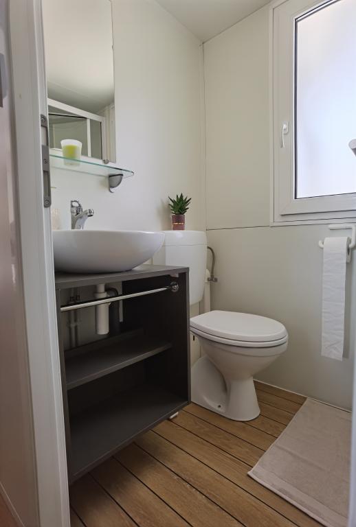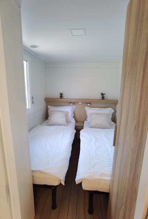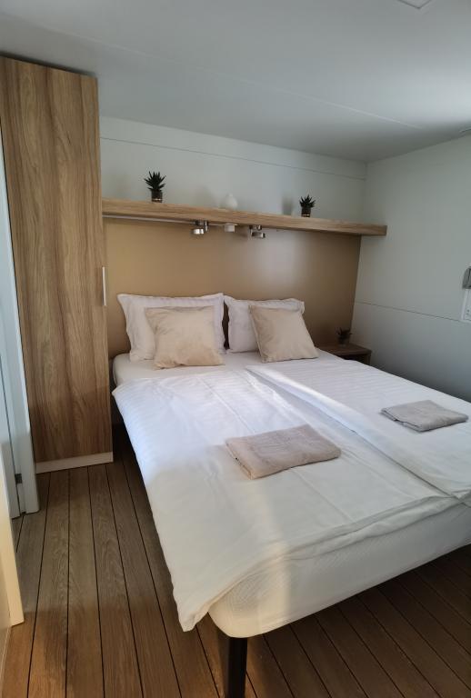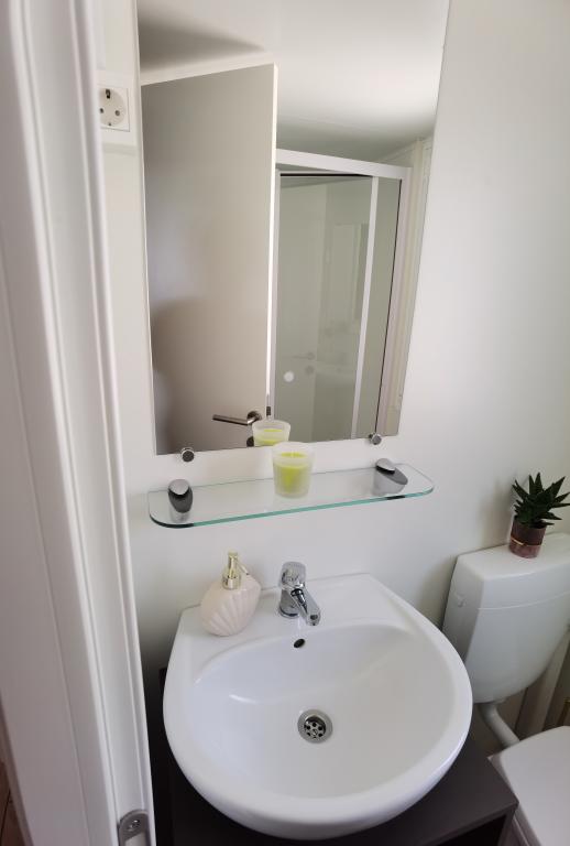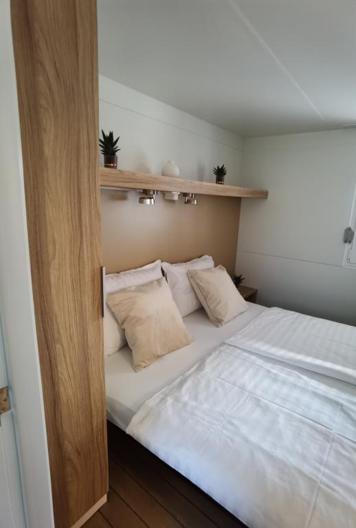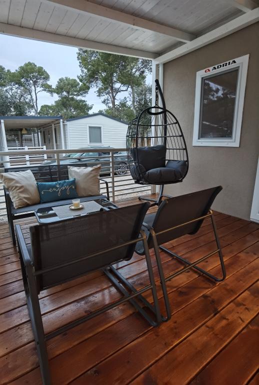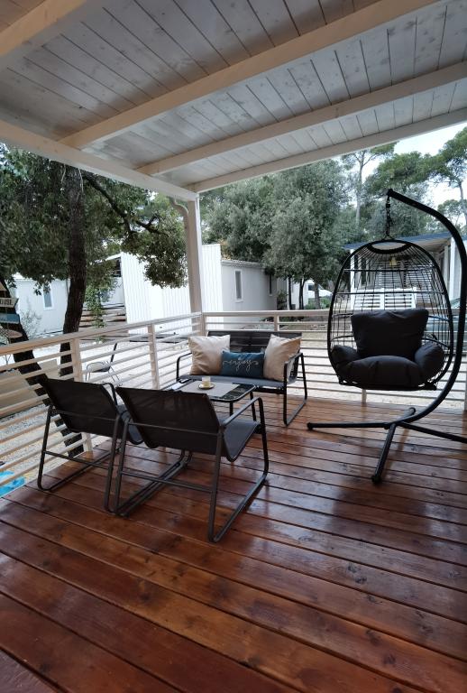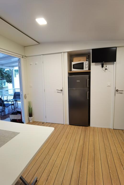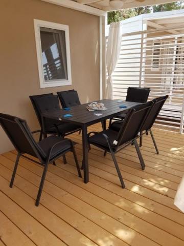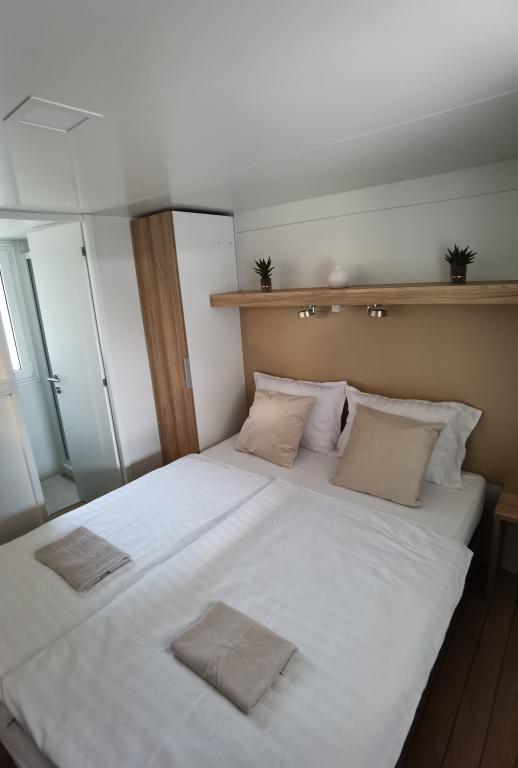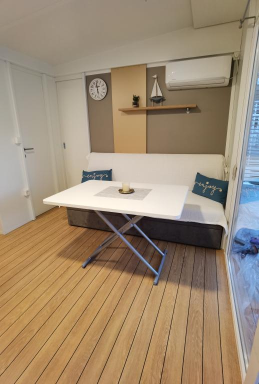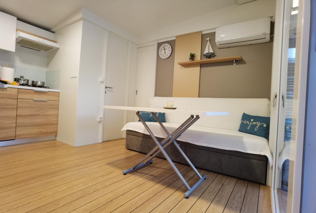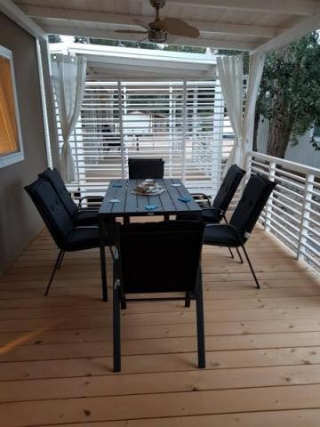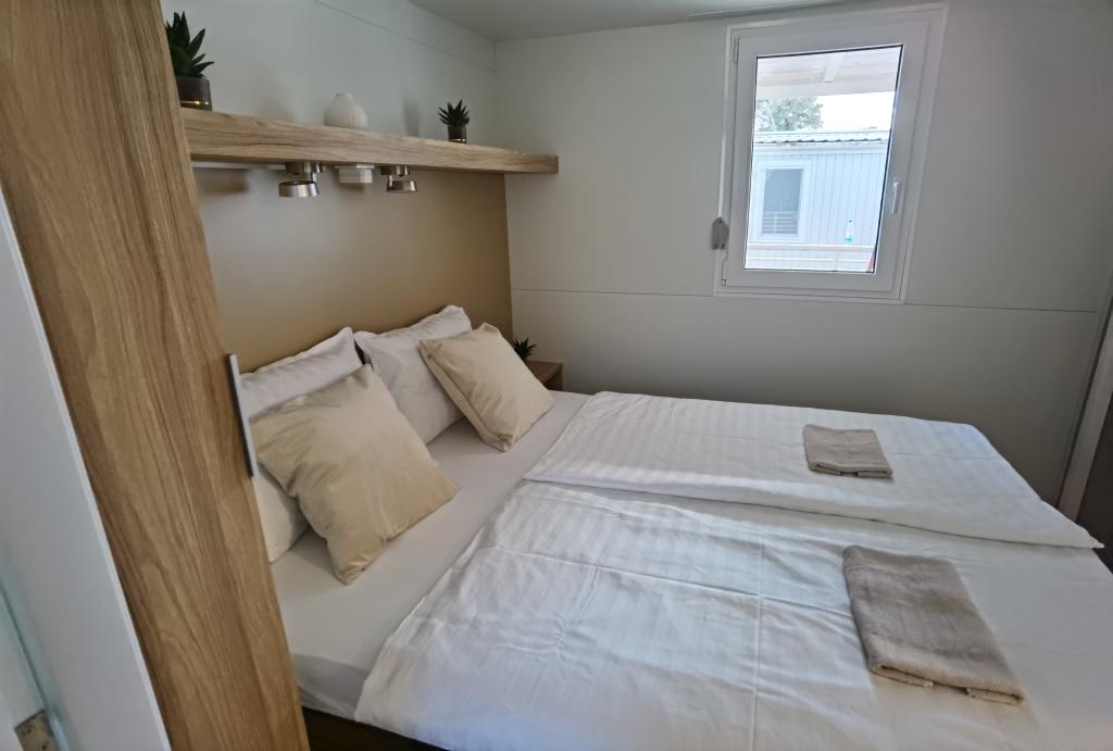 W pełni i nowocześnie wyposażona przyczepa stacjonarna na kempingu w Soline, wielkość 36m2 dla 7 osób. Dom posiada 3 pokoje, jeden z podwójnym łóżkiem i dwa pokoje z dwoma pojedynczymi łóżkami. W domu są też dwie łazienki. Kuchnia jest w pełni wyposażona, w tym zmywarka, kuchenka mikrofalowa, czajnik, lodówka z zamrażarką, ekspres do kawy oraz wszystkie akcesoria potrzebne do przyjemnego i niezakłóconego pobytu w domku. W salonie sofa ze stołem i krzesłami oraz duży telewizor. Istnieje możliwość dostawienia jednego dodatkowego łóżka dla jednej osoby w salonie. Dom posiada również klimatyzację, dzięki czemu każdy może cieszyć się pobytem w nim podczas upalnych, letnich miesięcy. Na tarasie o powierzchni 27m2 znajduje się część z leżakami do wypoczynku oraz część z dużym stołem i sześcioma krzesłami. Na tarasie znajduje się również grill elektryczny. Kemping położony jest w środku lasu sosnowego, 5 minut spacerem od plaży. W obozie można znaleźć wszystko, czego potrzeba do przyjemnego wypoczynku i pobytu, ponieważ oferuje kilka restauracji, kawiarni, kantory, możliwość prania i suszenia odzieży, a codziennie organizowane są różne zajęcia zarówno dla dzieci, jak i dorosłych. Dla wszystkich, którzy lubią bardziej aktywny wypoczynek, można wybierać spośród różnych zajęć, takich jak jazda na rowerze, nurkowanie, tenis stołowy, tenis, siatkówka plażowa, narty wodne, żeglarstwo i różne wycieczki do kilku położonych w pobliżu parków narodowych.