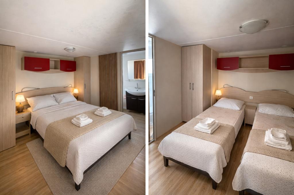 Domek mobilny Bonaca znajduje się na terenie kempingu Bakija, 40 metrów od morza, z łatwym dostępem do plaży. Niedaleko plaży Soline, 2-3 minuty spacerem, 1 minuta spacerem do targu Studenac i 7-8 minut spacerem do centrum. W pełni wyposażony, z ogrodem, kuchnią i komfortowym salonem. Parking! Własny grill na świeżym powietrzu i prysznic na świeżym powietrzu. Obiekt jest przeznaczony dla 4 osób, posiada 2 sypialnie i 2 łazienki. Przestronny taras, idealny na przyjemny pobyt z widokiem na morze i piękne zachody słońca.