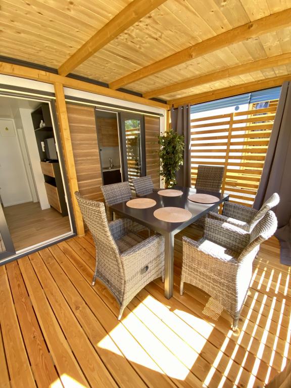 Dom zawiera: 2 sypialnie, kuchnię (w pełni wyposażoną), jadalnię, łazienkę, zadaszony, w pełni wyposażony taras o powierzchni 32 m2, łóżeczko dziecięce, krzesełko do karmienia, suszarkę do włosów, ekspres do kawy, czajnik, grill, toster, kuchenkę mikrofalową, żelazko, ręczniki, pościel, urządzenie do gotowania jajek, mikser stojący, odkurzacz