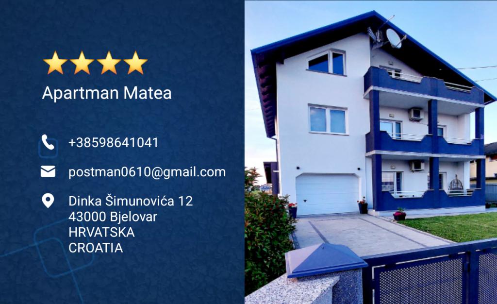Rezerwacji pobytu w apartamencie Matea można dokonać telefonicznie (SMS, WhatsApp, Viber) lub mailowo. Za rezerwację apartamentu można zapłacić przelewem bankowym lub po wcześniejszym uzgodnieniu, a cała kwota gotówką po przyjeździe do apartamentu. Wymeldowanie z apartamentu możliwe jest do godziny 12:00 lub po wcześniejszym uzgodnieniu, a przyjazd do apartamentu od godziny 14:00 lub po wcześniejszym uzgodnieniu. Oferujemy elastyczne godziny przyjazdu i wyjazdu z apartamentu. Jeśli przyjeżdżają Państwo do Bjelovaru transportem publicznym (autobusem lub pociągiem), jesteśmy gotowi odebrać Państwa i odwieźć w dniu wyjazdu bez żadnych dodatkowych opłat i kosztów.