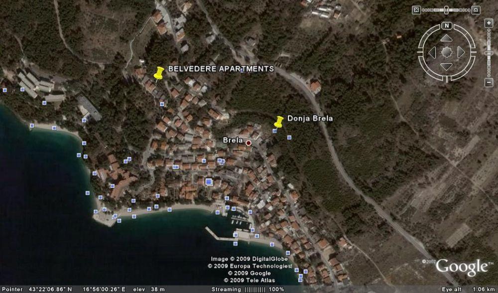 Budynek znajduje się przy bardzo cichej (ślepej uliczce), gdzie nie ma ruchu (tylko samochody należące do gości i właścicieli budynku) i oferuje wspaniały widok na las sosnowy, morze i pobliską wyspę Brač. Odległość do głównej plaży i centrum miasteczka to ok. 300m. Nasz parking jest strzeżony przed budynkiem.