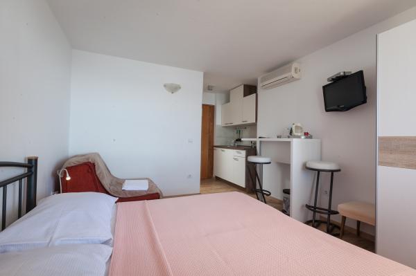 Polecam apartament Lela. Pokoj z aneksem i łazienka w pełni wyposażony. Z balkonu widok na morze. Blisko na plażę, super lokalizacja. Wlasciciele bardzo sympatyczni.
