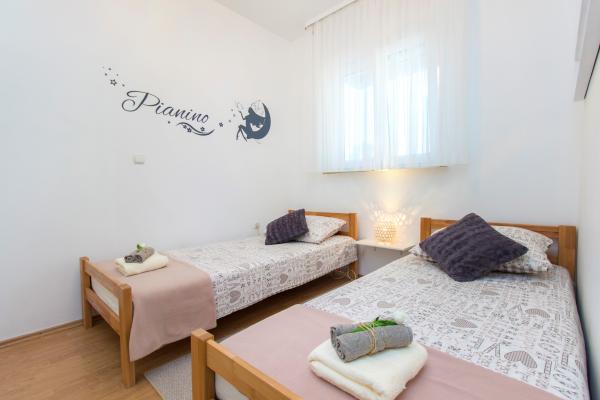 Nowocześnie wyposażone mieszkanie 100 m2 zlokalizowanych w Brodarica, spokojnej wiosce kilka kilometrów od Sibenika. Apartament Piano znajduje się zaledwie 40 metrów od plaży i posiada widok na morze. Składa się z dwóch sypialni, łazienka, WC, kuchnia w pełni wyposażona, przestronny salon i taras.