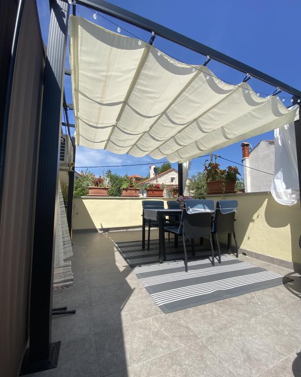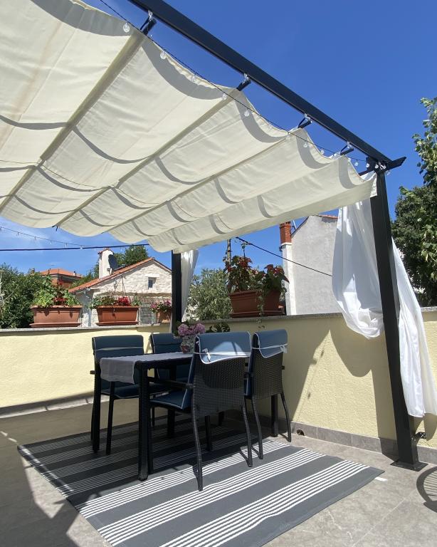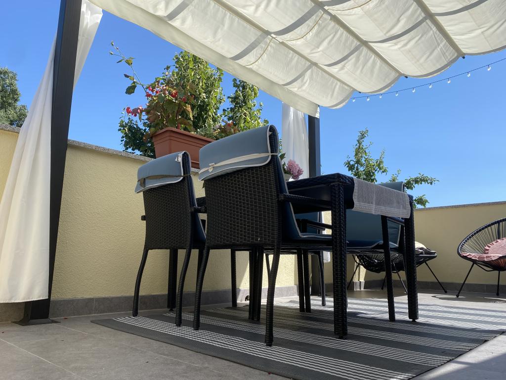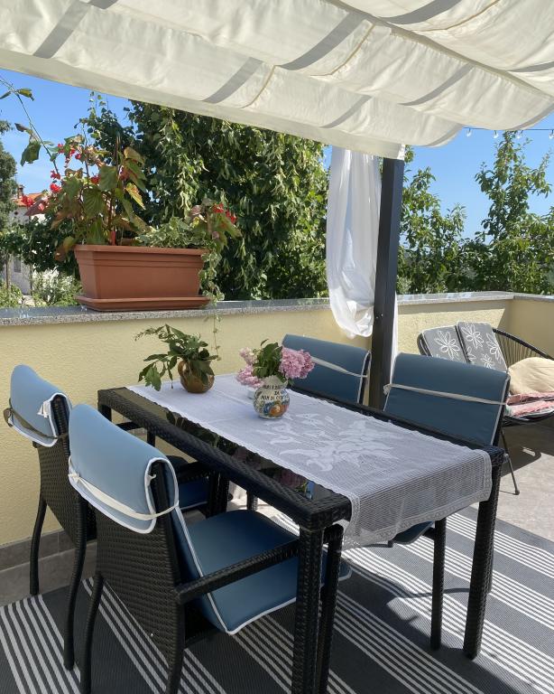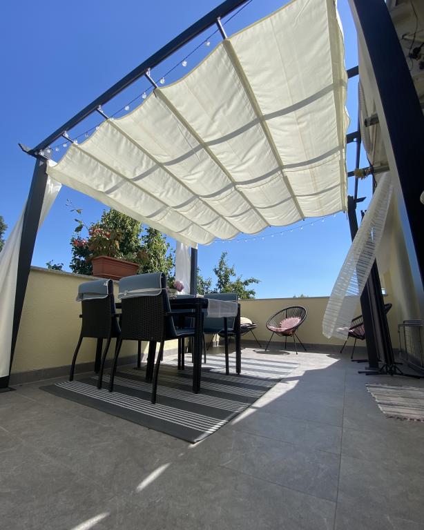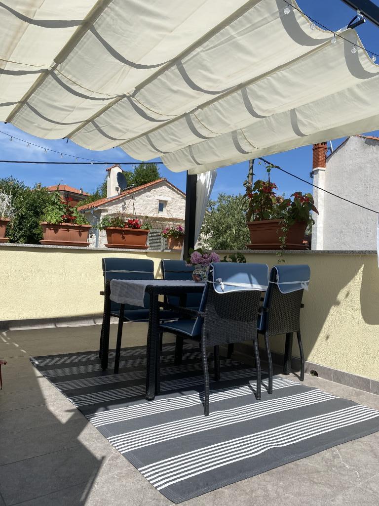 Apartament Violetta położony jest w malowniczej miejscowości Brtonigla (Verteneglio), zaledwie 5 km od pięknych plaż Istrii i Aquaparku Istralandia, jednego z najpopularniejszych parków wodnych w regionie. Znajduje się na trzecim piętrze naszego domu, z osobnym, prywatnym wejściem – idealny wybór dla osób poszukujących spokojnego i relaksującego wypoczynku. Przestronny i komfortowy apartament wyposażony jest we wszystkie udogodnienia, dzięki którym poczujesz się jak w domu: posiada dwie sypialnie z podwójnymi łóżkami, nowoczesną łazienkę z prysznicem i pralką, a także w pełni wyposażoną kuchnię z kuchenką mikrofalową, ekspresem do kawy, czajnikiem i zmywarką. Ciesz się chwilami spokoju na dużym tarasie z widokiem na morze, idealnym na śniadanie na świeżym powietrzu, wieczorny relaks o zachodzie słońca lub lekturę ulubionej książki. Apartament jest klimatyzowany, posiada szybkie Wi-Fi, telewizję satelitarną, a do dyspozycji Gości jest grill, na którym można przygotować pyszne posiłki. Goście mają również do dyspozycji prywatny parking przed domem.