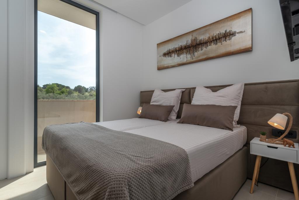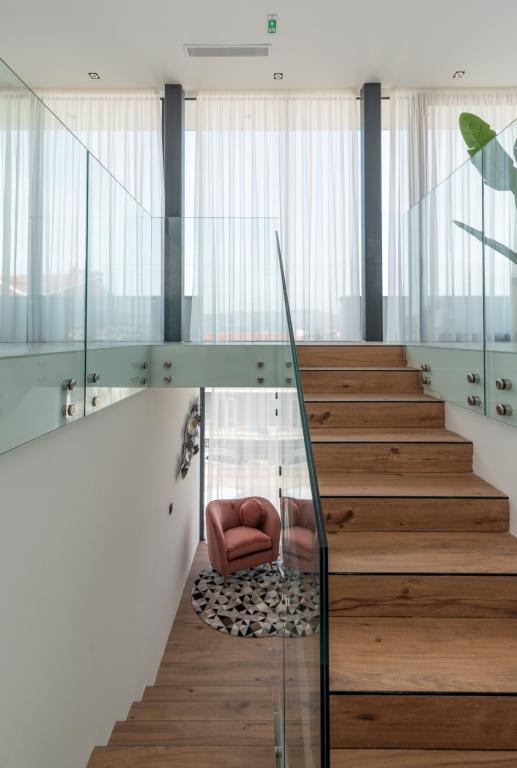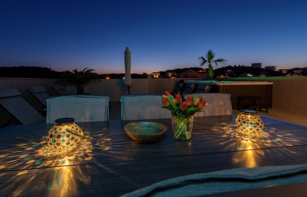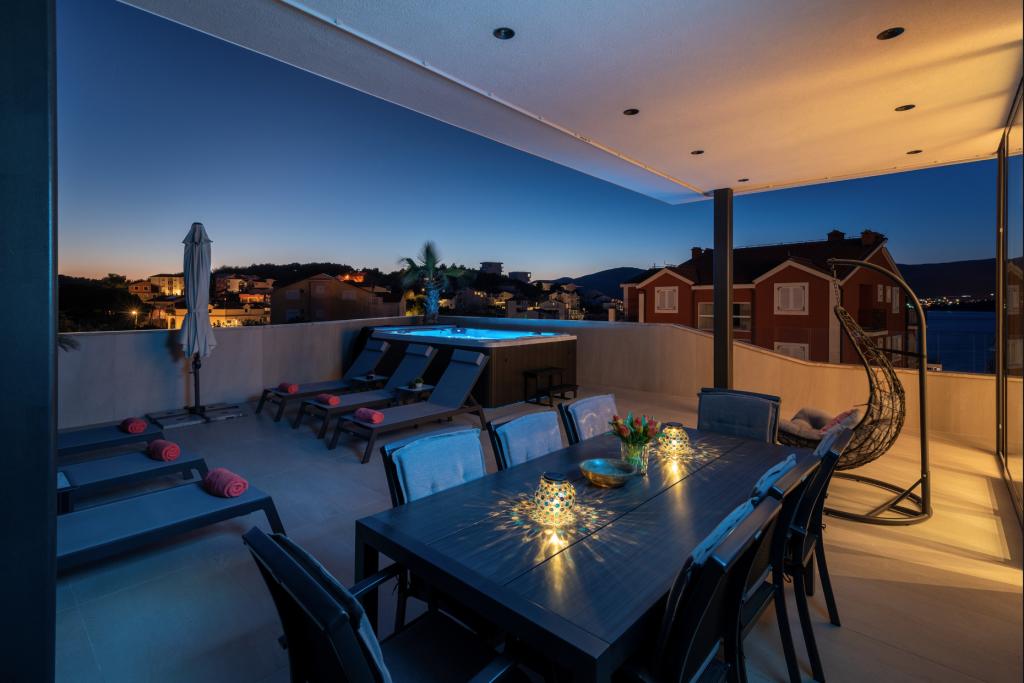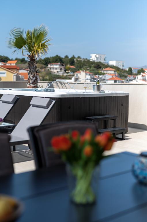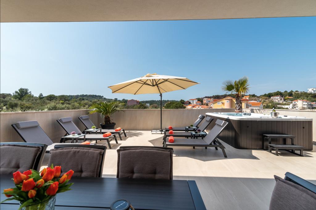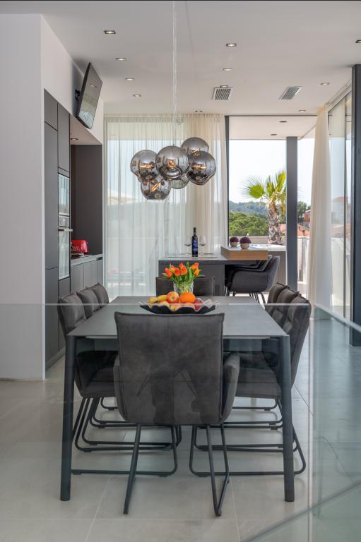Penthouse Majestic to zupełnie nowe luksusowe arcydzieło ze szkła i stali z przestronnymi oknami oraz pięknym salonem i jadalnią. Z w pełni wyposażonej kuchni masz bezpośredni dostęp do fantastycznego tarasu 360° z widokiem na morze i gaj oliwny. Ciesz się dużym tarasem z panoramicznym widokiem, grillem gazowym, jadalnią, miejscem do opalania i naszym jacuzzi SPA dla 8 osób. Duży penthouse z tarasem o powierzchni 120 m2 zajmuje całe trzecie piętro. Przed wejściem znajdują się trzy bezpłatne miejsca parkingowe, stacja ładowania samochodów elektrycznych oraz mały garaż z prądem, który pomieści rowery, wózki dziecięce, przyczepki, deski surfingowe itp. Penthouse oferuje cztery eleganckie sypialnie dwuosobowe oraz łazienki z bezpośrednim wyjściem. wyjście na taras 360°, telewizor z płaskim ekranem i bezpłatne WiFi. Połączona sauna na podczerwień z prysznicem zapewnia dodatkowy relaks.