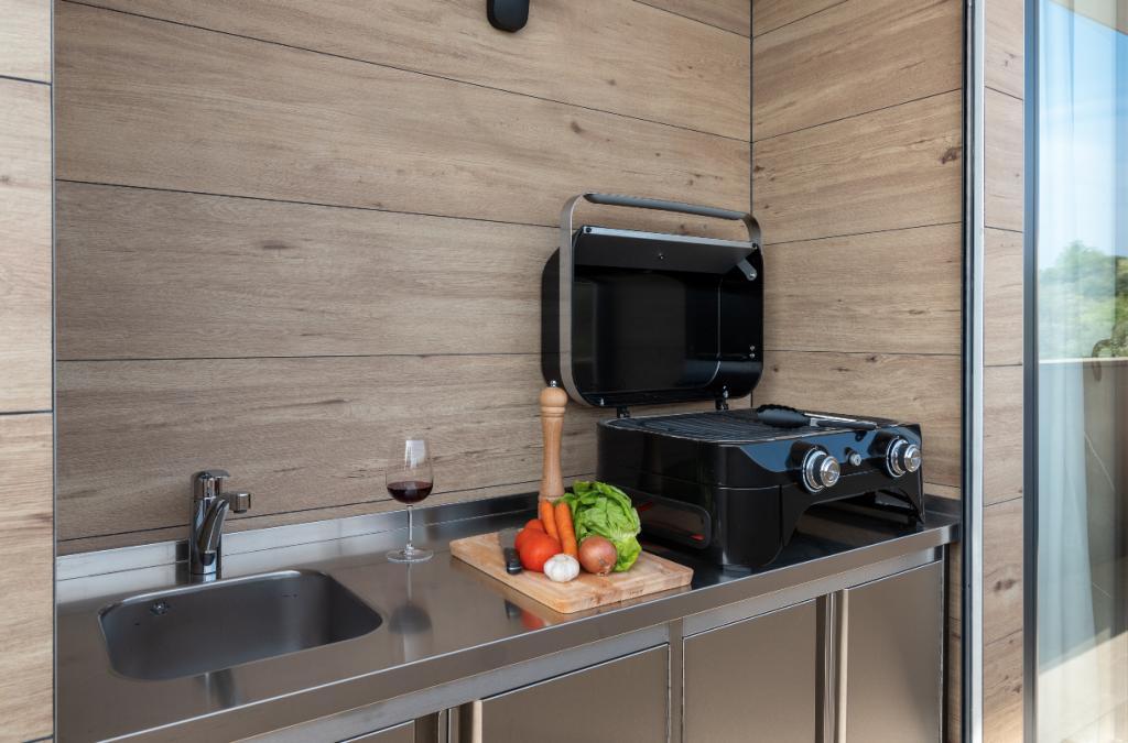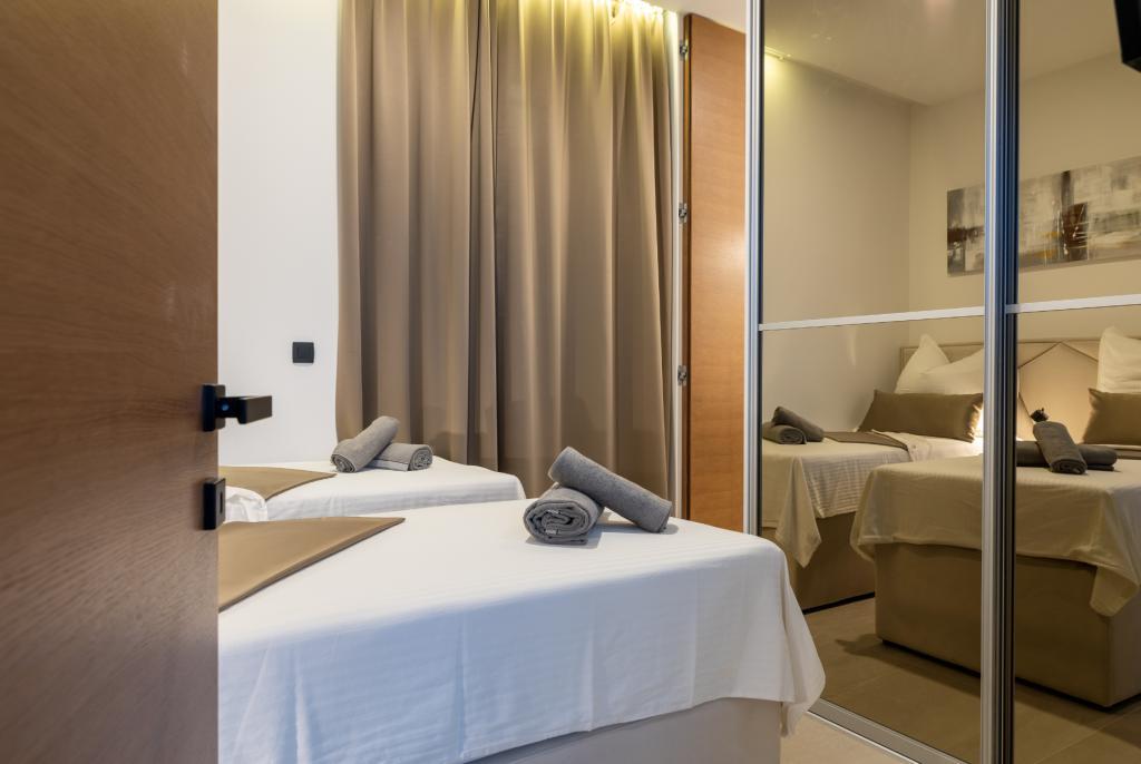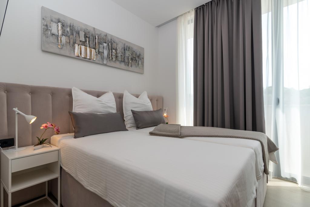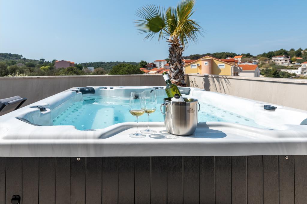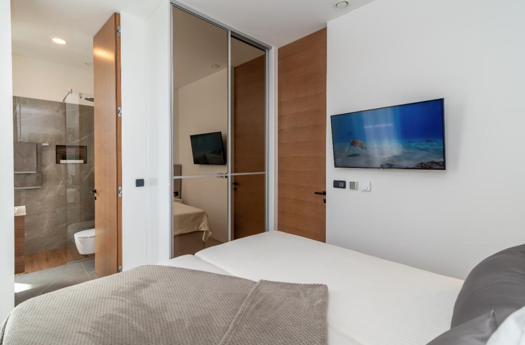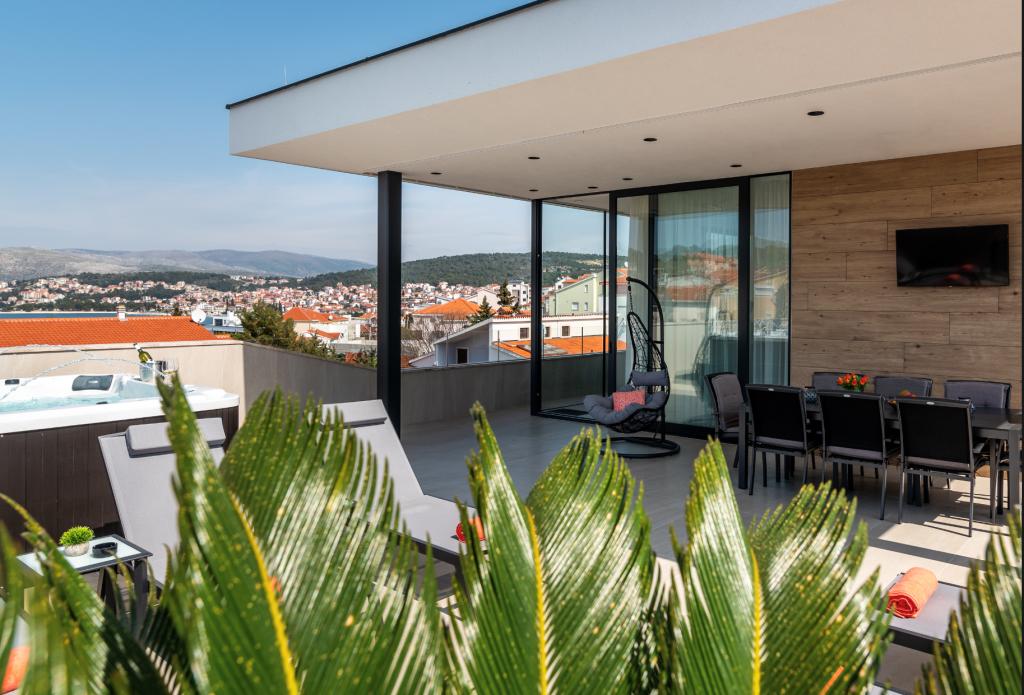 Penthouse Majestic to zupełnie nowe luksusowe arcydzieło ze szkła i stali z przestronnymi oknami oraz pięknym salonem i jadalnią. Z w pełni wyposażonej kuchni masz bezpośredni dostęp do fantastycznego tarasu 360° z widokiem na morze i gaj oliwny. Ciesz się dużym tarasem z panoramicznym widokiem, grillem gazowym, jadalnią, miejscem do opalania i naszym jacuzzi SPA dla 8 osób. Duży penthouse z tarasem o powierzchni 120 m2 zajmuje całe trzecie piętro. Przed wejściem znajdują się trzy bezpłatne miejsca parkingowe, stacja ładowania samochodów elektrycznych oraz mały garaż z prądem, który pomieści rowery, wózki dziecięce, przyczepki, deski surfingowe itp. Penthouse oferuje cztery eleganckie sypialnie dwuosobowe oraz łazienki z bezpośrednim wyjściem. wyjście na taras 360°, telewizor z płaskim ekranem i bezpłatne WiFi. Połączona sauna na podczerwień z prysznicem zapewnia dodatkowy relaks.