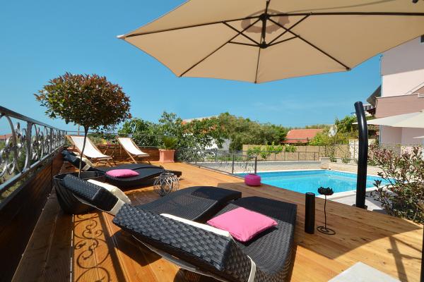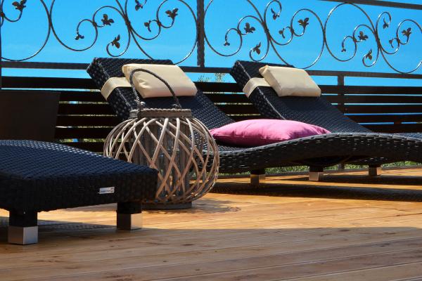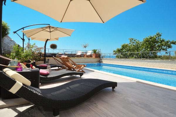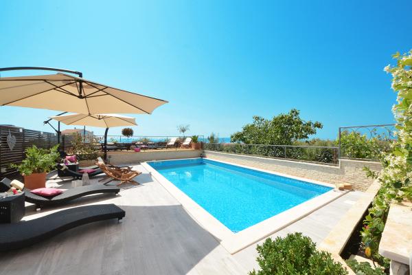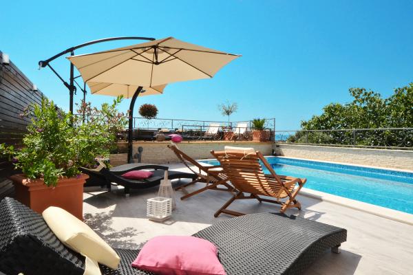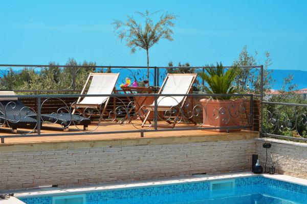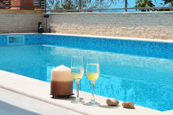 Przed domem znajduje się duży basen z hydromasażem o powierzchni 35 m2, wyposażony w leżaki, huśtawki, stół i krzesła oraz grill.