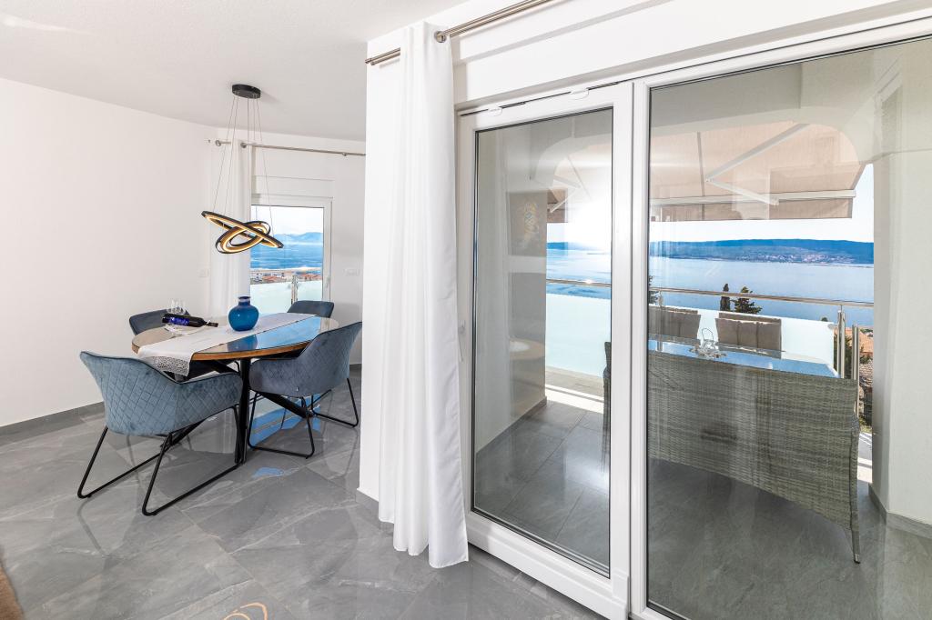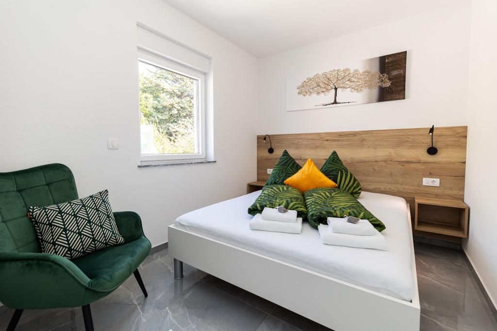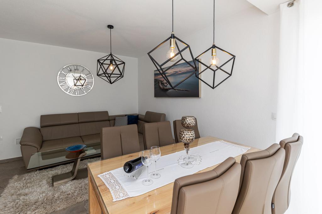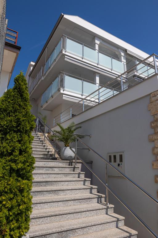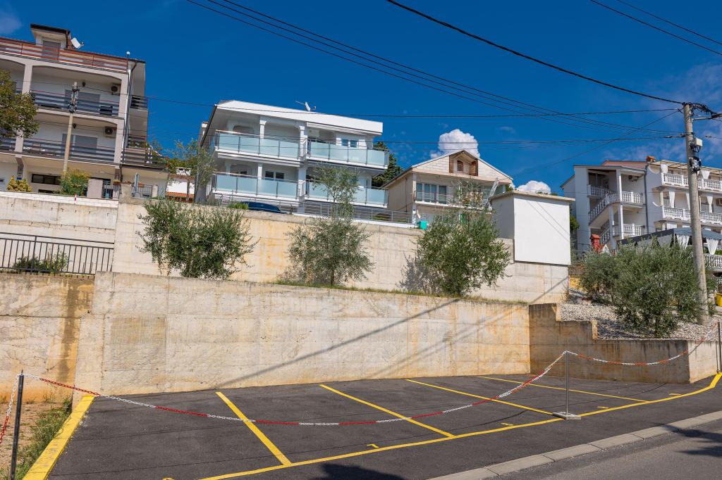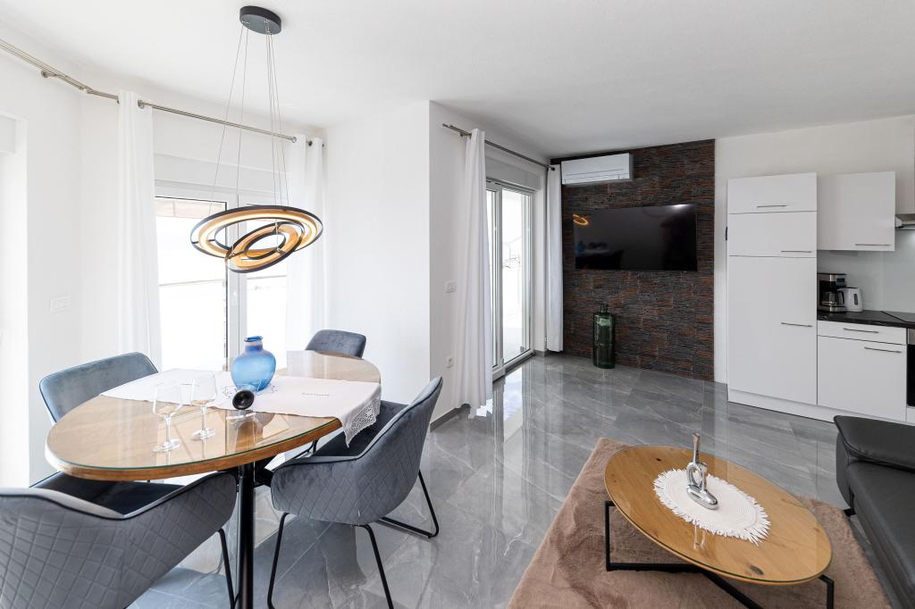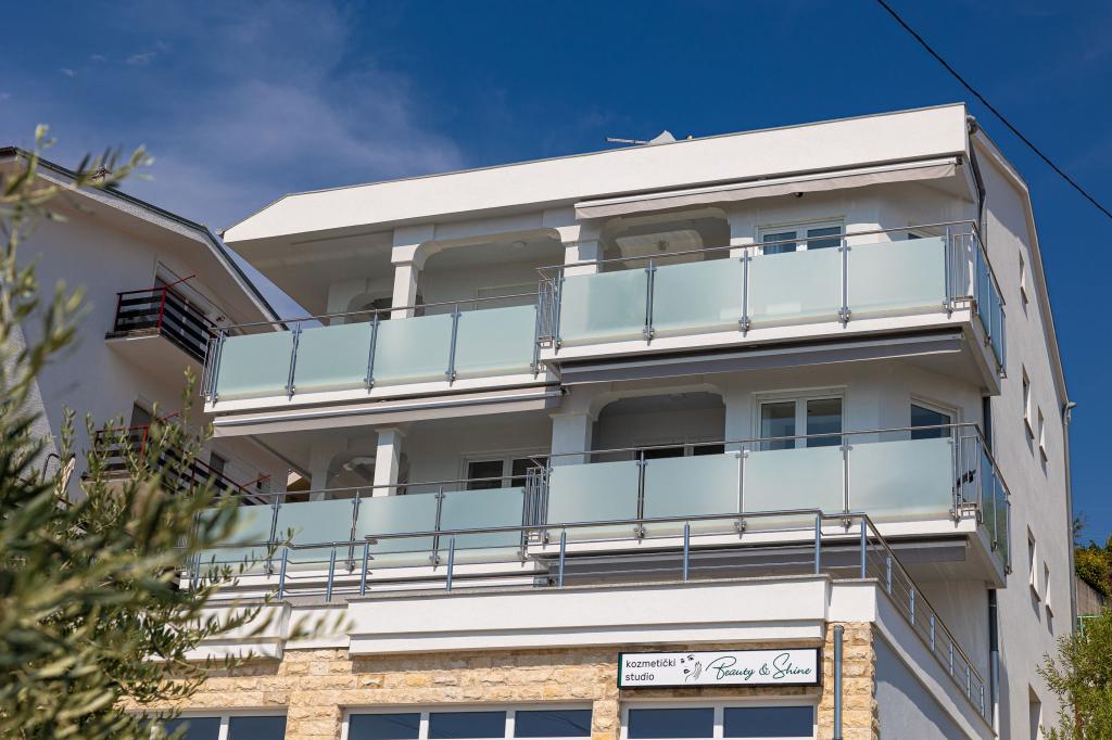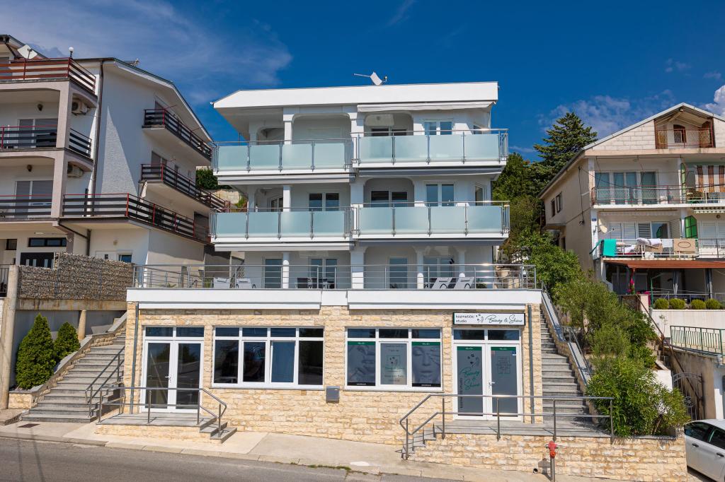Ten nowoczesny dom z apartamentami to idealny wybór na wakacje i życie nad morzem. Położony w spokojnej okolicy w mieście, oferuje prywatność i spokój, będąc jednocześnie blisko wszystkich niezbędnych udogodnień. Apartamenty są nowoczesne, wyposażone w najnowsze technologie i meble, a duże okna zapewniają piękny widok na morze. Wnętrze jest minimalistyczne, z naciskiem na wygodę i funkcjonalność, zapewniając idealne środowisko do relaksu. Dom znajduje się z dala od hałasu i tłumów, ale z szybkim dostępem do centrum miasta. Za domem znajduje się miejsce do grillowania, idealne na relaksujące spotkania na świeżym powietrzu. Obok domu znajdują się bezpłatne miejsca parkingowe, dzięki czemu parkowanie jest bezstresowe. Ten dom oferuje idealne połączenie nowoczesnego życia, prywatności i naturalnego otoczenia, z widokiem na morze i wszystkimi udogodnieniami, których pragnie każdy gość.