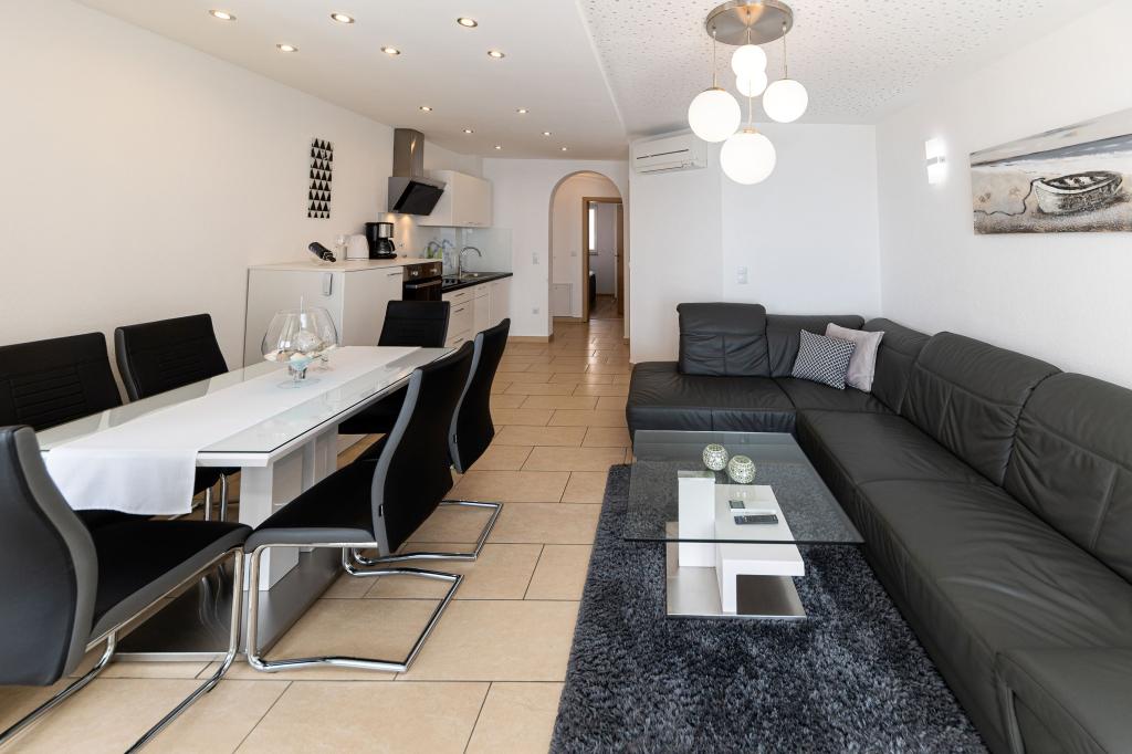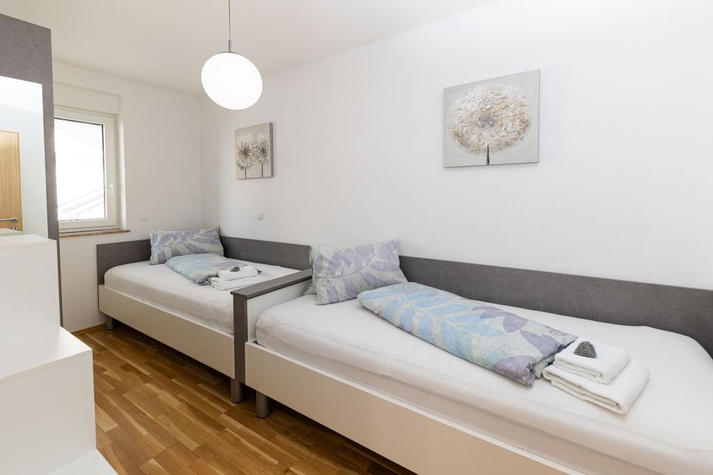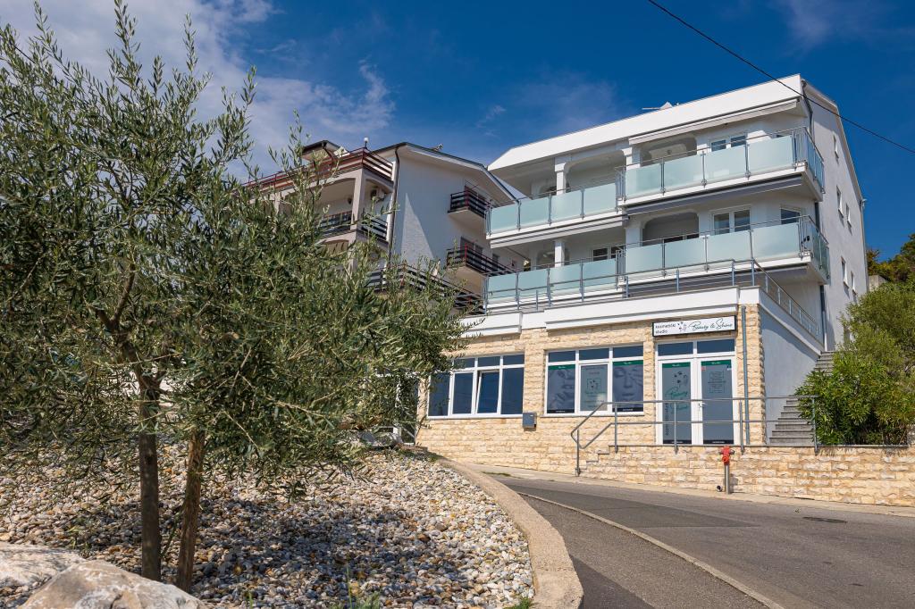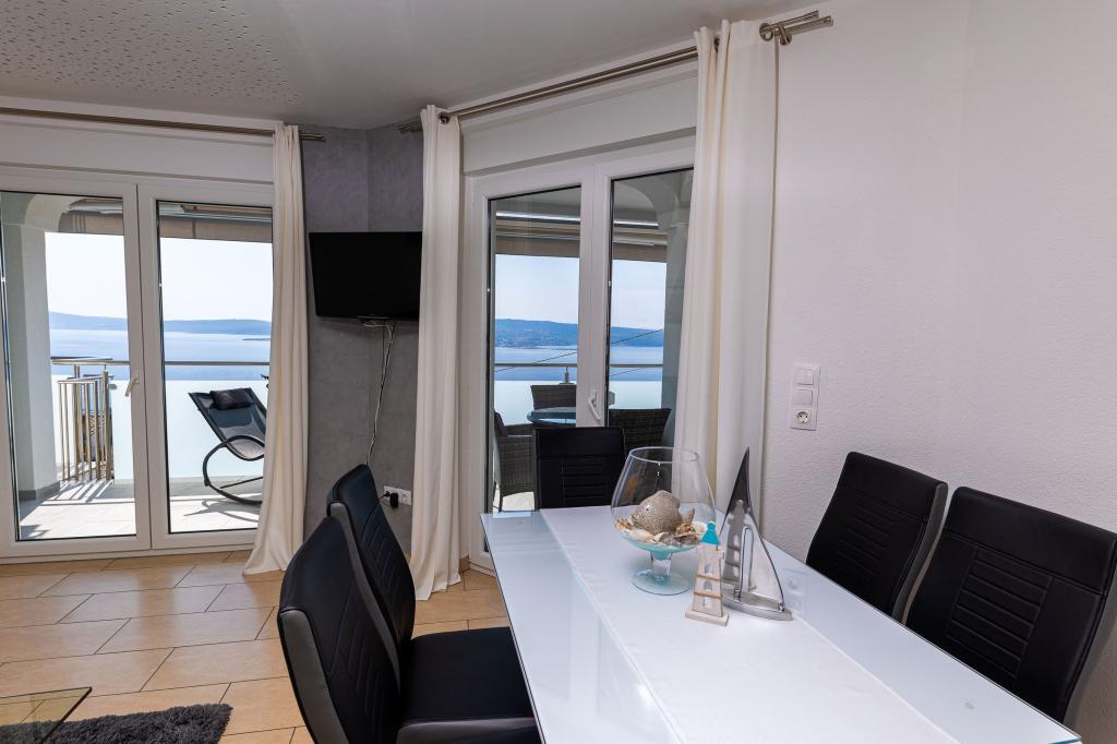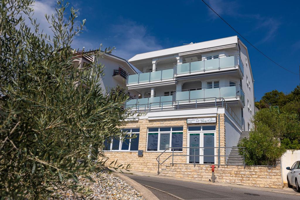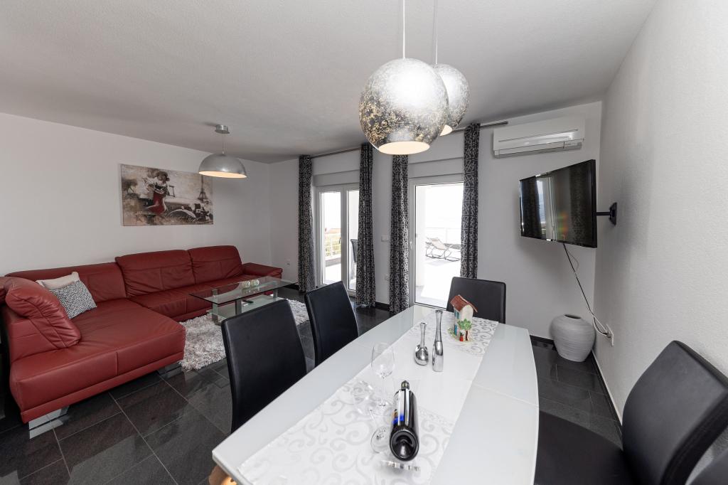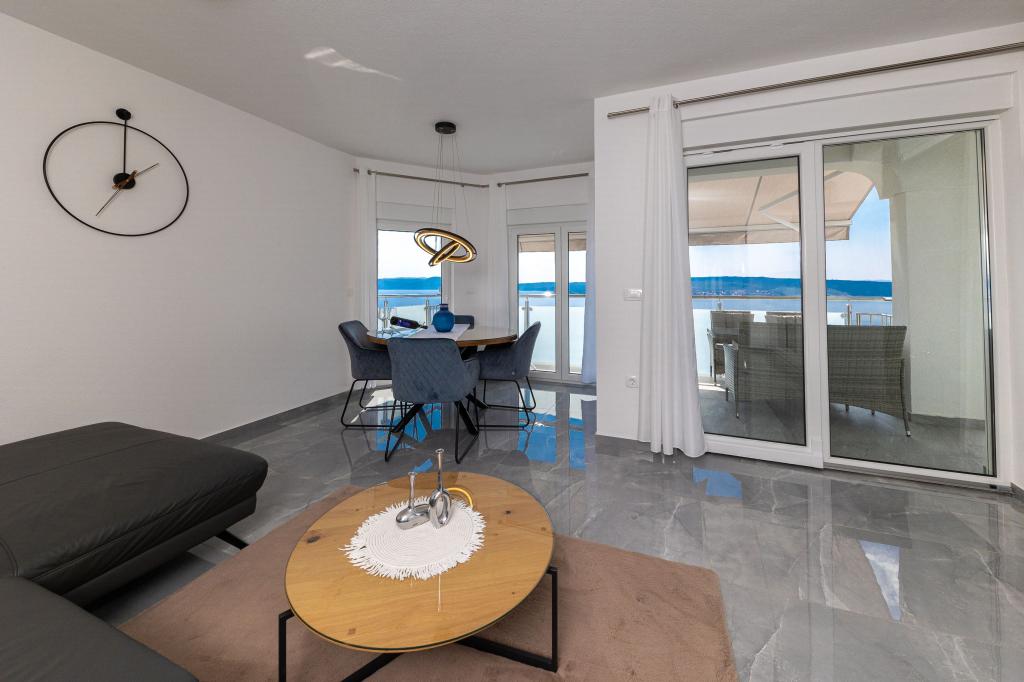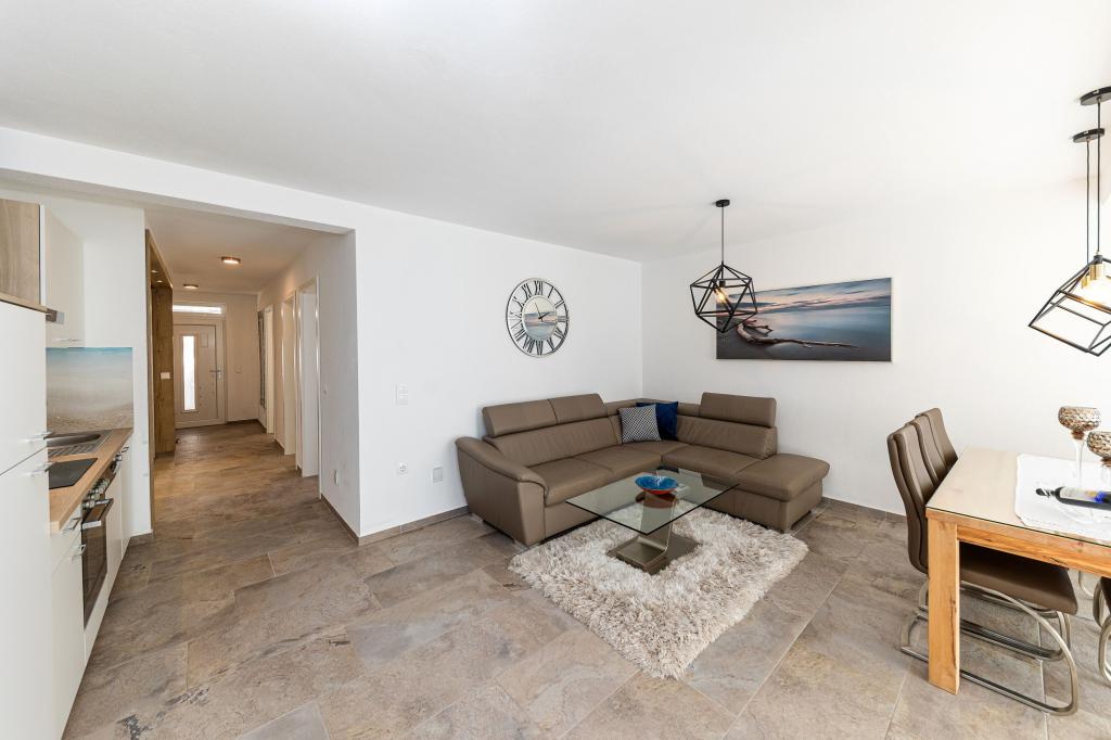 Ten nowoczesny dom z apartamentami to idealny wybór na wakacje i życie nad morzem. Położony w spokojnej okolicy w mieście, oferuje prywatność i spokój, będąc jednocześnie blisko wszystkich niezbędnych udogodnień. Apartamenty są nowoczesne, wyposażone w najnowsze technologie i meble, a duże okna zapewniają piękny widok na morze. Wnętrze jest minimalistyczne, z naciskiem na wygodę i funkcjonalność, zapewniając idealne środowisko do relaksu. Dom znajduje się z dala od hałasu i tłumów, ale z szybkim dostępem do centrum miasta. Za domem znajduje się miejsce do grillowania, idealne na relaksujące spotkania na świeżym powietrzu. Obok domu znajdują się bezpłatne miejsca parkingowe, dzięki czemu parkowanie jest bezstresowe. Ten dom oferuje idealne połączenie nowoczesnego życia, prywatności i naturalnego otoczenia, z widokiem na morze i wszystkimi udogodnieniami, których pragnie każdy gość.