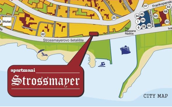 Apartamenty Strossmayer znajdują się na najpiękniejszej części starej Riwiery Crikvenica, przy promenadzie naprzeciwko plaży Balustrad na dworcach 2 i 3 przystanku Strossmayer, zaledwie 50 metrów od głównego placu miasta i starego portu oraz 100 metrów od głównej miejskiej plaży. Goście mają do swojej dyspozycji dwa nowo wyremontowane apartamenty KORANA z 4 gwiazdkami dla 2 osób z dodatkowym łóżkiem na 1. piętrze z widokiem na rynek i plażę, dwa apartamenty typu studio ZLATA z 3 gwiazdkami dla 2 osób z dodatkowym łóżkiem jedno z nich na 1. piętrze z widokiem na rynek i plażę, podczas gdy druga jest na drugiej połowie bez widoku na morze. Apartamenty nie mają parkingu, tak samo jak za dzień