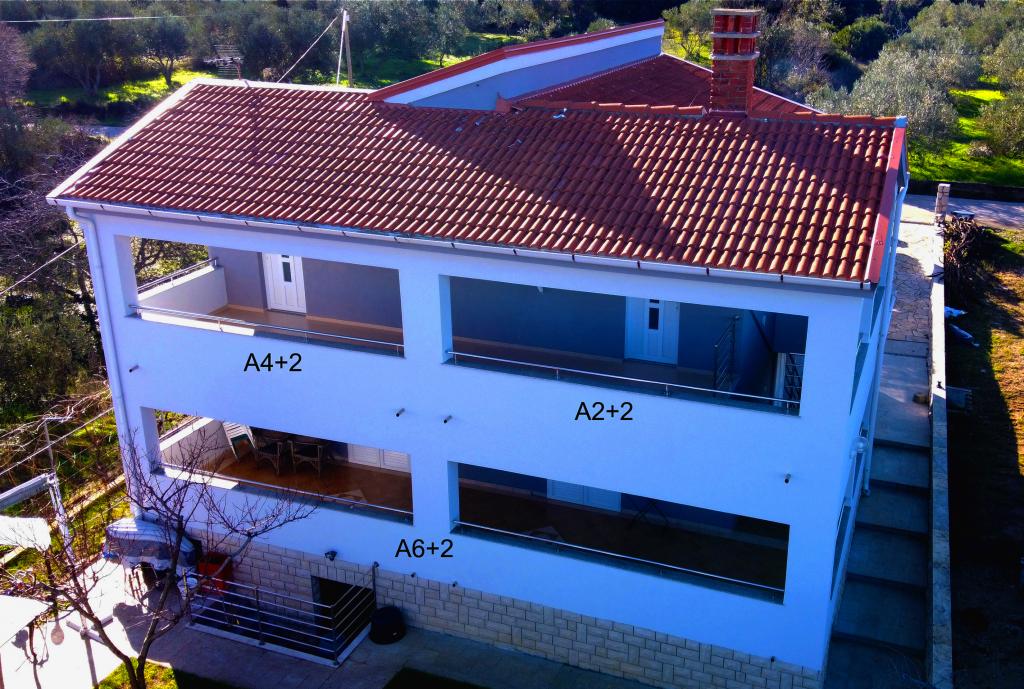 W budynku znajdują się 3 mieszkania. Największy A6 2 zajmuje cały parter, ok. 90m2, taras 30m2. Na pierwszym piętrze znajdują się apartamenty A4 2 i A2 2, każdy o powierzchni około 45 m2 ze wspólnym tarasem o powierzchni 30 m2. Z tarasów roztacza się widok na morze. Apartamenty są w pełni wyposażone i klimatyzowane. Obiekt znajduje się 50m od morza. Obiekt położony jest w odosobnionym miejscu. Plaża przed apartamentem jest betonowa, jest cień. Przed budynkiem znajduje się parking. Również duży grill / grill / rożen do bezpłatnego użytku przez gości. A także duży stół i ławy przed grillem. Miasto Dobropoljana oddalone jest od obiektu o 200 metrów. Do centrum miasta można dojść w 5 minut. W centrum znajdują się 2 sklepy, duża zagospodarowana piaszczysta plaża, pierwszorzędna restauracja, port dla statków. Przed budynkiem znajduje się miejsce do przywiązania łódki, a w Dobropoljanie łódkę można wsadzić lub wyciągnąć z morza na przyczepce.