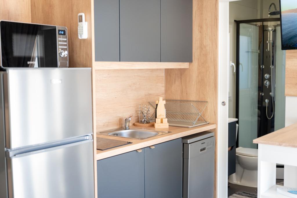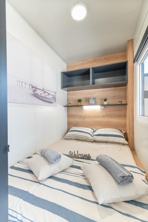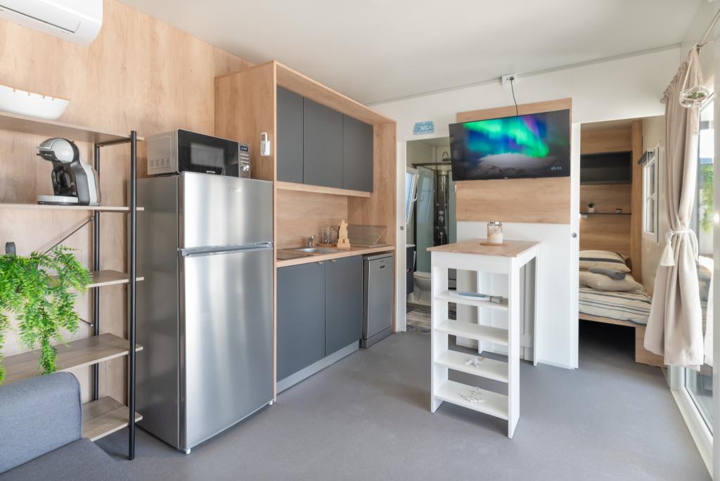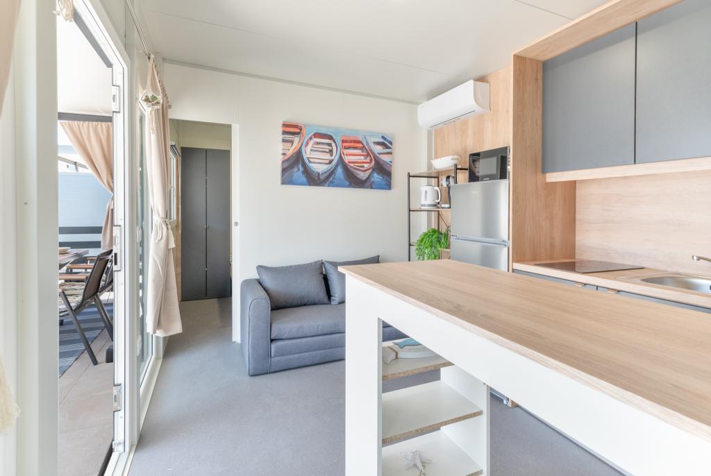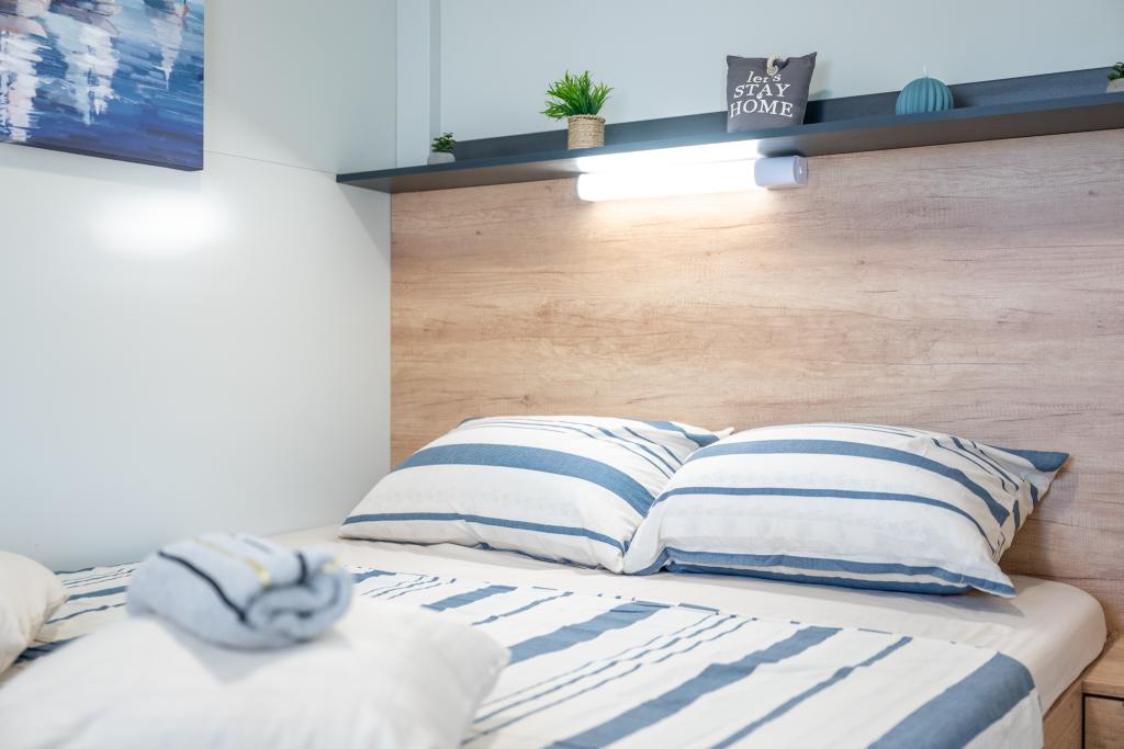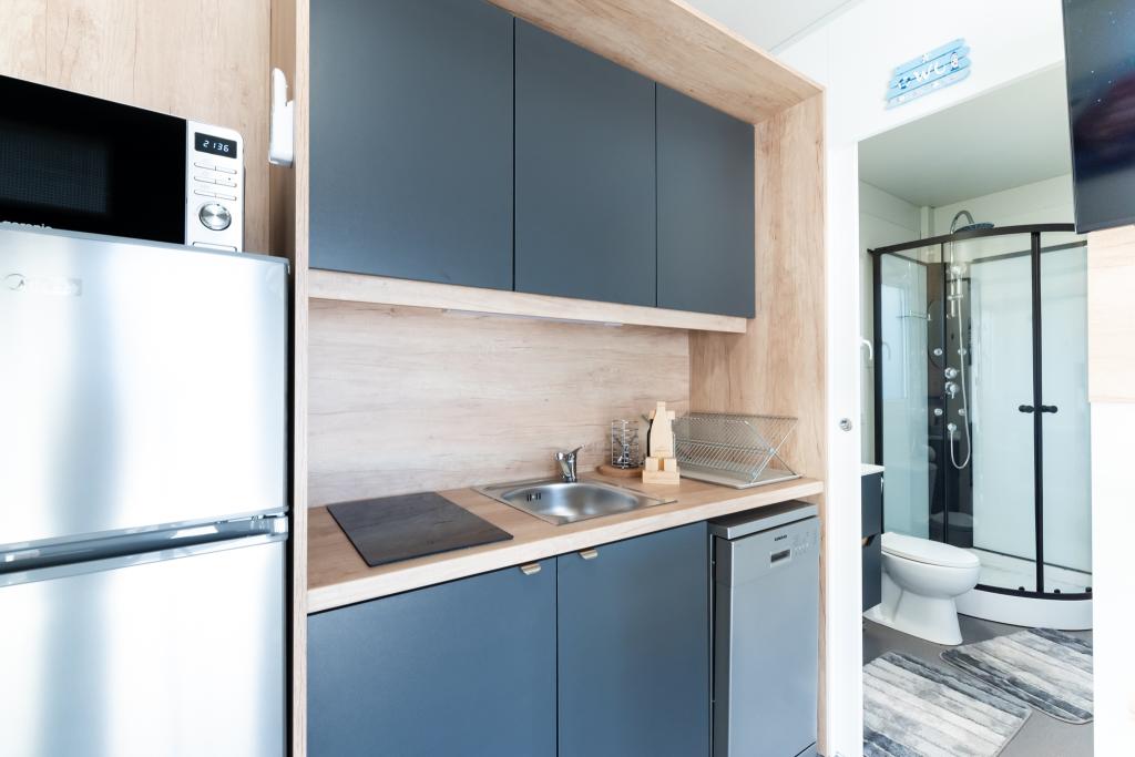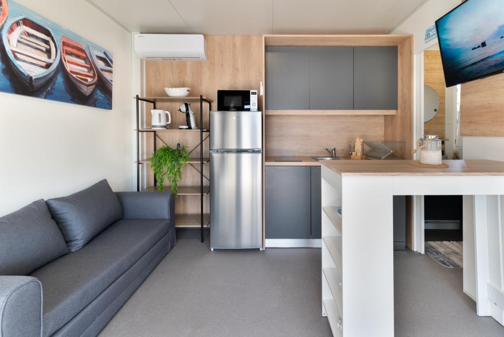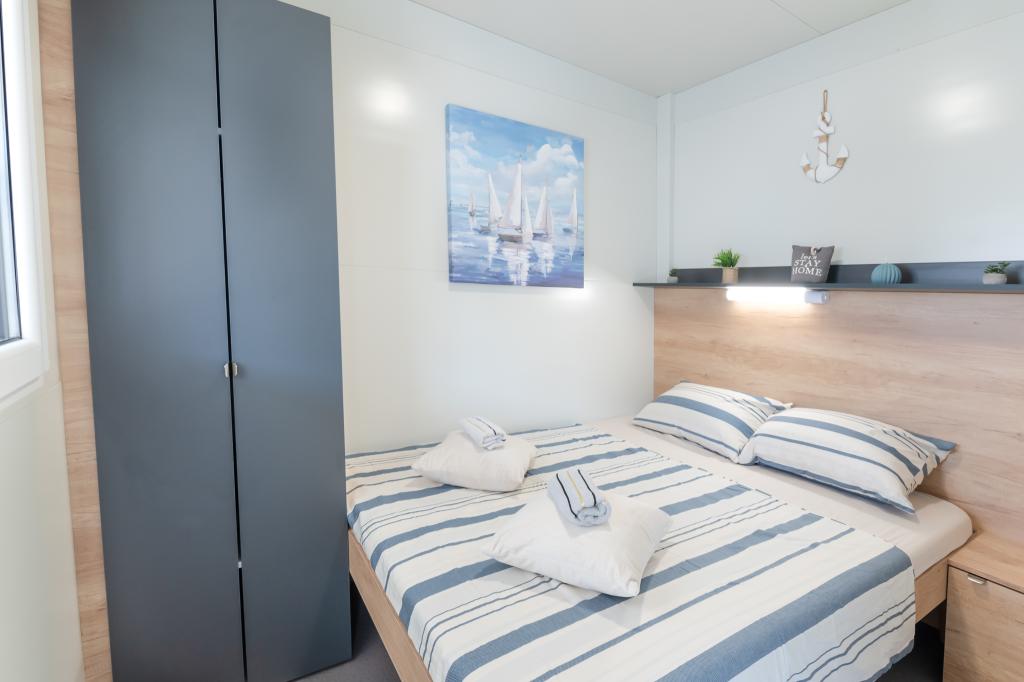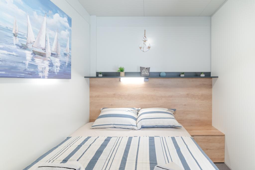 Odkryj idealne wakacje nad morzem w naszych uroczych domkach mobilnych, które znajdują się zaledwie 70 metrów od idyllicznej plaży Porat w spokojnym miasteczku Drage. Domki zapewniają optymalne połączenie komfortu i naturalnego otoczenia, idealne dla rodzin lub grup przyjaciół szukających spokojnego wypoczynku. Domy posiadają dwie sypialnie. W jednym znajduje się podwójne łóżko o wymiarach 160x200, natomiast w drugim pokoju znajduje się podwójne łóżko o wymiarach 140x200. Dodatkowo na rozkładanej sofie może spać dziecko do lat 5. Każdy pokój wyposażony jest w wygodne łóżka i świeżą pościel, zapewniając wypoczynek na jaki zasługujesz. Salon wyposażony jest w nowoczesne meble i telewizor, idealny do wieczornego relaksu. Kuchnia jest w pełni wyposażona we wszystkie niezbędne sprzęty, m.in. lodówkę, kuchenkę, ekspres do kawy, czajnik i kuchenkę mikrofalową, co pozwala na przygotowanie posiłków według własnego gustu. Rozkoszuj się poranną kawą lub wieczornym drinkiem na przestronnym tarasie o powierzchni aż 24m²!