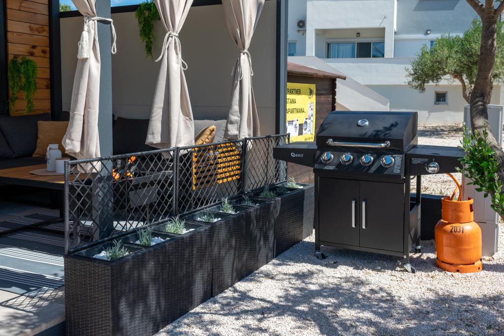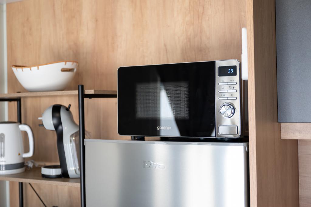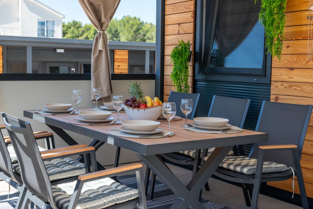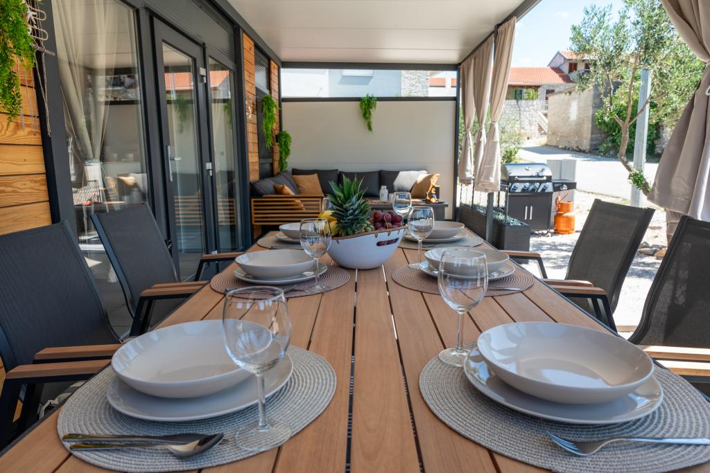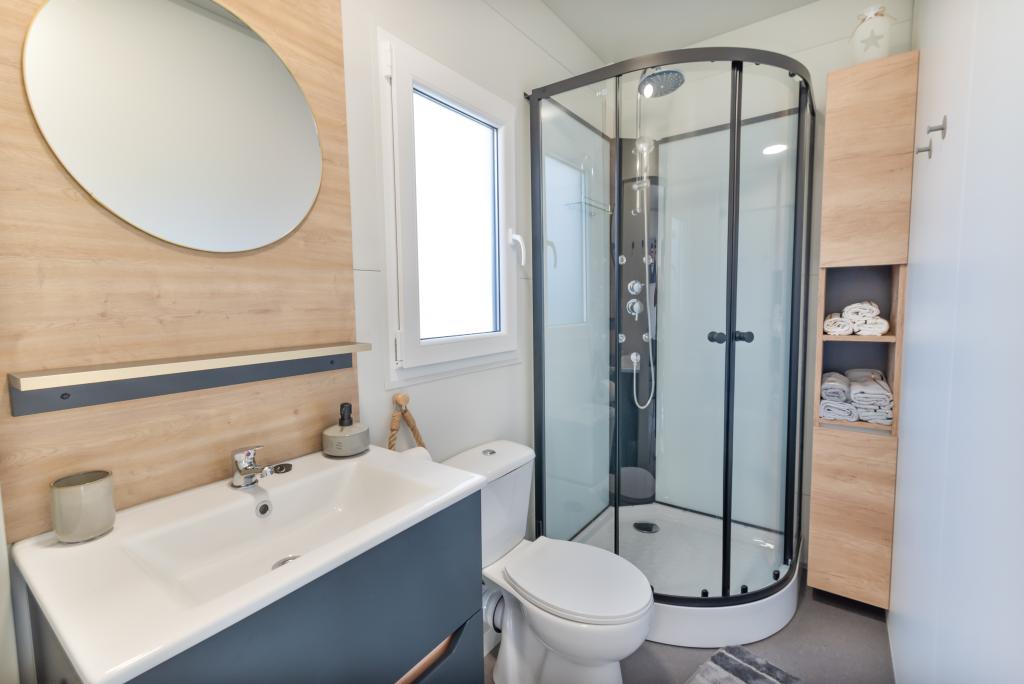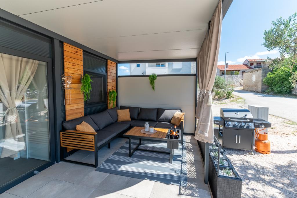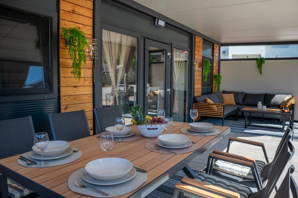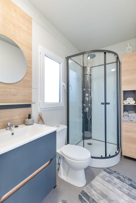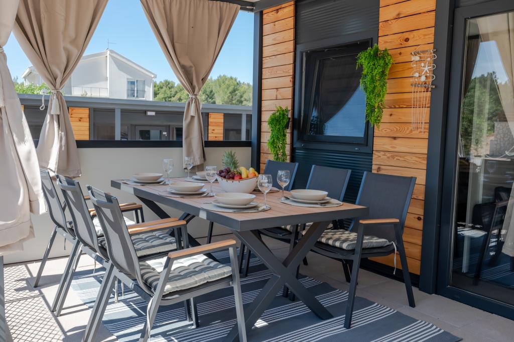 Odkryj idealne wakacje nad morzem w naszych uroczych domkach mobilnych, które znajdują się zaledwie 70 metrów od idyllicznej plaży Porat w spokojnym miasteczku Drage. Domki zapewniają optymalne połączenie komfortu i naturalnego otoczenia, idealne dla rodzin lub grup przyjaciół szukających spokojnego wypoczynku. Domy posiadają dwie sypialnie. W jednym znajduje się podwójne łóżko o wymiarach 160x200, natomiast w drugim pokoju znajduje się podwójne łóżko o wymiarach 140x200. Dodatkowo na rozkładanej sofie może spać dziecko do lat 5. Każdy pokój wyposażony jest w wygodne łóżka i świeżą pościel, zapewniając wypoczynek na jaki zasługujesz. Salon wyposażony jest w nowoczesne meble i telewizor, idealny do wieczornego relaksu. Kuchnia jest w pełni wyposażona we wszystkie niezbędne sprzęty, m.in. lodówkę, kuchenkę, ekspres do kawy, czajnik i kuchenkę mikrofalową, co pozwala na przygotowanie posiłków według własnego gustu. Rozkoszuj się poranną kawą lub wieczornym drinkiem na przestronnym tarasie o powierzchni aż 24m²!