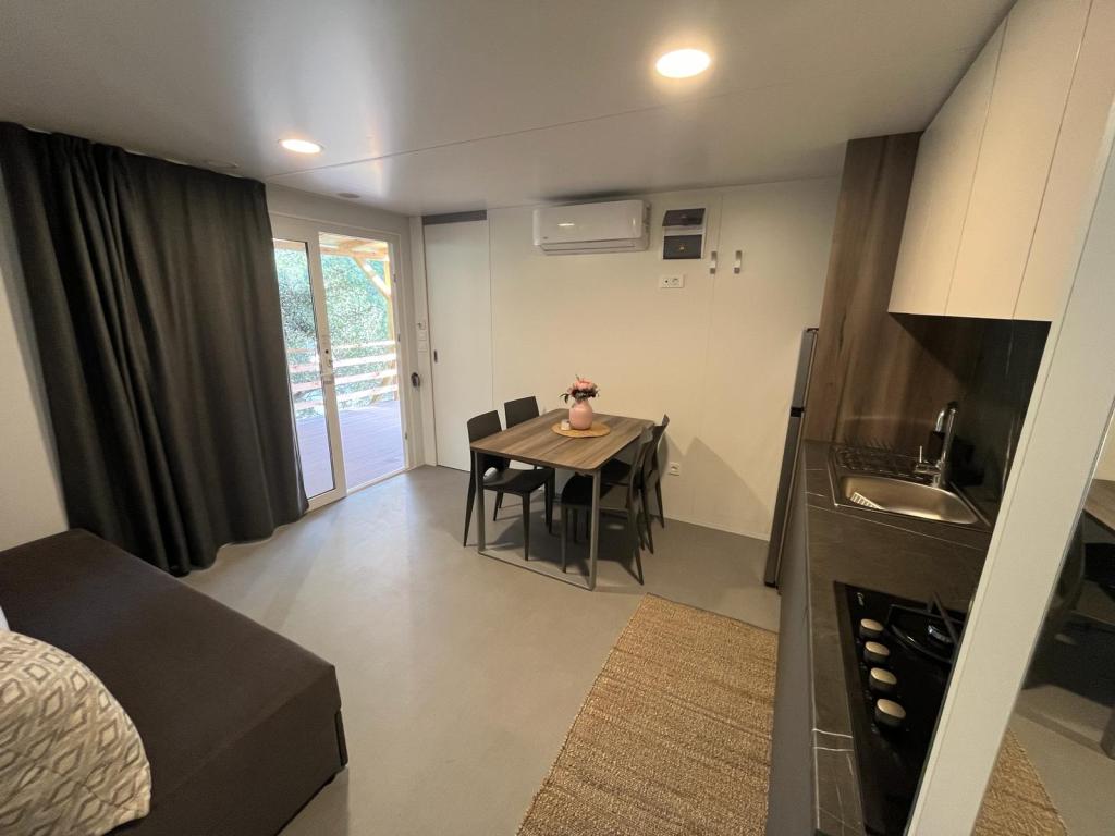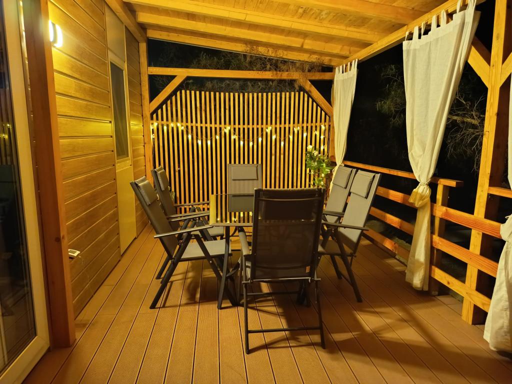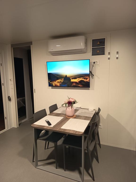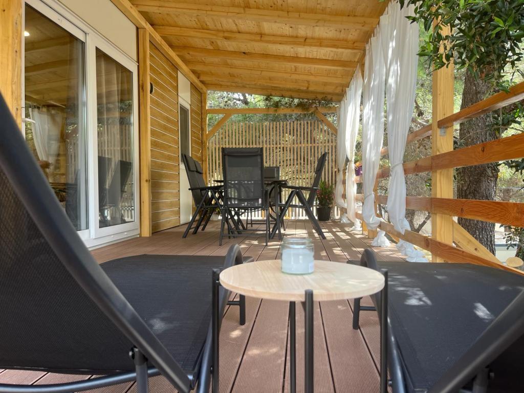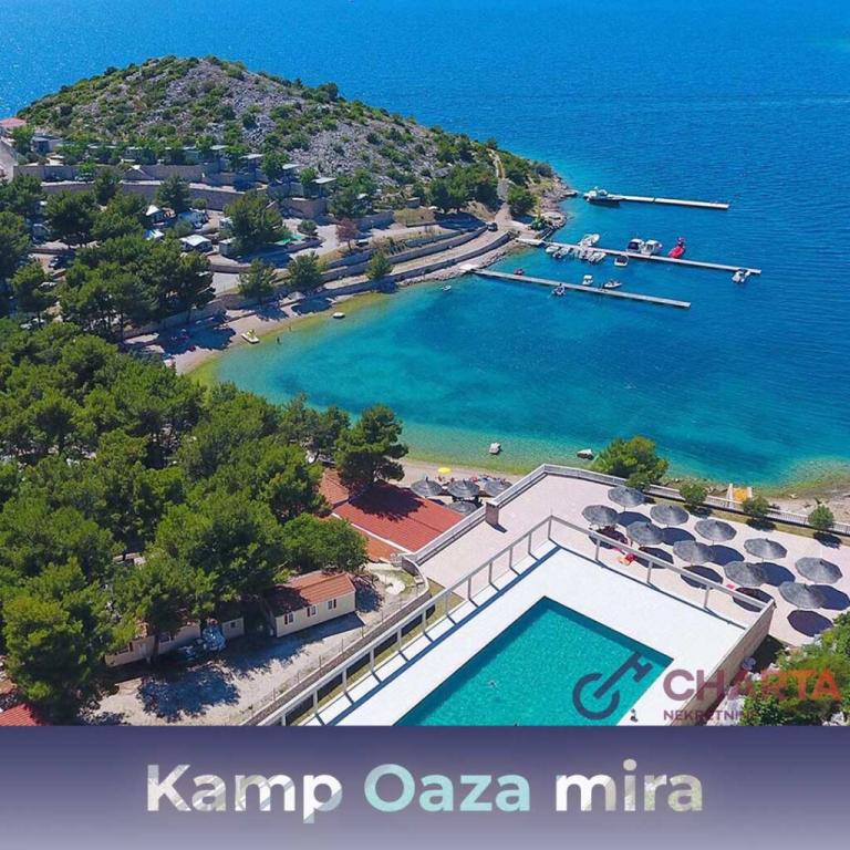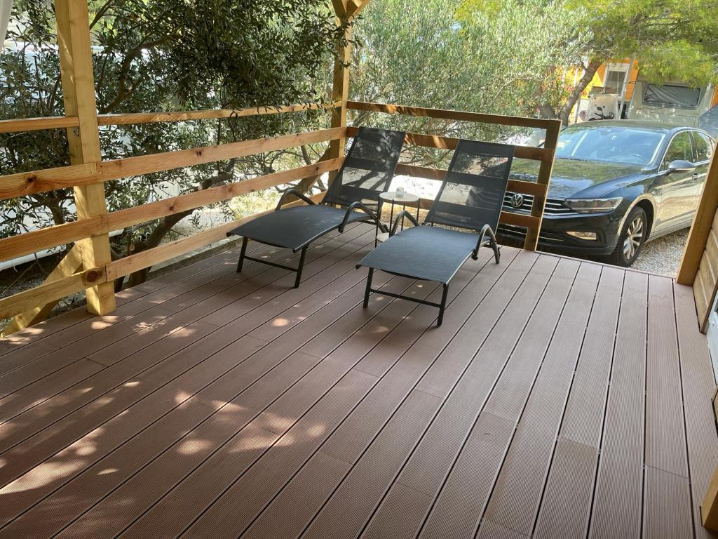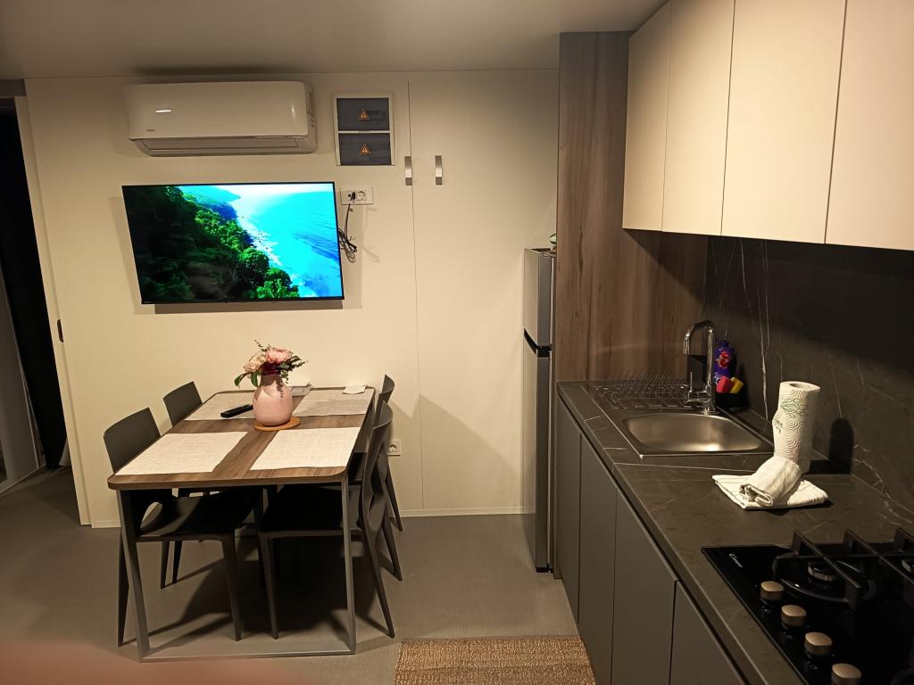 Domek mobilny o powierzchni 35m2 z tarasem o powierzchni 24m2, nowy, w pełni wyposażony, znajduje się na terenie kempingu Oaza Mira. Kemping jest sklasyfikowany jako 4****. Na terenie kempingu znajduje się węzeł sanitarny z możliwością korzystania z pralki, korty tenisowe, plac zabaw dla dzieci, restauracja, kawiarnie, basen. W pobliżu kempingu znajduje się również kilka plaż z błękitną flagą, marina, promenady. Odległość od kempingu: - Pakoštane 4 km - Biograd na Moru - Jezioro Vransko 3 km - Zadar 39 km - Park Narodowy Krka 36 km - Šibenik 24 km - Vodice 20 km Dom oferuje: - pokój z łóżkiem małżeńskim 160x200 cm - pokój z dwoma pojedynczymi łóżkami 90x200 cm - salon z rozkładaną sofą dla 2 osób - 2 łazienki z prysznicem i toaletą - kuchnię wyposażoną dla 6 osób - lodówkę z zamrażarką - czajnik elektryczny - płytę ceramiczną z 4 palnikami gazowymi - zmywarkę - Wi-Fi, Smart TV + Netflix - stół jadalny + 4 krzesła - 2 leżaki, stół i 6 krzeseł - 2 miejsca parkingowe przed domem mobilnym, - pościel i ręczniki