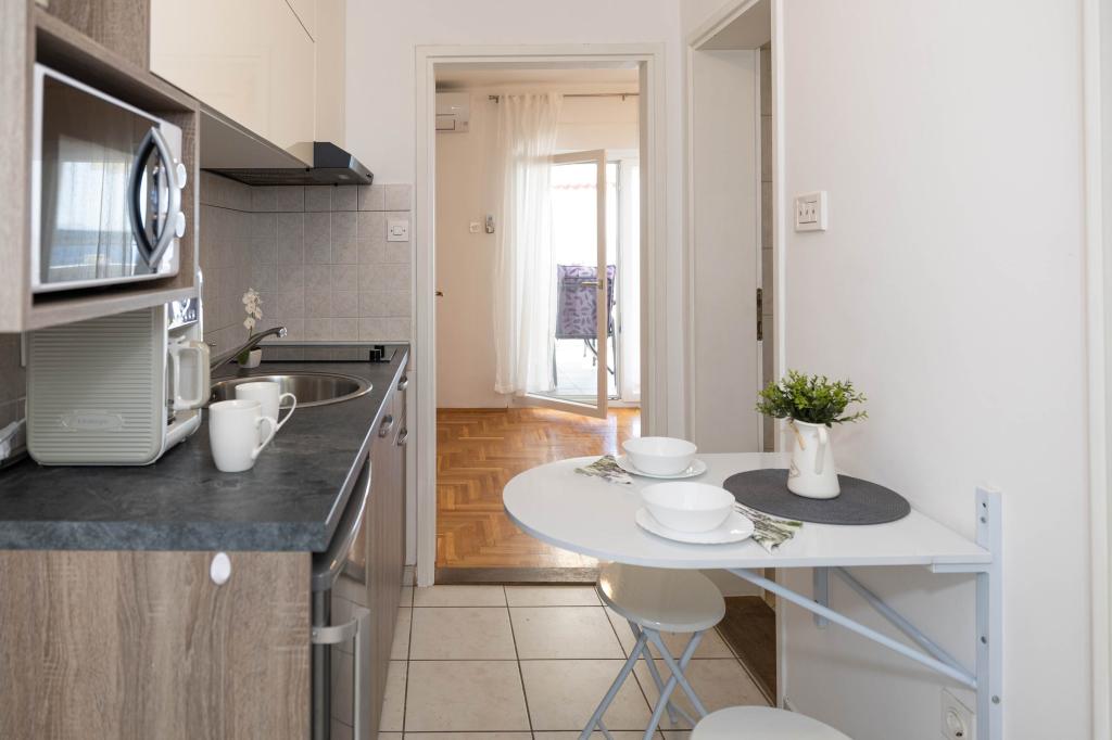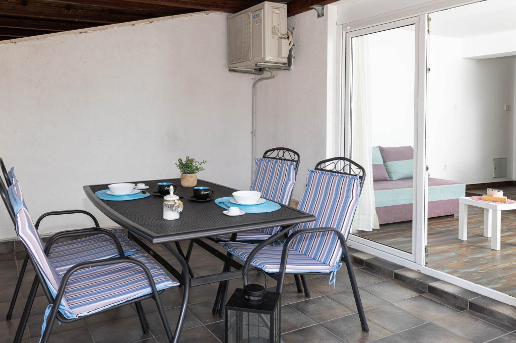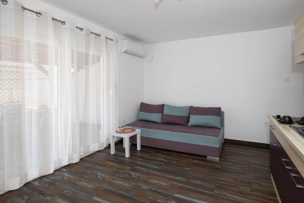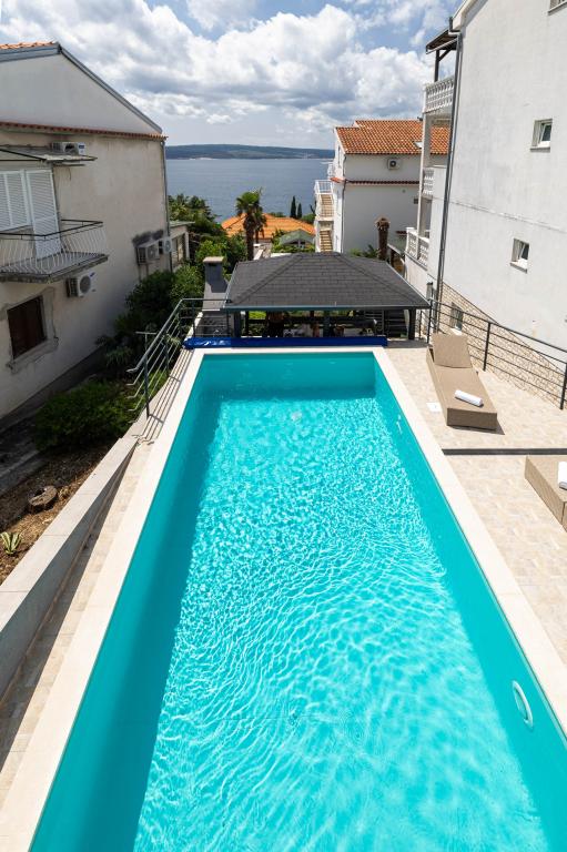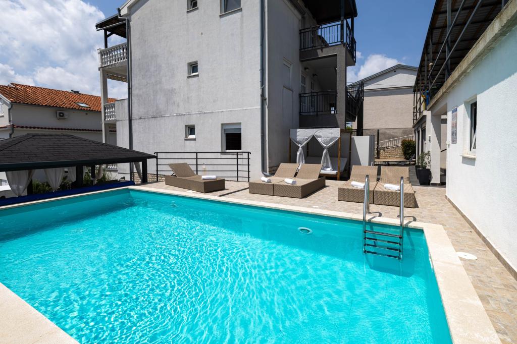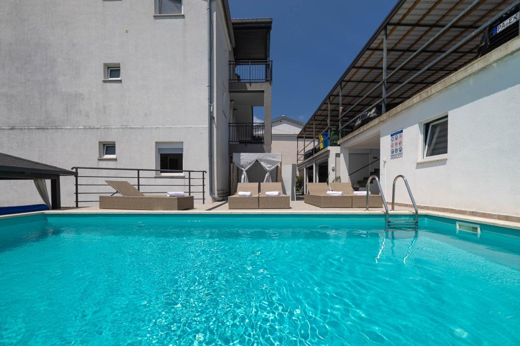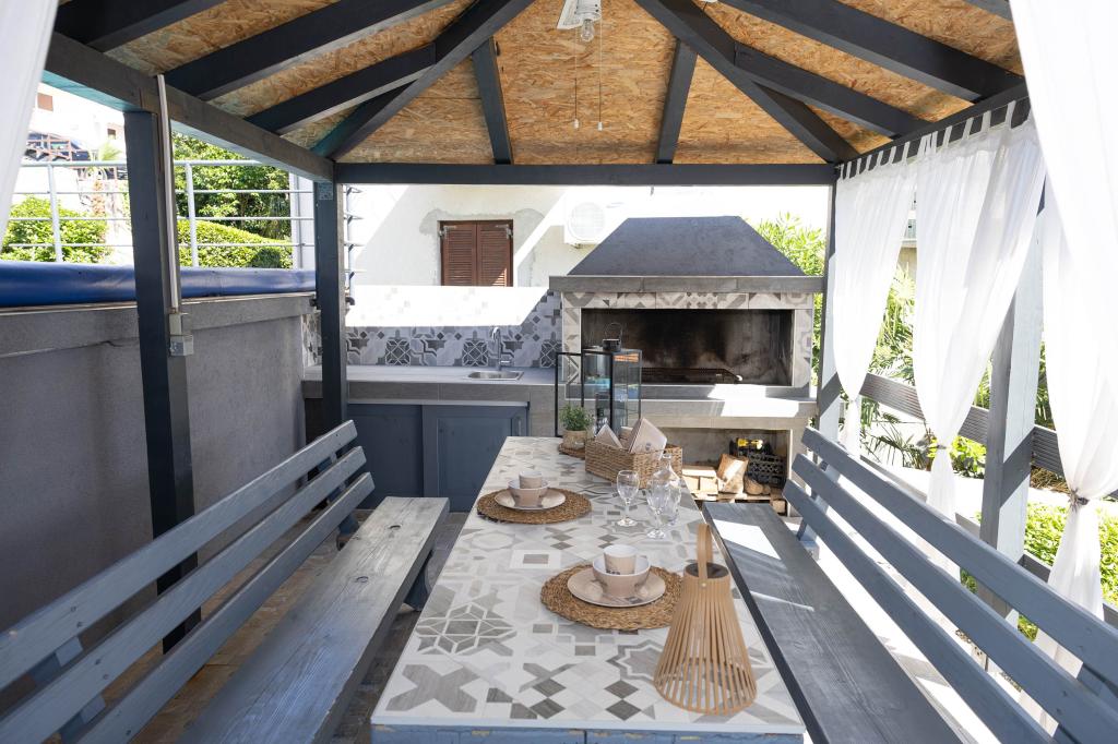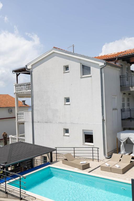 Nasz obiekt położony jest w drugim rzędzie od morza, co sprawia, że jest to idealne miejsce na relaksujący letni wypoczynek. Dom posiada sześć nowocześnie urządzonych apartamentów z widokiem na morze, wyposażonych tak, aby zapewnić przyjemny pobyt. Wszystkie apartamenty posiadają wyposażoną kuchnię z czajnikiem, ekspresem do kawy, tosterem i kuchenką mikrofalową. Łazienki wyposażone są w prysznic, toaletę i suszarkę do włosów. Na dziedzińcu znajdują się liczne udogodnienia umożliwiające relaks i rozrywkę. Do dyspozycji gości jest basen o wymiarach 7 x 3,5 m z leżakami, wanną z hydromasażem, prysznicem i altaną z grillem. Grill wyposażony jest w zlew i wszystkie niezbędne przybory kuchenne. W altanie znajduje się duży stół z dwiema ławkami, idealny na spotkania w większym gronie. W zadaszonej części podwórka znajduje się stół bilardowy, rzutki, gry planszowe i mała biblioteczka z książkami. Przed domem znajduje się zadaszony parking, na każdy apartament przypada jedno miejsce parkingowe. Apartamenty są rozmieszczone w następujący sposób: A1 i A2 na parterze, A3 na pierwszym piętrze, A5 na drugim piętrze oraz A7 i A8 na trzecim piętrze. Powitanie!!!