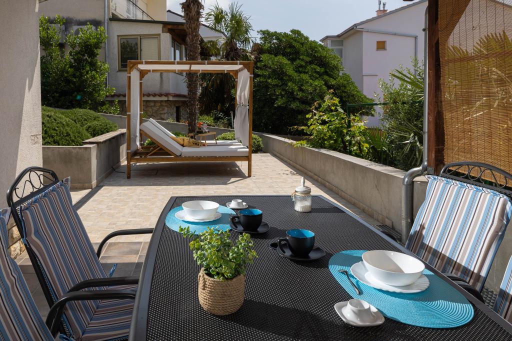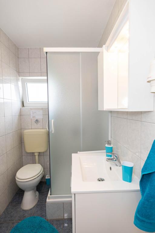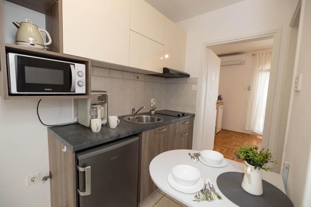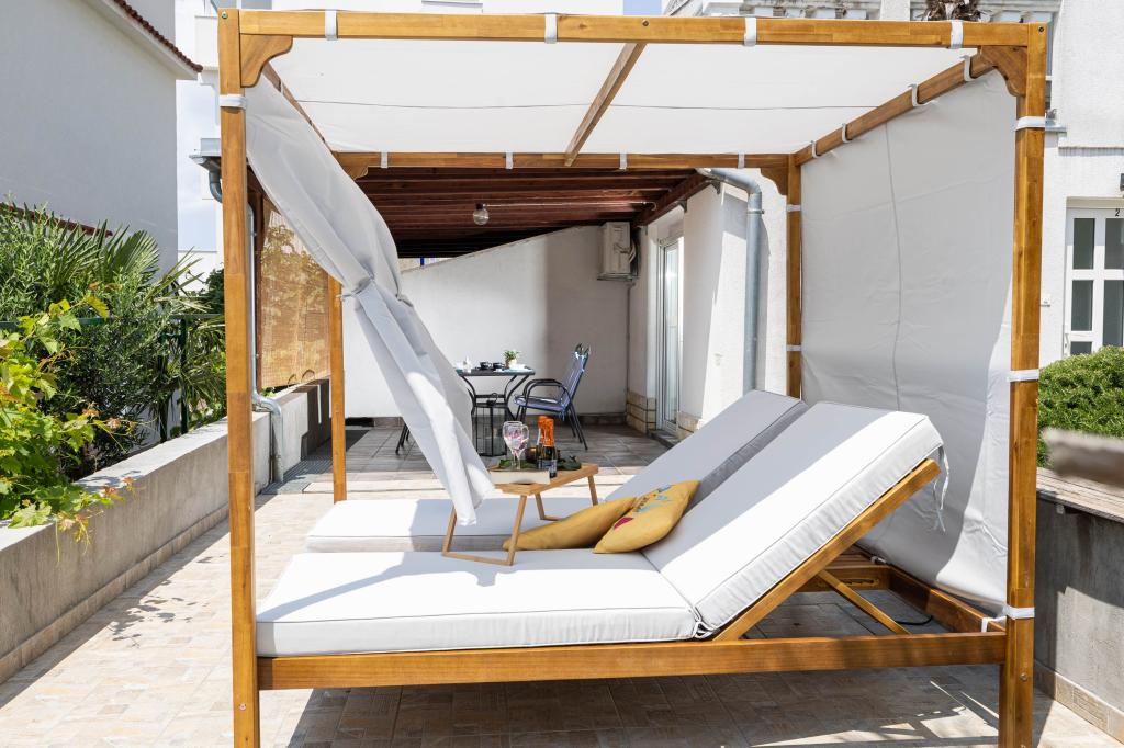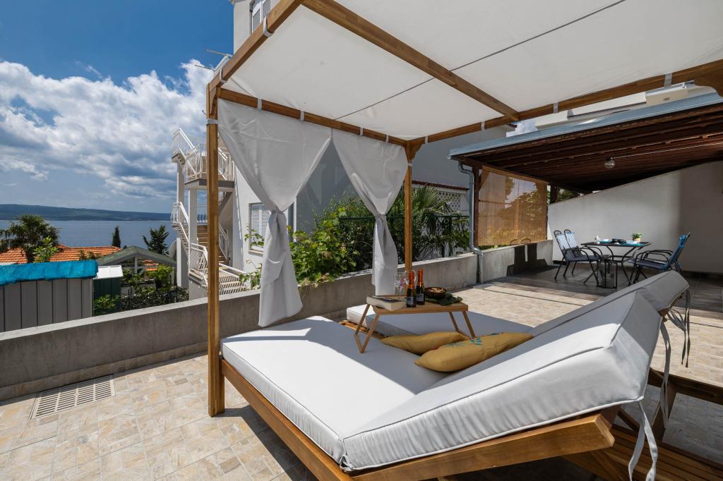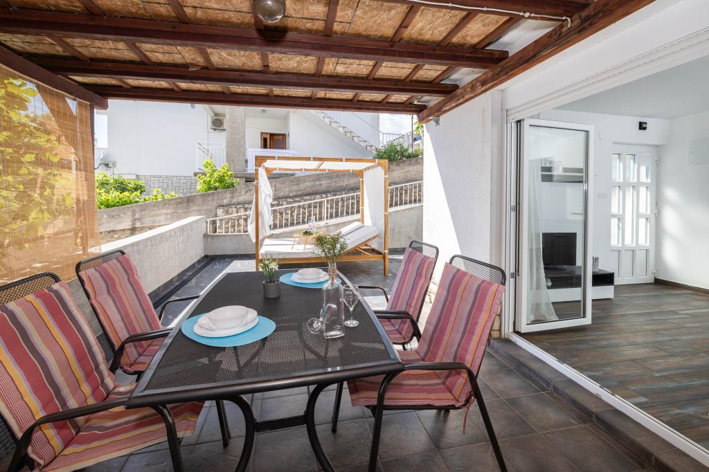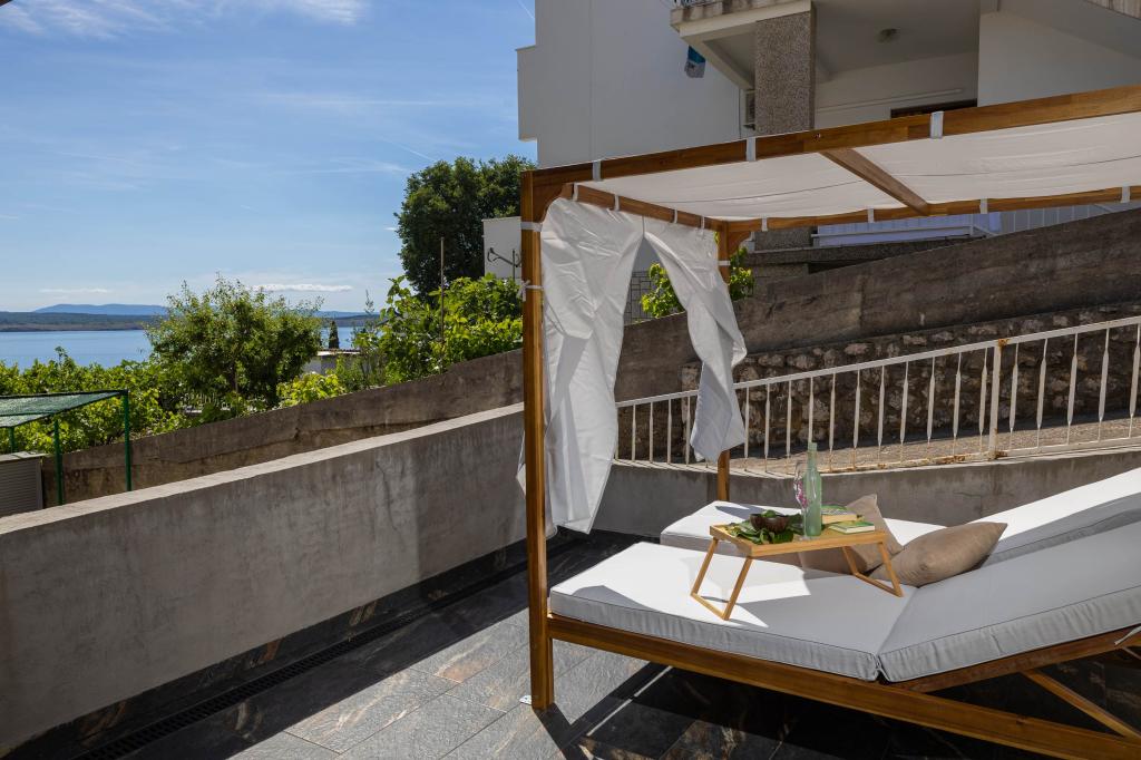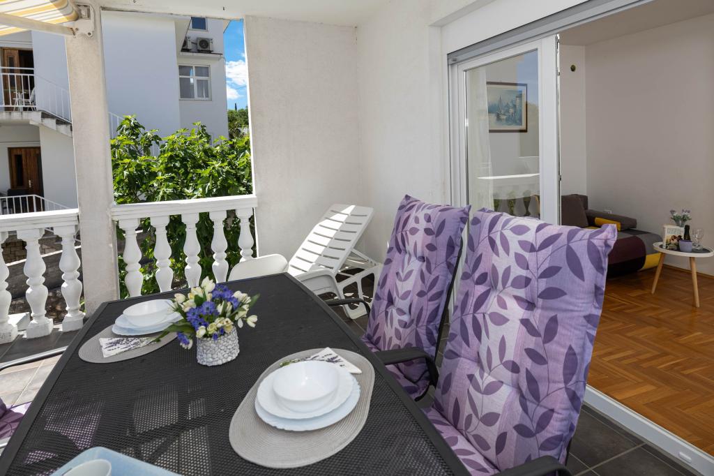 Nasz obiekt położony jest w drugim rzędzie od morza, co sprawia, że jest to idealne miejsce na relaksujący letni wypoczynek. Dom posiada sześć nowocześnie urządzonych apartamentów z widokiem na morze, wyposażonych tak, aby zapewnić przyjemny pobyt. Wszystkie apartamenty posiadają wyposażoną kuchnię z czajnikiem, ekspresem do kawy, tosterem i kuchenką mikrofalową. Łazienki wyposażone są w prysznic, toaletę i suszarkę do włosów. Na dziedzińcu znajdują się liczne udogodnienia umożliwiające relaks i rozrywkę. Do dyspozycji gości jest basen o wymiarach 7 x 3,5 m z leżakami, wanną z hydromasażem, prysznicem i altaną z grillem. Grill wyposażony jest w zlew i wszystkie niezbędne przybory kuchenne. W altanie znajduje się duży stół z dwiema ławkami, idealny na spotkania w większym gronie. W zadaszonej części podwórka znajduje się stół bilardowy, rzutki, gry planszowe i mała biblioteczka z książkami. Przed domem znajduje się zadaszony parking, na każdy apartament przypada jedno miejsce parkingowe. Apartamenty są rozmieszczone w następujący sposób: A1 i A2 na parterze, A3 na pierwszym piętrze, A5 na drugim piętrze oraz A7 i A8 na trzecim piętrze. Powitanie!!!