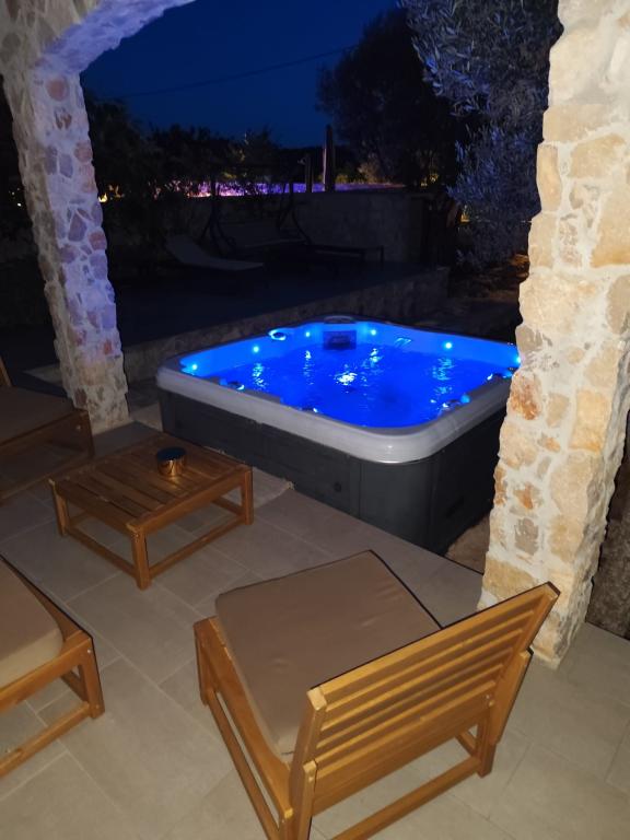 Piękne, naturalne i spokojne miejsce. Dom z jacuzzi do wynajęcia na wyspie Drvenik Mali, około 150 metrów od morza. Dom składa się z dwóch sypialni, salonu z kuchnią i jadalnią oraz łazienki. Najpiękniejszą częścią domu jest taras z kominkiem i kamiennym grillem. Drvenik Mali, otoczony czystymi wodami Morza Adriatyckiego, to wyspa położona niedaleko Trogiru i Splitu. Połączona jest z nią małym promem, który kursuje cztery razy dziennie w sezonie. Drvenik Mali to bardzo spokojna wyspa, pełna spokoju, wyjątkowego piękna przyrody i wyjątkowo czystego morza. To idealne miejsce na wakacje „z dala od miejskiego zgiełku” i prawdziwe wyzwanie dla każdego współczesnego Robinsona. Jeśli szukasz bujnej śródziemnomorskiej roślinności, oryginalnej atmosfery i autentycznego wyspiarskiego klimatu, Drvenik Mali to idealny wybór dla Ciebie.