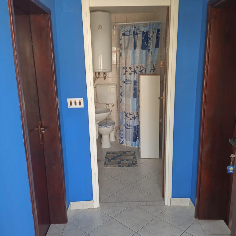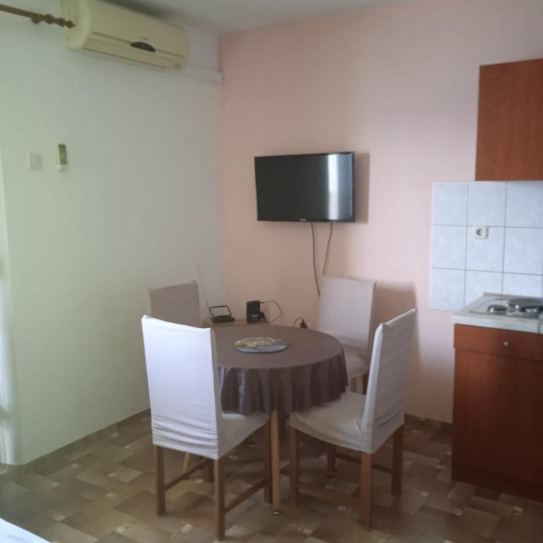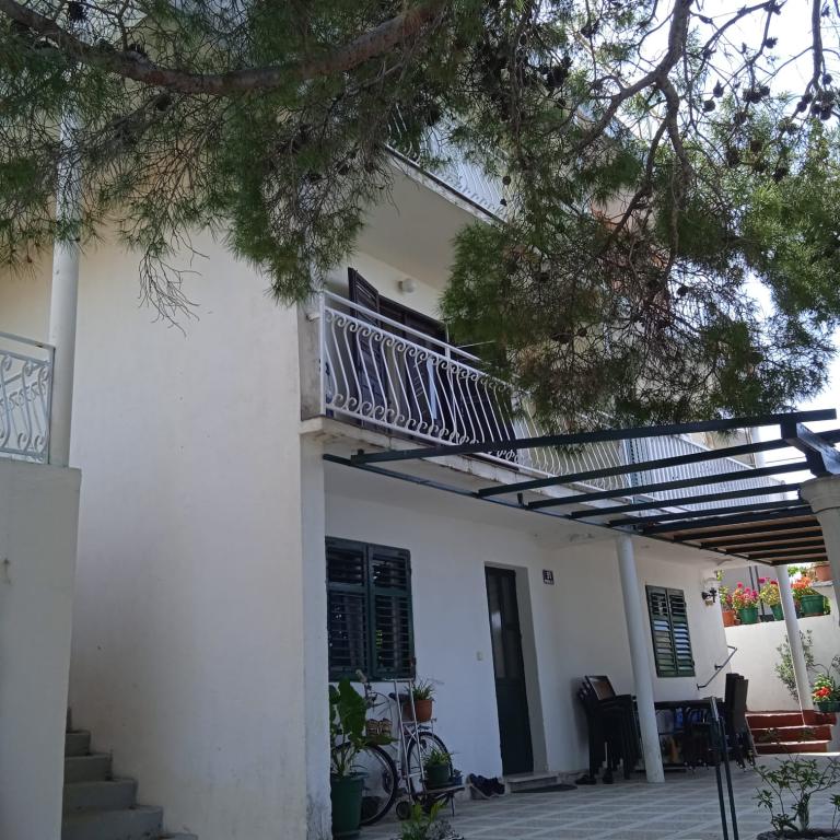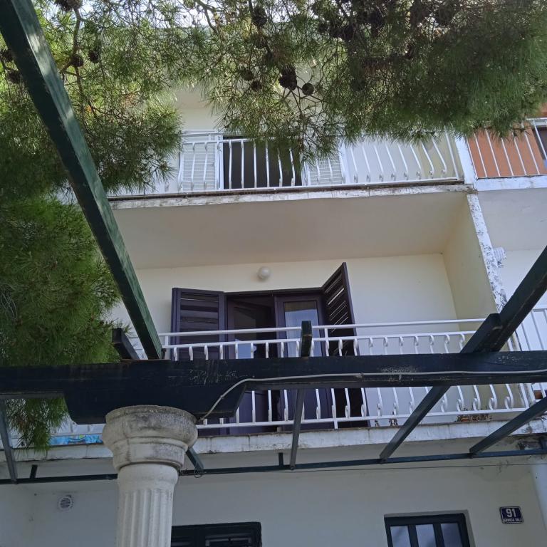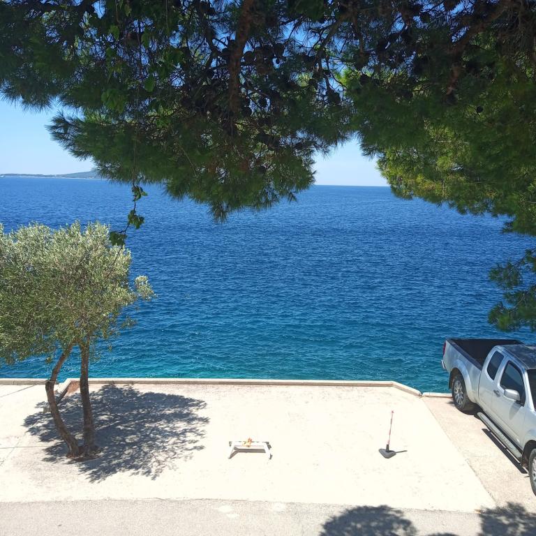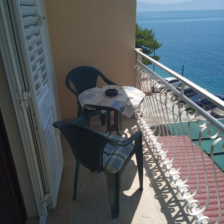 Apartament rodzinny (2+2) dla czterech osób znajduje się w domu położonym w pierwszym rzędzie od morza. Mieszkanie znajduje się na drugim piętrze i posiada osobne wejście, co zapewnia prywatność. Widok na morze roztacza się z balkonu i tarasu, które prowadzą do apartamentu. Możliwość parkowania wzdłuż drogi przed domem, w którym znajduje się apartament. (Wliczone w cenę noclegu.) Apartament składa się z dwóch niezależnych pokoi i łazienki. Aneks kuchenny znajduje się w większym pomieszczeniu (z balkonem) i jest wyposażony w naczynia oraz inne przybory kuchenne. Lodówka znajduje się również w drugim pomieszczeniu. Apartament wyposażony jest w klimatyzację i telewizor. Dostępna jest sieć Wi-Fi. Nie ma żadnych dodatkowych kosztów. Apartament odpowiedni jest dla rodziny z dwójką dzieci lub dwóch par.