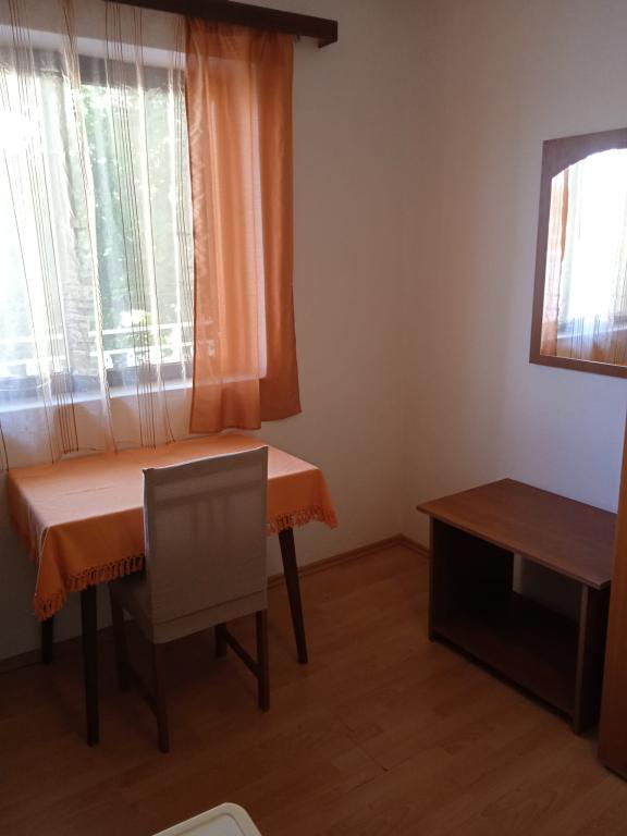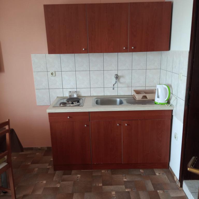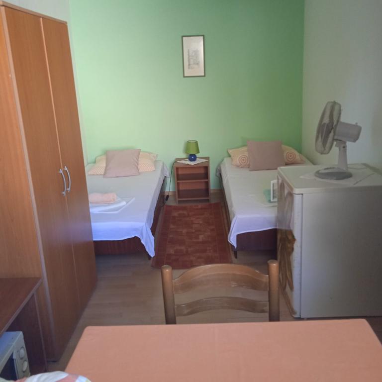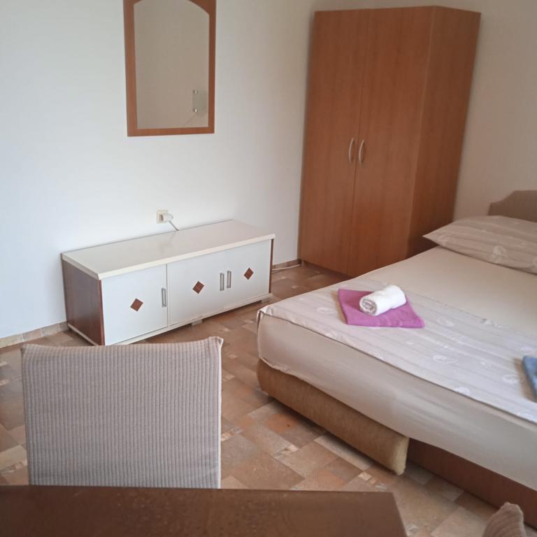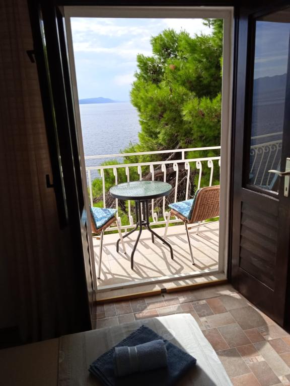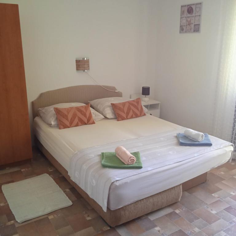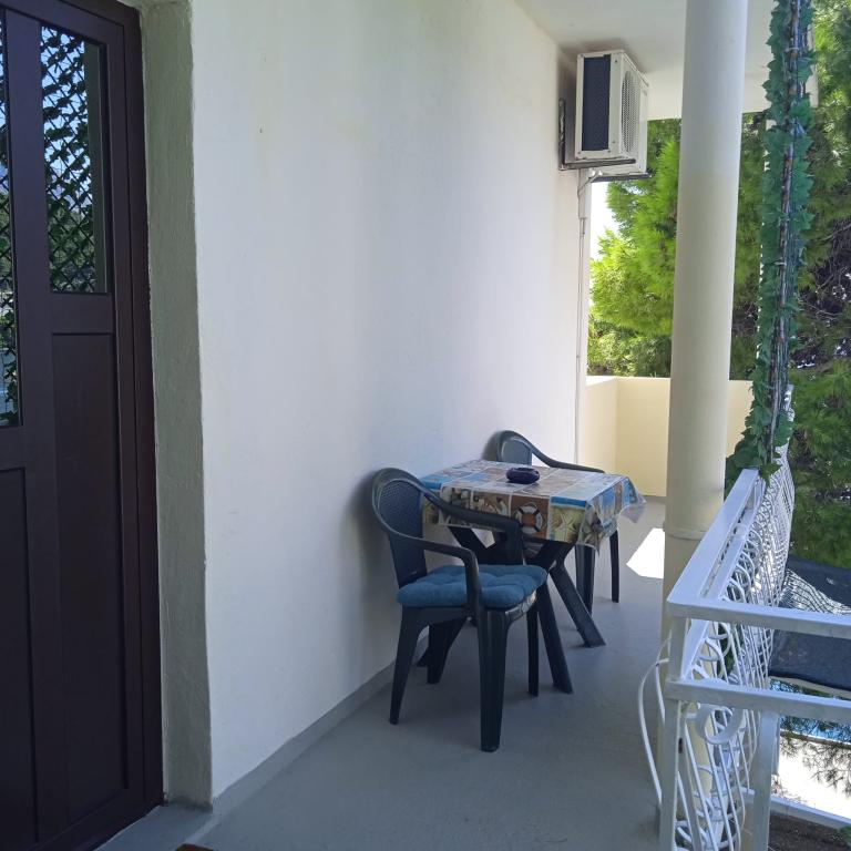 Apartament rodzinny (2+2) dla czterech osób znajduje się w domu położonym w pierwszym rzędzie od morza. Mieszkanie znajduje się na drugim piętrze i posiada osobne wejście, co zapewnia prywatność. Widok na morze roztacza się z balkonu i tarasu, które prowadzą do apartamentu. Możliwość parkowania wzdłuż drogi przed domem, w którym znajduje się apartament. (Wliczone w cenę noclegu.) Apartament składa się z dwóch niezależnych pokoi i łazienki. Aneks kuchenny znajduje się w większym pomieszczeniu (z balkonem) i jest wyposażony w naczynia oraz inne przybory kuchenne. Lodówka znajduje się również w drugim pomieszczeniu. Apartament wyposażony jest w klimatyzację i telewizor. Dostępna jest sieć Wi-Fi. Nie ma żadnych dodatkowych kosztów. Apartament odpowiedni jest dla rodziny z dwójką dzieci lub dwóch par.