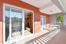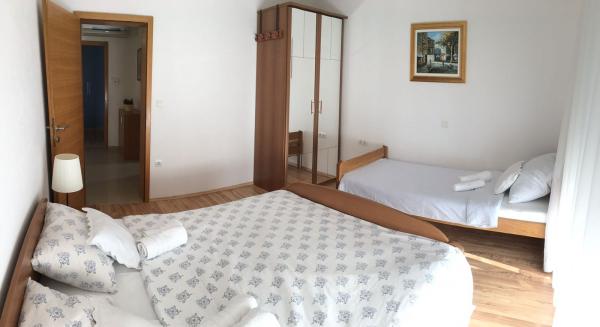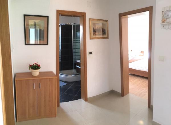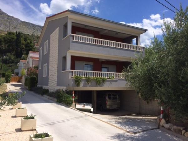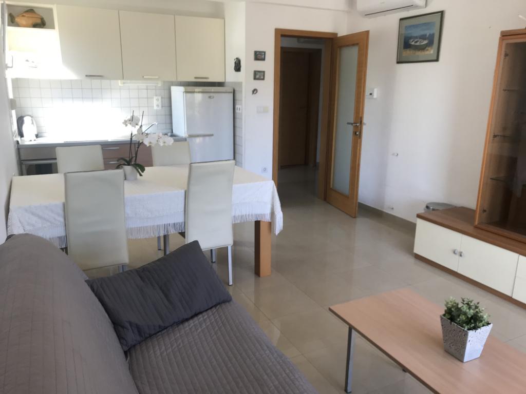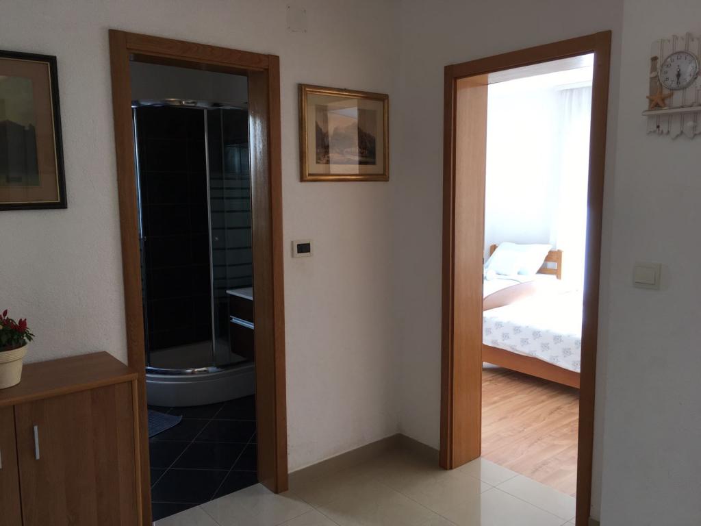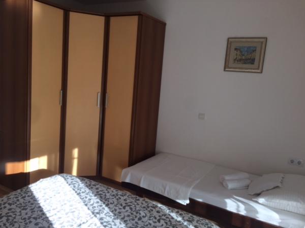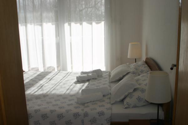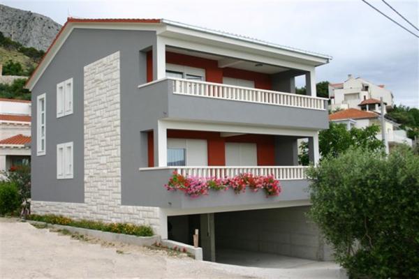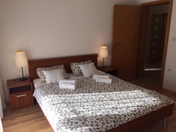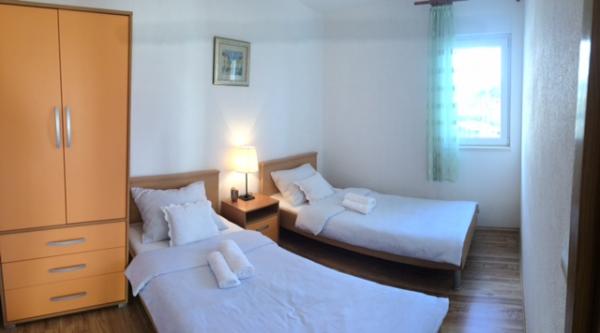 W domu znajdują się dwa mieszkania o powierzchni 75 metrów kwadratowych. Każdy apartament posiada dwie sypialnie, jeden pokój ma dwa łóżka, a drugi trzy łóżka. W przestronnej kuchni z salonem istnieje możliwość noclegu dla dwóch osób na kanapie. W korytarzu znajduje się łazienka z WC i WC. Oba apartamenty posiadają przestronny balkon z widokiem na morze. Na parterze garaże samochodowe. Aby dotrzeć do plaży oddalonej od domu o 150 metrów, należy przejść przez ulicę. W niewielkiej odległości jest do wyboru kilka rodzajów plaż i głębokość morza. Odpowiedni dla dzieci. Na plaży oprócz kąpieli i opalania można wybierać spośród wielu dodatkowych form rozrywki. Odległość do kiosku z chlebem to 50 metrów, sklepów 200 metrów, aw sąsiedztwie kilka rodzajów restauracji.