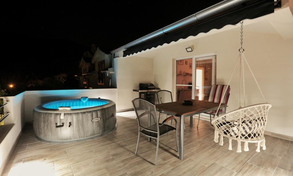 Apartament Tugare znajduje się na pierwszym piętrze domu rodzinnego, w cichej okolicy, zaledwie 6 km od miasta Omiš i 20 km od miasta Split. W bezpośrednim sąsiedztwie znajduje się piękny kanion rzeki Cetina, góry Mosor i Biokovo, a także niezliczone plaże i zatoki z krystalicznie czystym morzem. Mieszkanie jest w pełni wyposażone na pobyt rodzinny, składa się z dwóch pokoi, antresoli z dużą dostawką, przestronnej łazienki, dużego salonu, małego i dużego tarasu z grillem gazowym i wanną z hydromasażem. Dla naszych gości udostępniamy zamykany parking oraz możliwość korzystania z grilla na świeżym powietrzu.