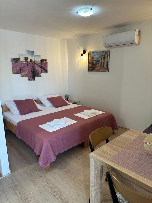 Dom wakacyjny, pierwszy rząd do morza. W domu znajdują się dwa apartamenty typu studio z łóżkiem podwójnym i dodatkowym łóżkiem. Maksymalna ilość osób 4 osoby dorosłe + 2 dzieci. Górne Studio posiada balkon z pięknym otwartym widokiem na morze. Dolne Studio posiada taras o powierzchni 25 m2 ze stołem jadalnym i pięknym widokiem na morze. Oba apartamenty posiadają własną mini kuchnię i łazienkę z toaletą. Bezpłatny internet dostępny w całym obiekcie. Darmowy parking. Dom jest wynajmowany w całości, a gość ma pełną prywatność. Właściciel mieszka w pobliżu.
