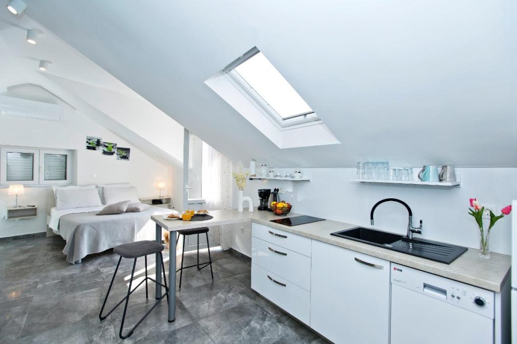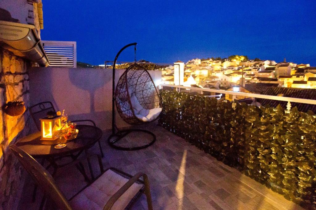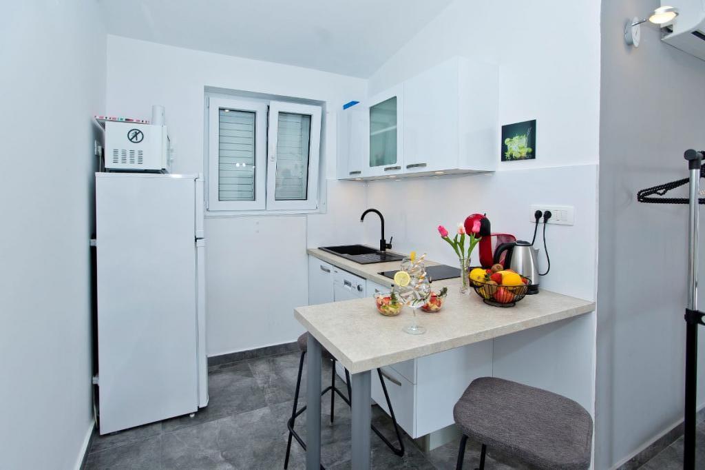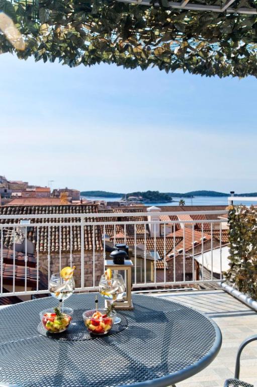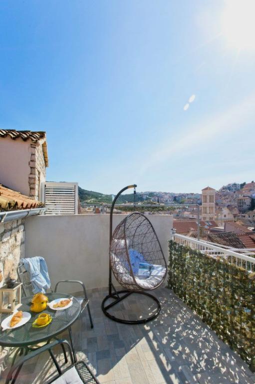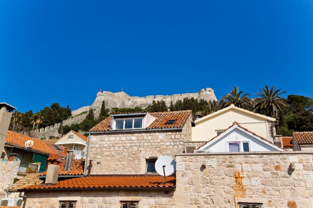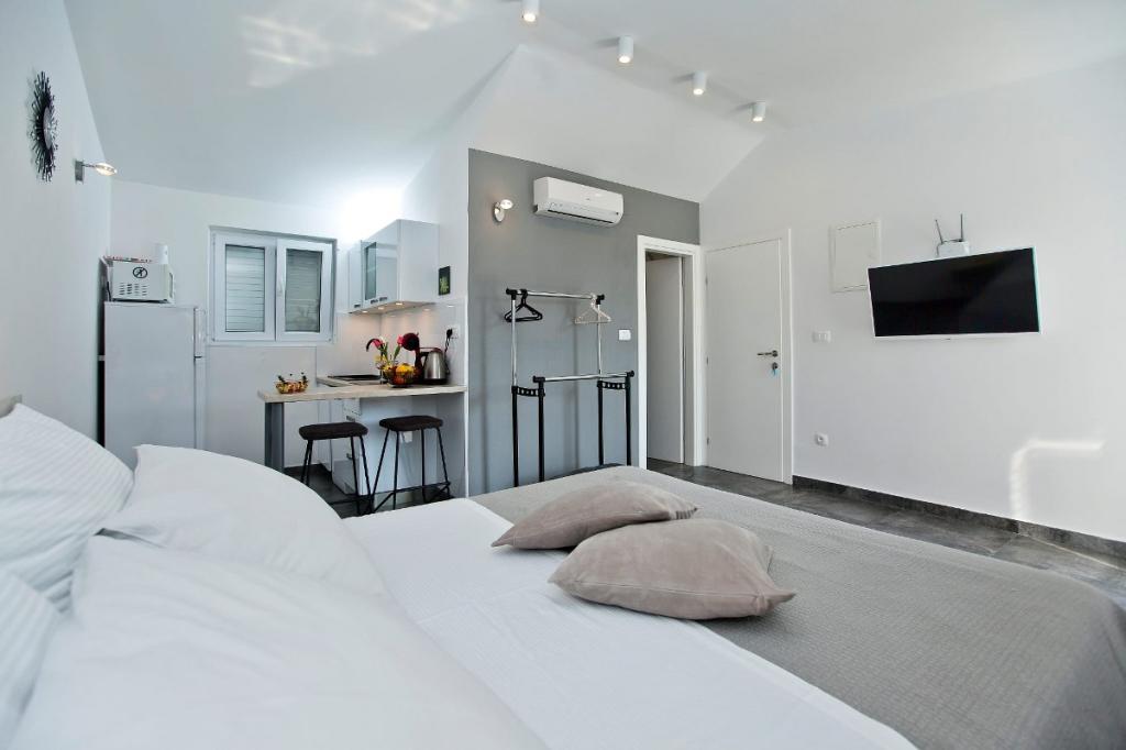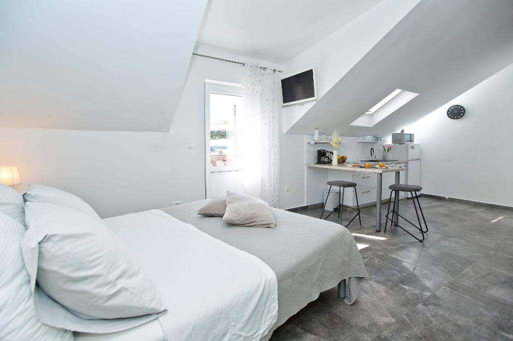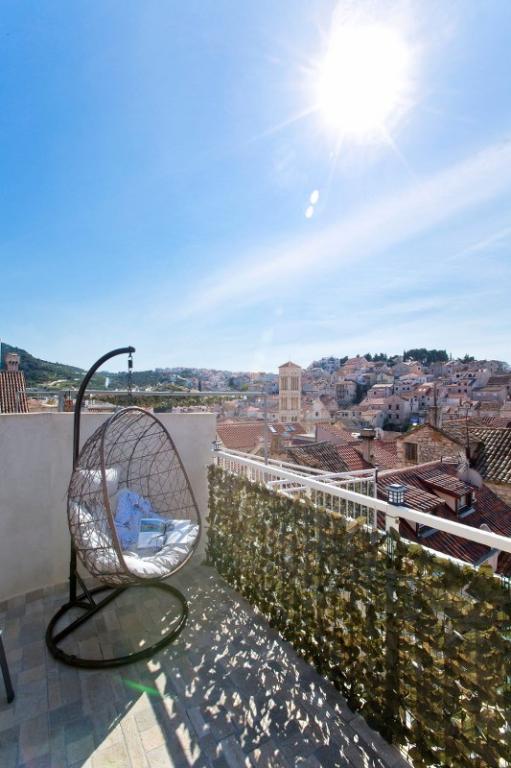 Elegancko urządzone apartamenty typu studio, położone w samym sercu Hvaru, oferują idealne połączenie komfortu i doskonałej lokalizacji. Jasne i nowoczesne apartamenty wyposażone są w wygodne łóżko podwójne (160 × 200), w pełni wyposażoną kuchnię ze wszystkimi niezbędnymi udogodnieniami (lodówka z zamrażarką, czajnik, toster, płyta grzewcza, kuchenka mikrofalowa, zmywarka), łazienki z kabiną prysznicową, klimatyzację oraz prywatne tarasy (stół, krzesła i leżaki ogrodowe) z hipnotyzującym widokiem na starówkę i piękny port Hvar. Odkryj to, co najlepsze w Hvarze, dosłownie na wyciągnięcie ręki: urocze kawiarnie, znakomite restauracje, przytulne śniadaniownie, lokalne butiki i sklepy z pamiątkami. Główny plac miasta z katedrą św. Szczepana i najstarszym teatrem publicznym w Europie znajduje się zaledwie 3 minuty spacerem od Twoich drzwi. Zatrzymasz się w samym centrum Hvaru, a jednocześnie przy idealnie zacisznej ulicy, która zapewni Ci spokojny i przyjemny sen.