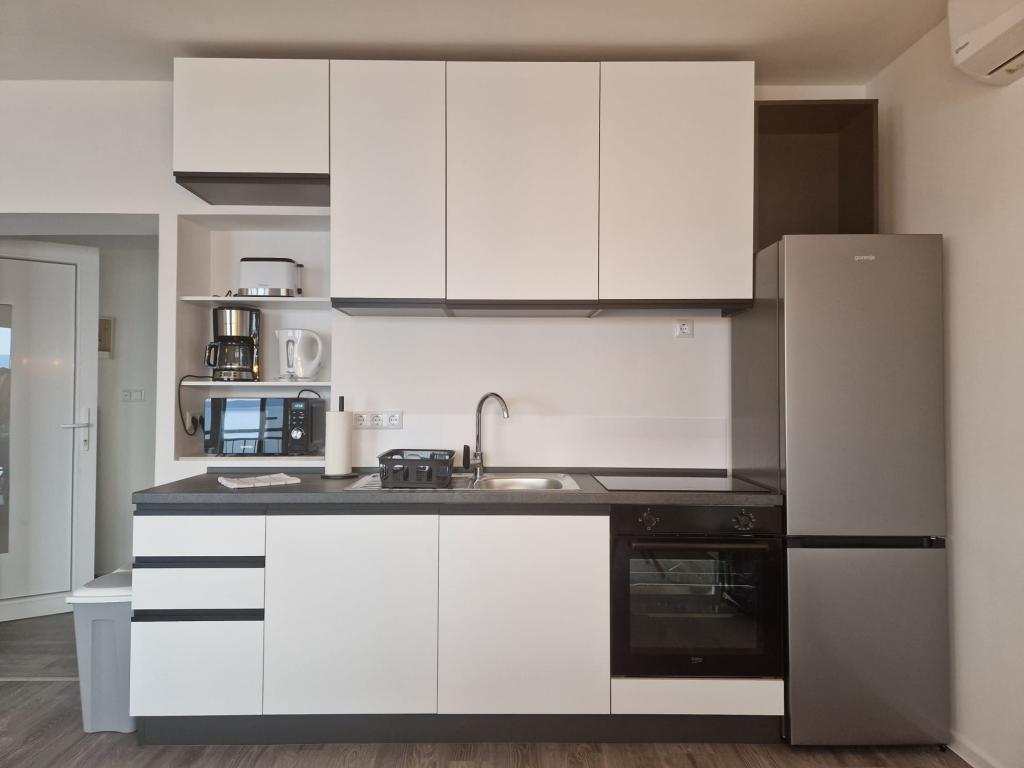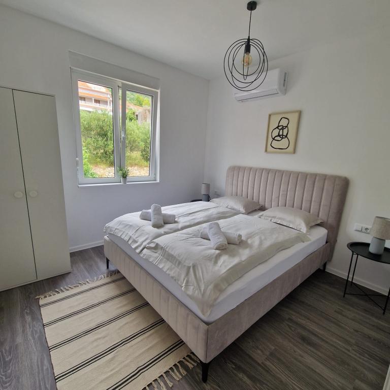 Apartament Buba (85m²) posiada 3 sypialnie z podwójnymi łóżkami, szafą i klimatyzacją, łazienkę z pralką, pokój dzienny z jadalnią, kuchnię z lodówką, piekarnikiem, zmywarką, ekspresem do kawy, kuchenką mikrofalową, czajnikiem oraz balkon z bezpośrednim widokiem na morze. Przed domem znajdują się 2 bezpłatne miejsca parkingowe.