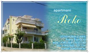 Apartamenty Roko położone są w bardzo spokojnej i przyjemnej okolicy, w otoczeniu zieleni, w zachodniej części Kaštel Lukšić. Najbliższa plaża znajduje się zaledwie 100 metrów od obiektu. Każdy apartament posiada strzeżone miejsce parkingowe w naturalnym odcieniu poniżej czaszy. Na dziedzińcu obiektu znajdują się udogodnienia dla dzieci (trampolina, huśtawki ...) i miejsce do siedzenia, odpoczynek, grill. , Wszystkie apartamenty są w pełni wyposażone w naczynia, ręczniki, pościel i wszystkie artykuły niezbędne do długiego pobytu