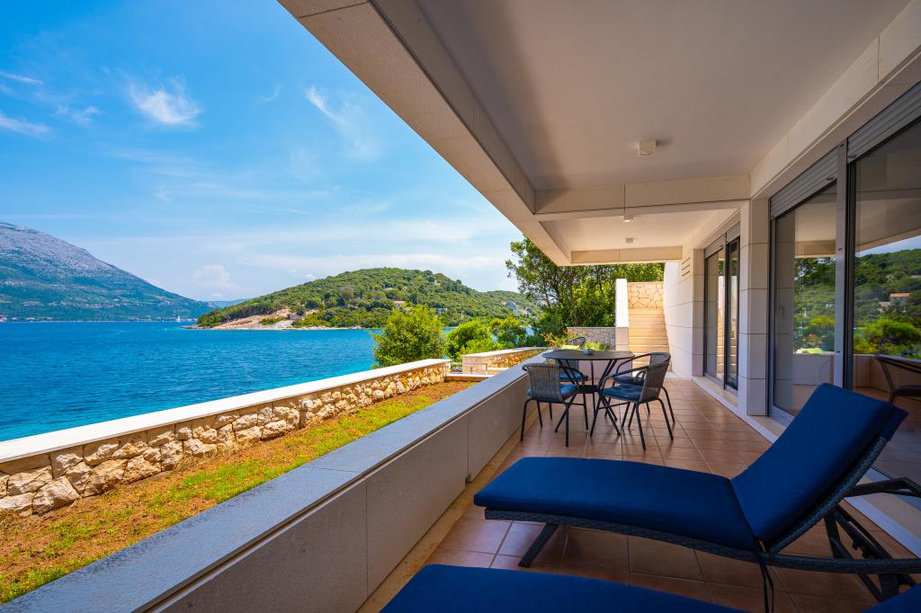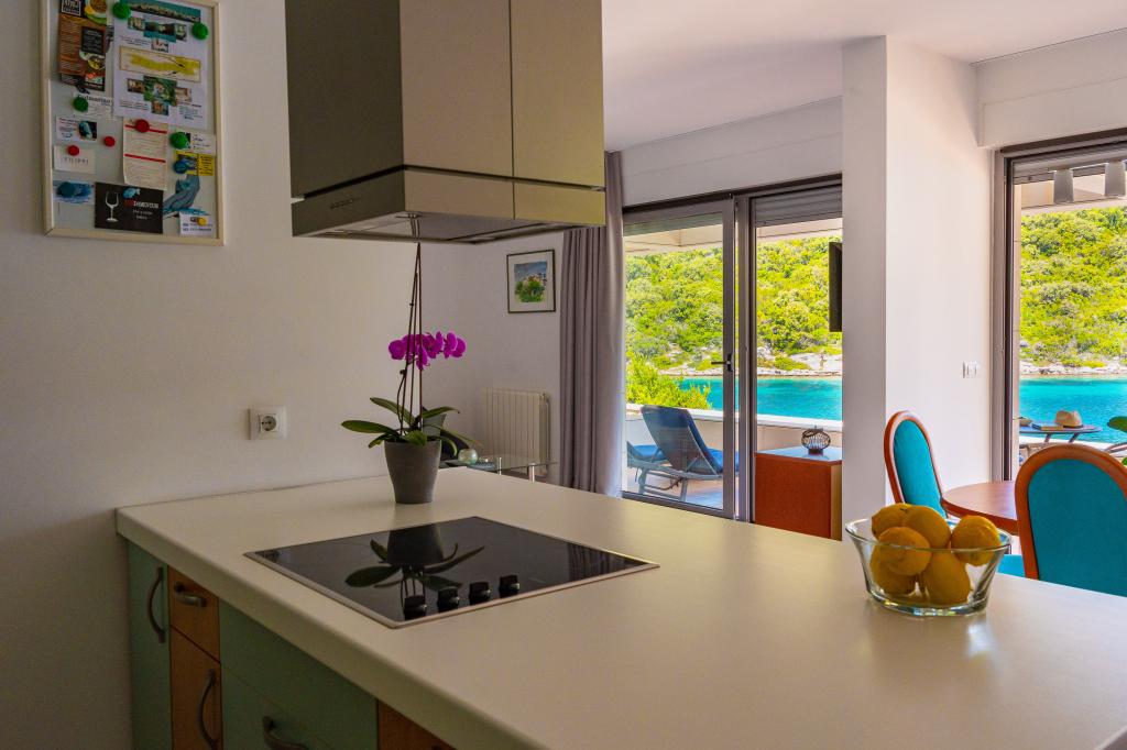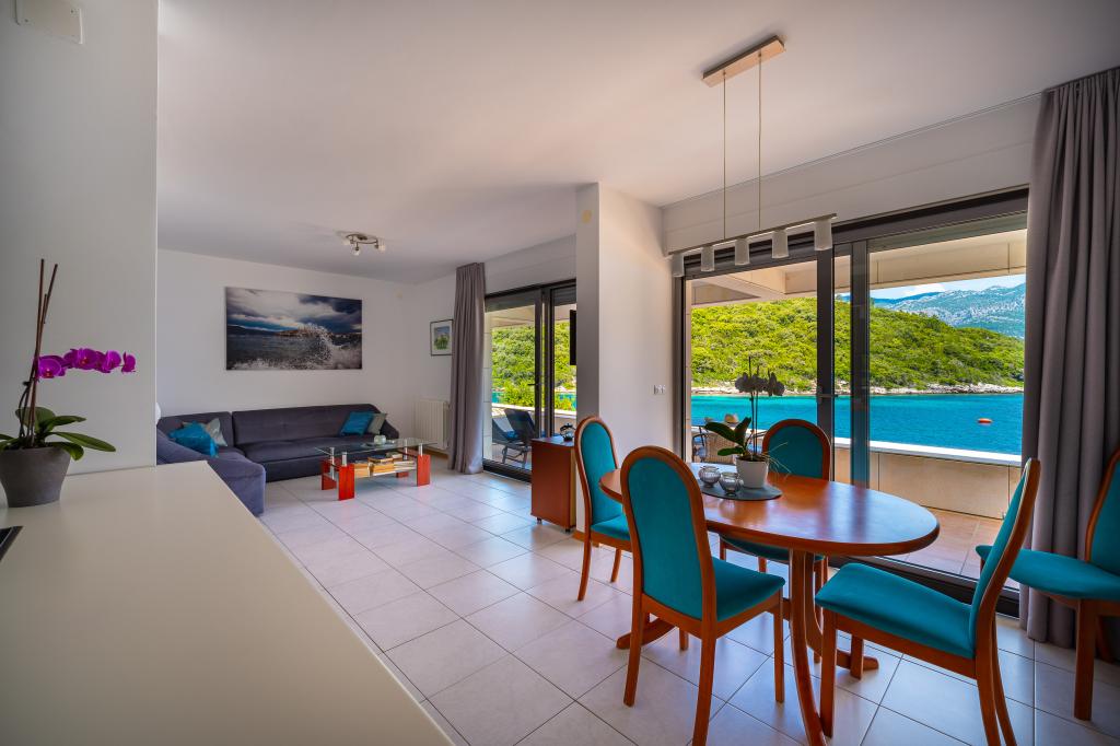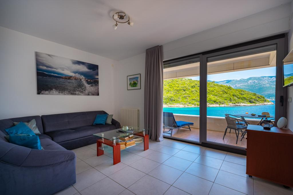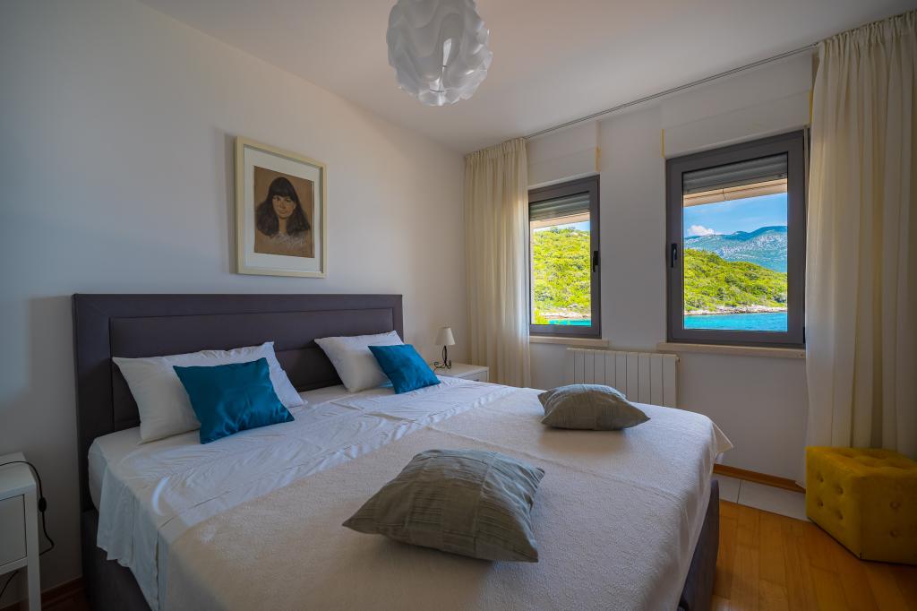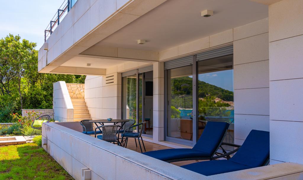 Villa Avantgarde - apartament bezpośrednio nad morzem dla 4 osób - bardzo cicha zatoka - wyspa Korčula - Chorwacja Jest dziełem znanego chorwackiego i światowej sławy architekta. Położony jest w spokojnej zatoce, ok. 4 km od centrum miasta. W willi mają Państwo do dyspozycji komfortowe mieszkanie o powierzchni ok. 100 m2, na który składają się 2 sypialnie, łazienka oraz salon z dobrze wyposażoną kuchnią, jadalnią i salonem, z którego jest wyjście na przestronny taras z bezpośrednim wyjściem na prywatną plażę. Plaża znajduje się 9 m od apartamentu. W Willi jest tylko jedno mieszkanie do wynajęcia. Jest otoczony zadbanymi trawnikami, zielenią, śpiewem ptaków i morzem. Do dyspozycji gości jest zamknięty prywatny parking. Sypialnia, pokój dzienny, jadalnia i taras wychodzą bezpośrednio na morze. Można z niego korzystać przez cały rok, gdyż wyposażony jest w centralne ogrzewanie.