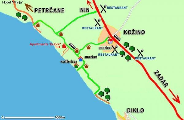 Dom Buljan znajduje się w Kožino, niedaleko Zadaru. To jest około 100 metrów od morza i plaży. Kožino to miejsce na północny zachód od Zadaru, w odległości zaledwie 6 km, między Diklo i Petrčane, idealne na spokojny i przyjemny rodzinny wypoczynek. Dom ma pięć jednostek zakwaterowania (apartamentów). Wokół domu jest ogród z dwoma tarasami ogrodowymi, grillem i 5 miejscami parkingowymi. Plaża jest kamienista i brukowana, a morze jest czyste i czyste. Środowisko jest bogate w miejsca, które musisz odwiedzić: Stare Miasto w Zadarze; Organy morskie; Pozdrowienia dla Słońca; parki narodowe: Kornati, Krka, Paklenica, Plitvice; Miasta: Zadar, Split, Trogir, Szybenik, Biograd, Nin; Jaskinie Cerovac; Rzeki: Zrmanja, Krka, Gacka; Działania: wędkarstwo, żeglarstwo, nurkowanie, jazda konna, jazda na rowerze, rafting, wspinaczka, ....