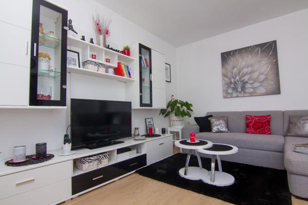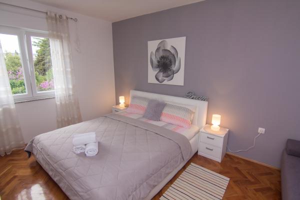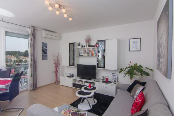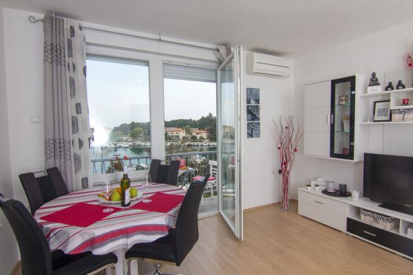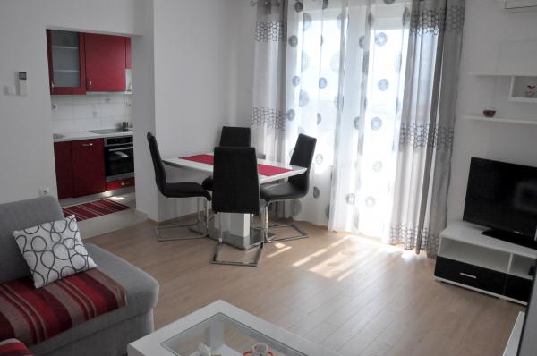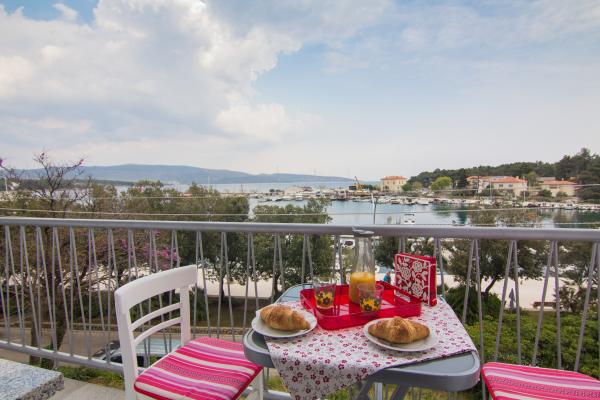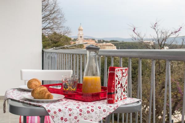 Nowy i nowoczesny apartament w centrum miasta, na drugim piętrze budynku, w odległości zaledwie 20 metrów od morza. Z balkonu roztacza się wspaniały widok na katedrę Krk, promenady i przystani portu. Bezpłatny dostęp do Internetu oraz parking. Restauracje, sklepy, targ rybny, rynek, bank, apteka i stacja benzynowa znajduje się zaledwie 100 metrów od plaży i 200 metrów.
