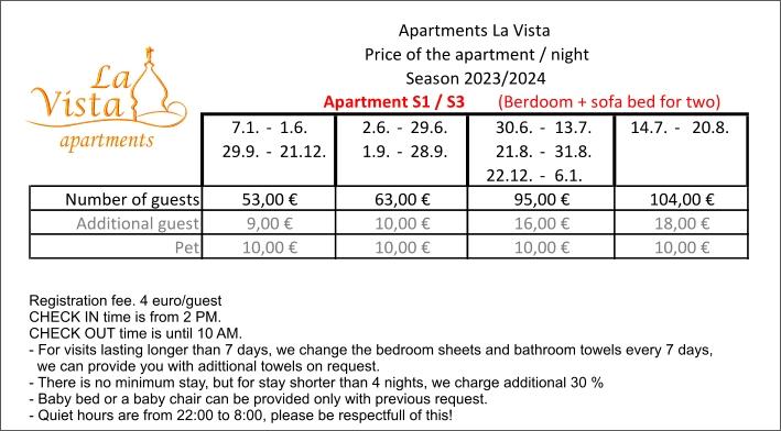 Czytaj więcej KwaterWszelkie zapytania i rezerwacje prosimy kierować na adres e-mail. Rejestracja gości - 4,00 EUR / od osoby. Podatek ekologiczny - 0,15 EUR osoba/dzień, dzieci do 12 lat nie płacą podatku ekologicznego. Dla gości przebywających krócej niż 4 noce cena noclegu wzrasta o 30%. Sprzątanie końcowe apartamentu i podatek pobytowy (turystyczny) są wliczone w cenę zakwaterowania.