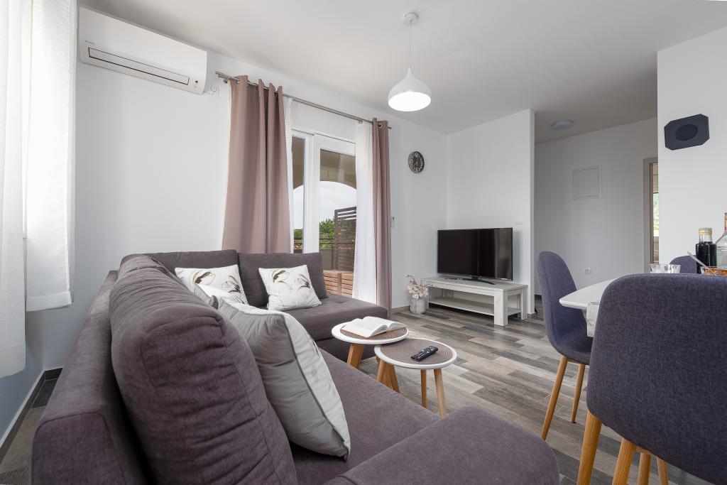 Apartamenty znajdują się w spokojnej miejscowości Ljubač, 16 km od Zadaru. Są 150 m od pierwszej plaży. W pobliżu znajdują się również inne plaże. Apartament jest 2+2, czyli 4 osobowy - pokój z łóżkiem małżeńskim plus dostawka - rozkładana sofa. W razie potrzeby dostępne jest również łóżeczko dziecięce. Powierzchnia mieszkania to 46m2 plus duży taras. Apartamenty są w pełni wyposażone: klimatyzacja, telewizja satelitarna, sieć WIFI, zmywarka, pralka, toster, ekspres do kawy, mikrofalówka itp. Wszystkie okna są zabezpieczone przed komarami. Z przodu znajduje się basen 8x4m o głębokości 1,5m. Dostępne miejsce parkingowe. Opłata klimatyczna wliczona w cenę!