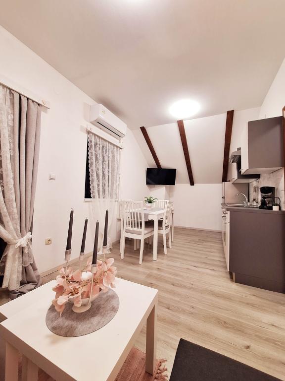 W sercu Gorskiego Kotaru, u podnóża masywu Risnjak, znajduje się zupełnie nowy, uroczy apartament „Malnar” Lokva. Mieszkanie właścicielki Vanji Malnar ma trzy gwiazdki ️️️; pojemność 2+2 i jest urządzony z dużą uwagą i miłością dla par, rodzin i wszystkich, którzy chcą odpocząć w naszej spokojnej oazie i cieszyć się udogodnieniami turystycznymi nad i pod horyzontem ️. Mieszkanie znajduje się na pierwszym piętrze, na poddaszu nowego budynku o łącznej powierzchni użytkowej netto 53,85 m2 i składa się z przedpokoju, łazienki, kuchni z jadalnią i salonem, jednej sypialni oraz dwóch balkonów. W kuchni z jadalnią i salonem znajduje się stół jadalny, piekarnik, płyta elektryczna, lodówka, inny sprzęt AGD, narożnik, Smart TV z bezpłatnym Wi-Fi oraz klimatyzacja. Łazienka z toaletą, umywalką i nowoczesną kabiną prysznicową z radiem. ️ W pokoju znajduje się podwójne łóżko z szafkami nocnymi, oświetleniem na osobę, klimatyzacją, a na życzenie gościa łóżeczko dziecięce. ️ Powierzchnia balkonu z meblami ogrodowymi jest przestronna i nadaje się do wypoczynku na czystym gorańskim powietrzu i słońcu. grill na świeżym powietrzu w ogrodzie - na życzenie gościa. Parking przed drzwiami wejściowymi jest strzeżony!!! ️ Jesteśmy gotowi przechować cały Twój sprzęt w garażu objętym monitoringiem. ️ W apartamencie obowiązuje zakaz palenia, a także zwierząt domowych!!! Mieszkanie jest również odpowiednie dla: spacerowiczów i turystów (szlak turystyczny wokół jeziora Lokvar, park leśny „Golubinjak”, park narodowy „Risnjak”, Bijele i Samarska stijene, Zeleni vir, Vrážji prolaz, kanion „Kamačnik” , ścieżka edukacyjna „Leska”, źródło „Kupe”...). odkrywcy pod horyzontem (najgłębsza jaskinia w Chorwacji udostępniona do zwiedzania – Jaskinia „Lokvarka”). Rowerzyści (Ścieżka rowerowa wokół jeziora Lokvar...). Saneczkarze (Centrum saneczkarskie