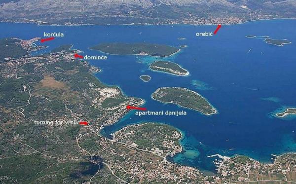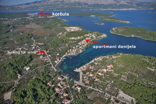 Apartamenty Daniela znajduje się w najpiękniejszej zatoce dobrze renomowanych miejscowości Lumbarda. Położony na zachodnim brzegu zatoki Račišće oferuje zapierający dech w piersiach widok na malownicze miejscowości kąpieli w krystalicznie czystej morem.Apartmani są otoczone śródziemnomorską roślinnością i pięknym ogrodem. W domu znajduje się basen dla gości w domu. Odległość od morza wynosi 50 m, od centrum Lumbarda 1 km od starego miasta Korcula 5 km. Jeśli zdecydujesz się spędzić wakacje z nami będziesz cieszyć się ciszą i spokojem, świeże morskie powietrze, lokalne specjały gourmand ze znanymi win i alkoholi wraz z gospodarzami, których rodziny korzenie w stuleciach, które czują atmosferę okolicy. Apartamenty Danijela składają się z 3 apartamenty (6 2 4 1 4 1), to studio-apartament (2: 1), miejsce parkingowe, do cumowania łodzi i grillem. Apartamenty Danijela oferta oraz możliwość wypożyczenia roweru, kupując cvrhunskih lokalnych win, brandy i exre oliwą z oliwek.