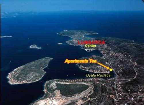 Apartamenty położone są w TEA spokojnej zatoce w Lumbarda na wyspie. Znajdują się one w pierwszym rzędzie do morza, i oferuje piękny widok na zatokę. Otoczony zieleni. Obiekt położony jest 10 minut spacerem do centrum miasta, 5-10 minut do kamienistej plaży i 30 minut spacerem do plaży. Od słynnego zabytkowego miasta Korcula obiektu znajduje się 5 km od hotelu.