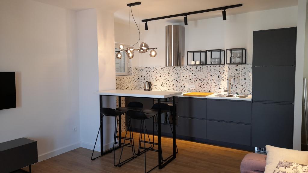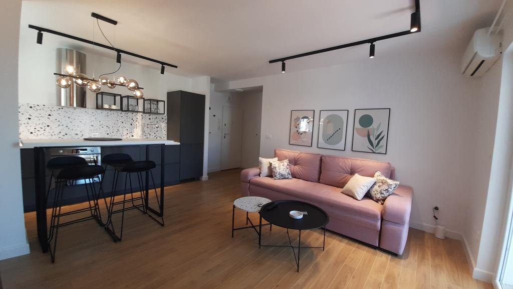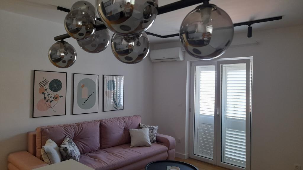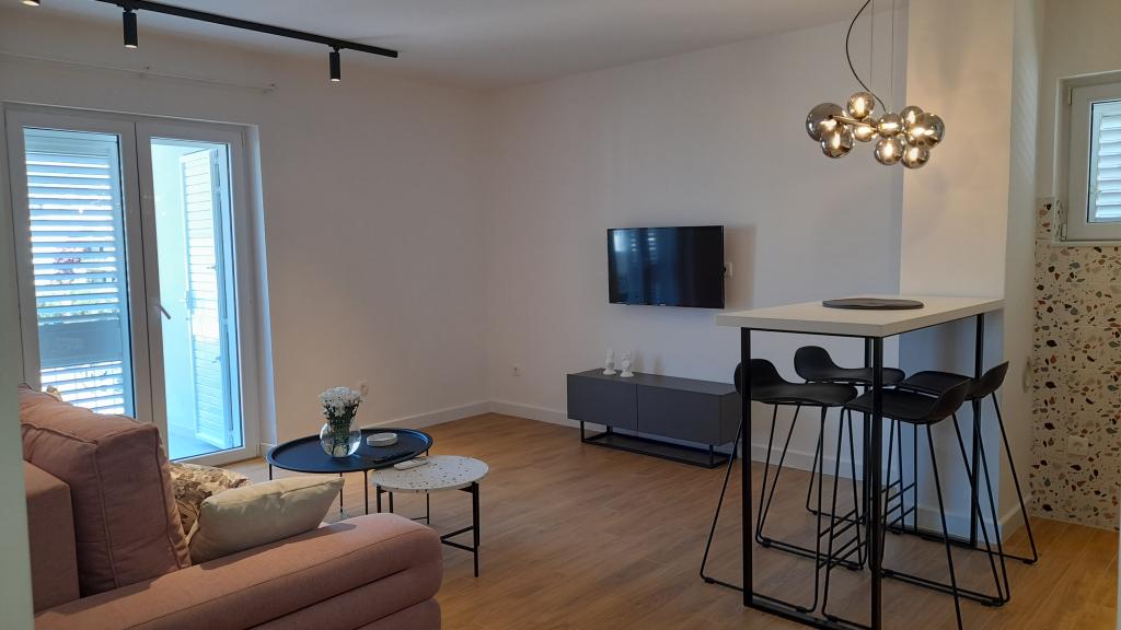 Nowoczesne mieszkanie na trzecim piętrze budynku z tarasem z widokiem na morze i górę Biokovo. Mieszkanie składa się z kuchni, salonu z jadalnią, sypialni oraz łazienki.
